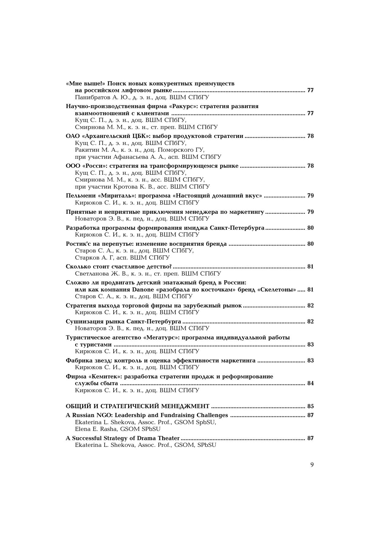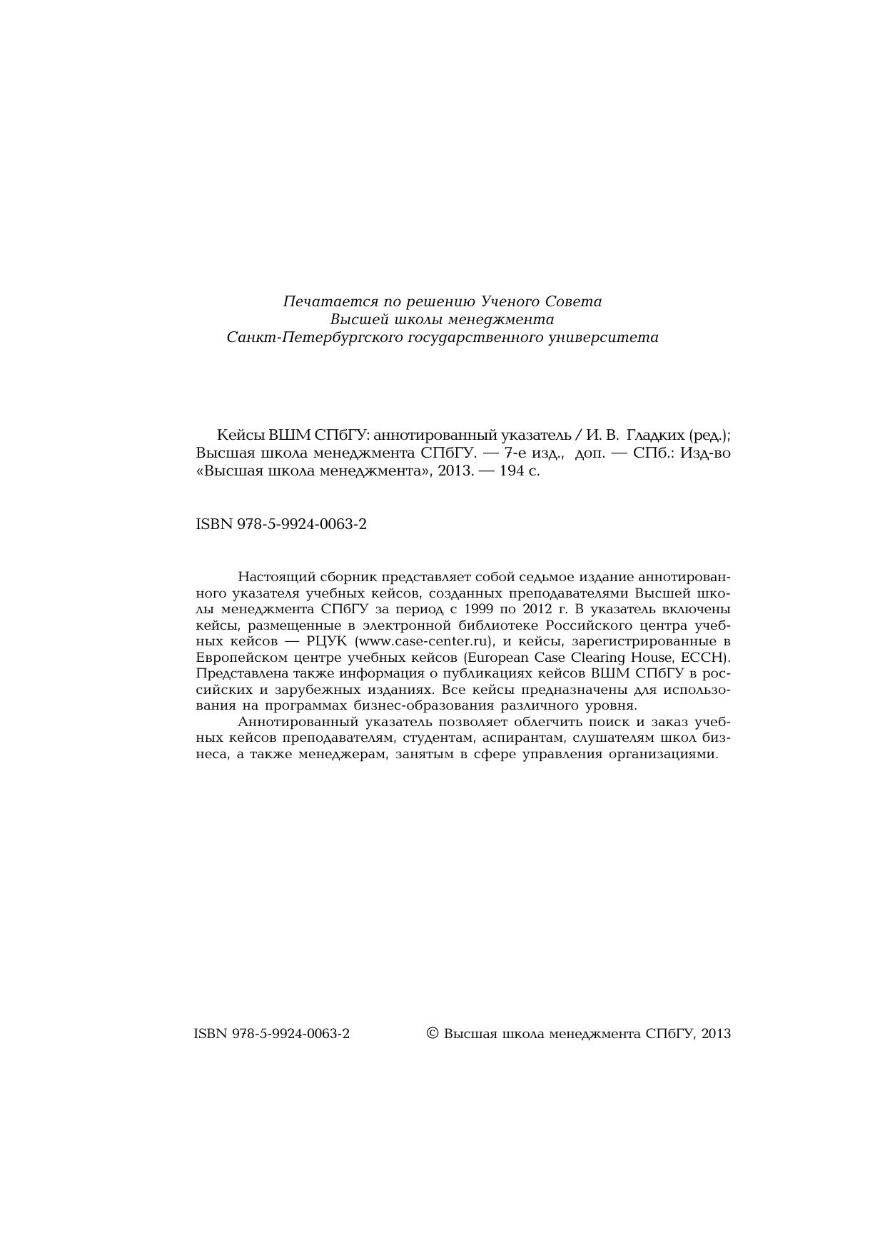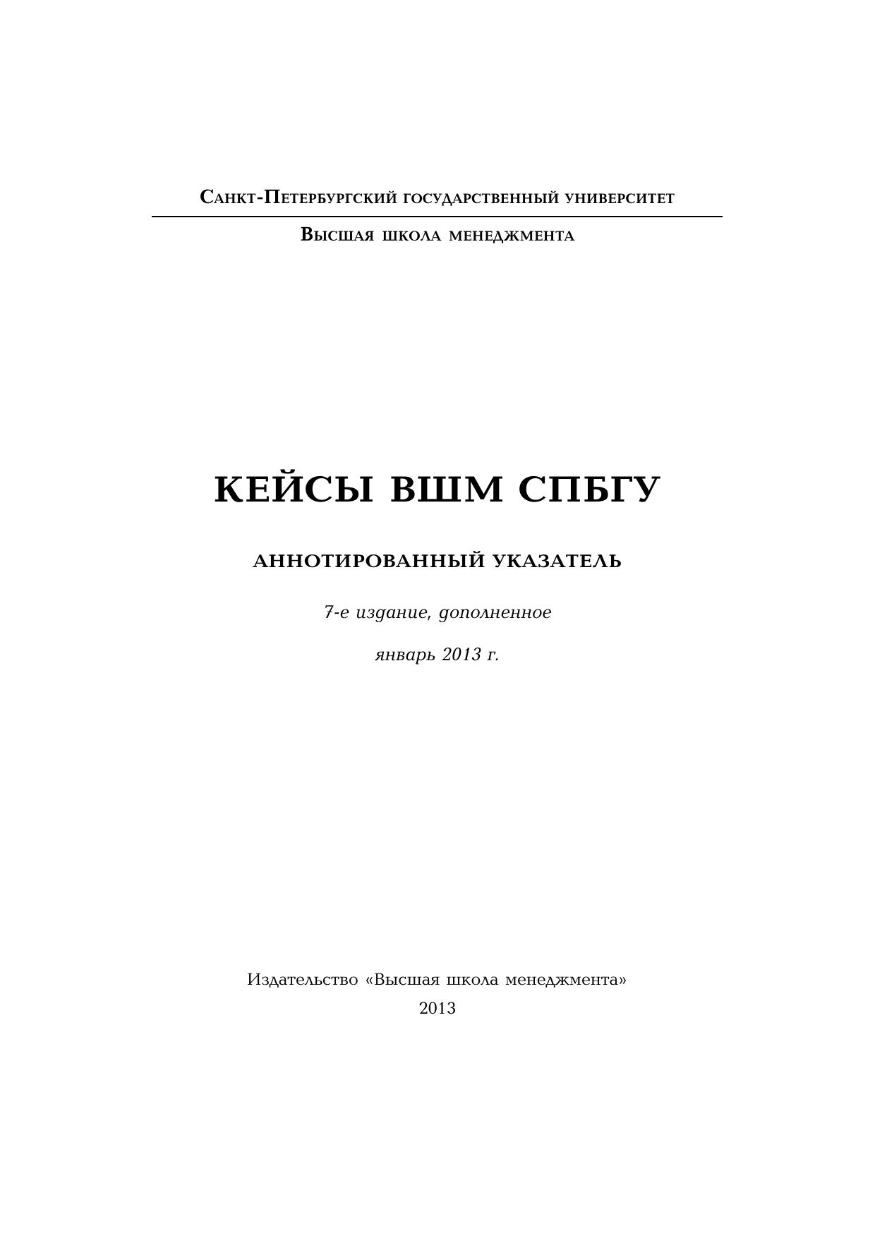 Настоящий сборник представляет собой седьмое издание аннотированного указателя учебных кейсов, созданных преподавателями Высшей школы менеджмента СПбГУ за период с 1999 по 2013 г. В указатель включены кейсы, размещенные в электронной библиотеке Российского центра учебных кейсов – РЦУК (www.case-center.ru), и кейсы, зарегистрированные в Европейском центре учебных кейсов (European Case Clearing House, ECCH). Предоставлена информация о публикациях кейсов ВШМ СПбГУ в российских и зарубежных изданиях. Кейсы предназначены для использования на программах бизнес-образования различного уровня. Аннотированный указатель позволяет облегчить поиск и заказ учебных кейсов преподавателям, студентам, аспирантам, слушателям школ бизнеса, а также менеджерам, занятым в сфере управления организациями.