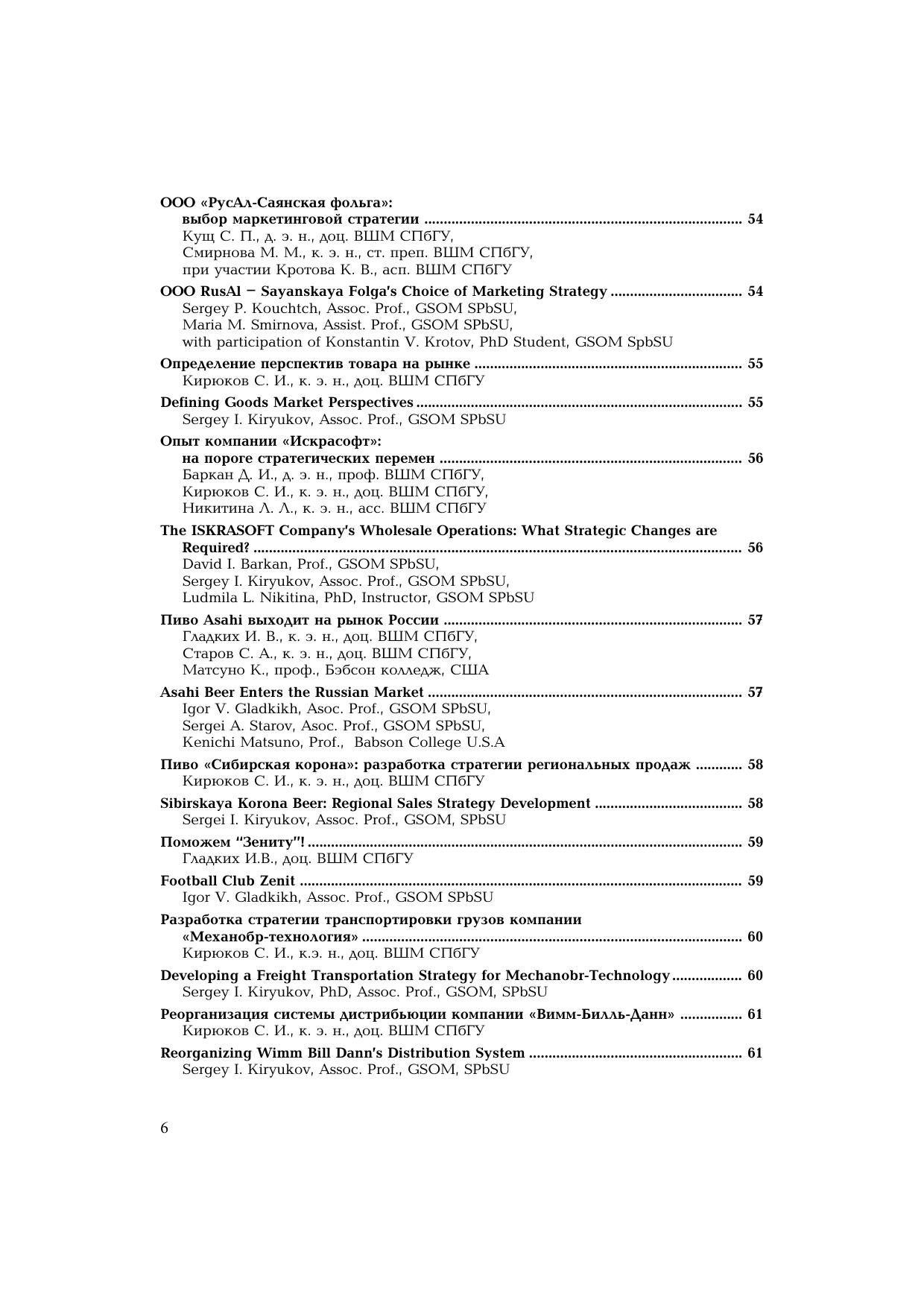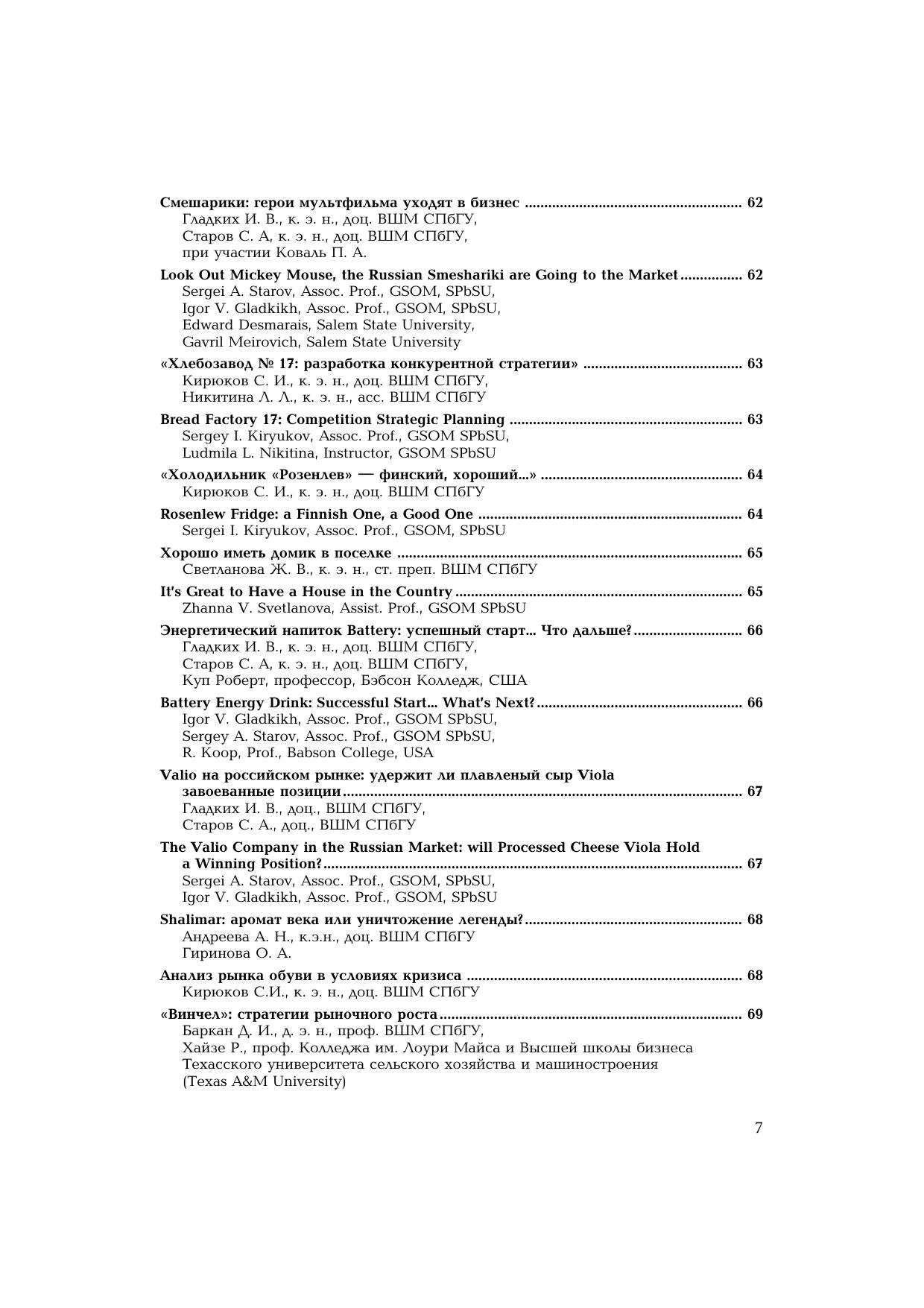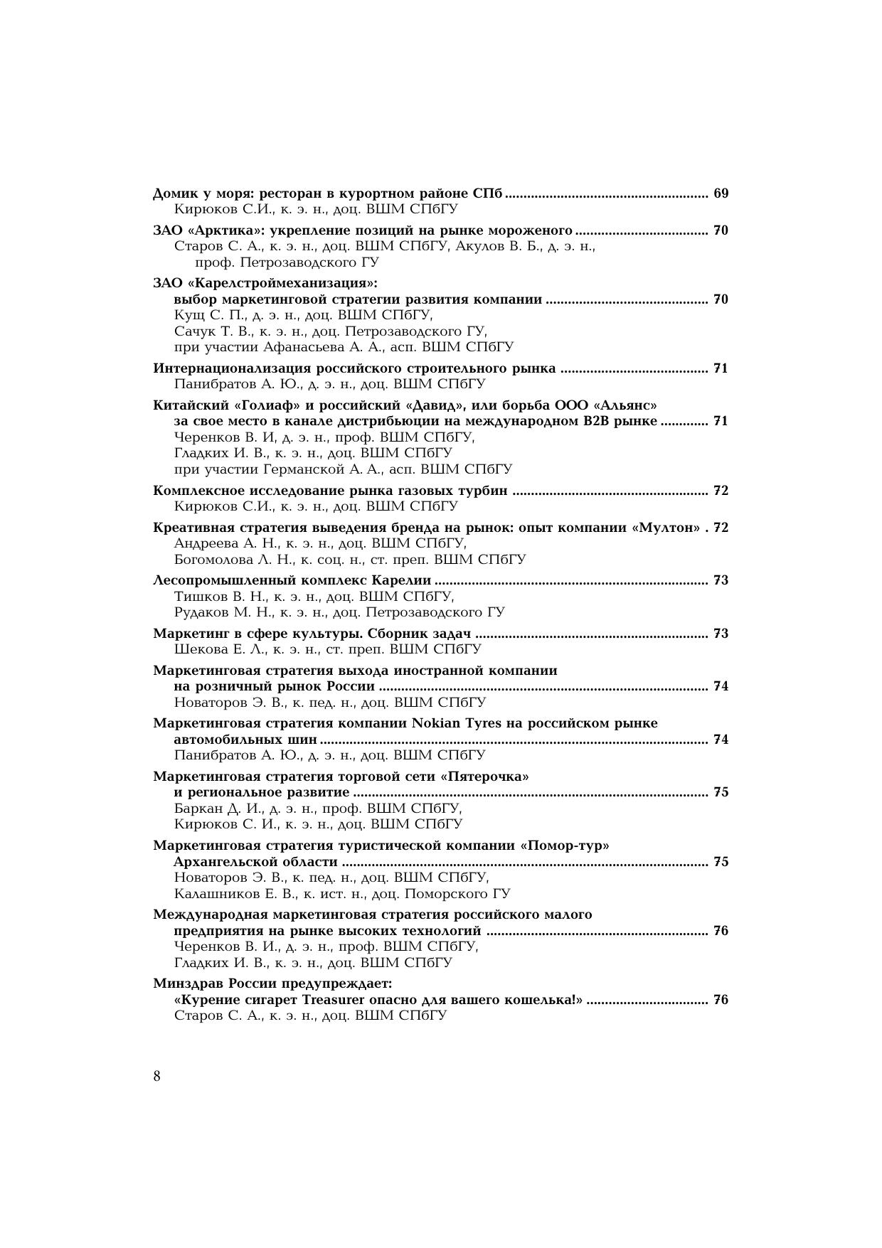 Настоящий сборник представляет собой седьмое издание аннотированного указателя учебных кейсов, созданных преподавателями Высшей школы менеджмента СПбГУ за период с 1999 по 2013 г. В указатель включены кейсы, размещенные в электронной библиотеке Российского центра учебных кейсов – РЦУК (www.case-center.ru), и кейсы, зарегистрированные в Европейском центре учебных кейсов (European Case Clearing House, ECCH). Предоставлена информация о публикациях кейсов ВШМ СПбГУ в российских и зарубежных изданиях. Кейсы предназначены для использования на программах бизнес-образования различного уровня. Аннотированный указатель позволяет облегчить поиск и заказ учебных кейсов преподавателям, студентам, аспирантам, слушателям школ бизнеса, а также менеджерам, занятым в сфере управления организациями.