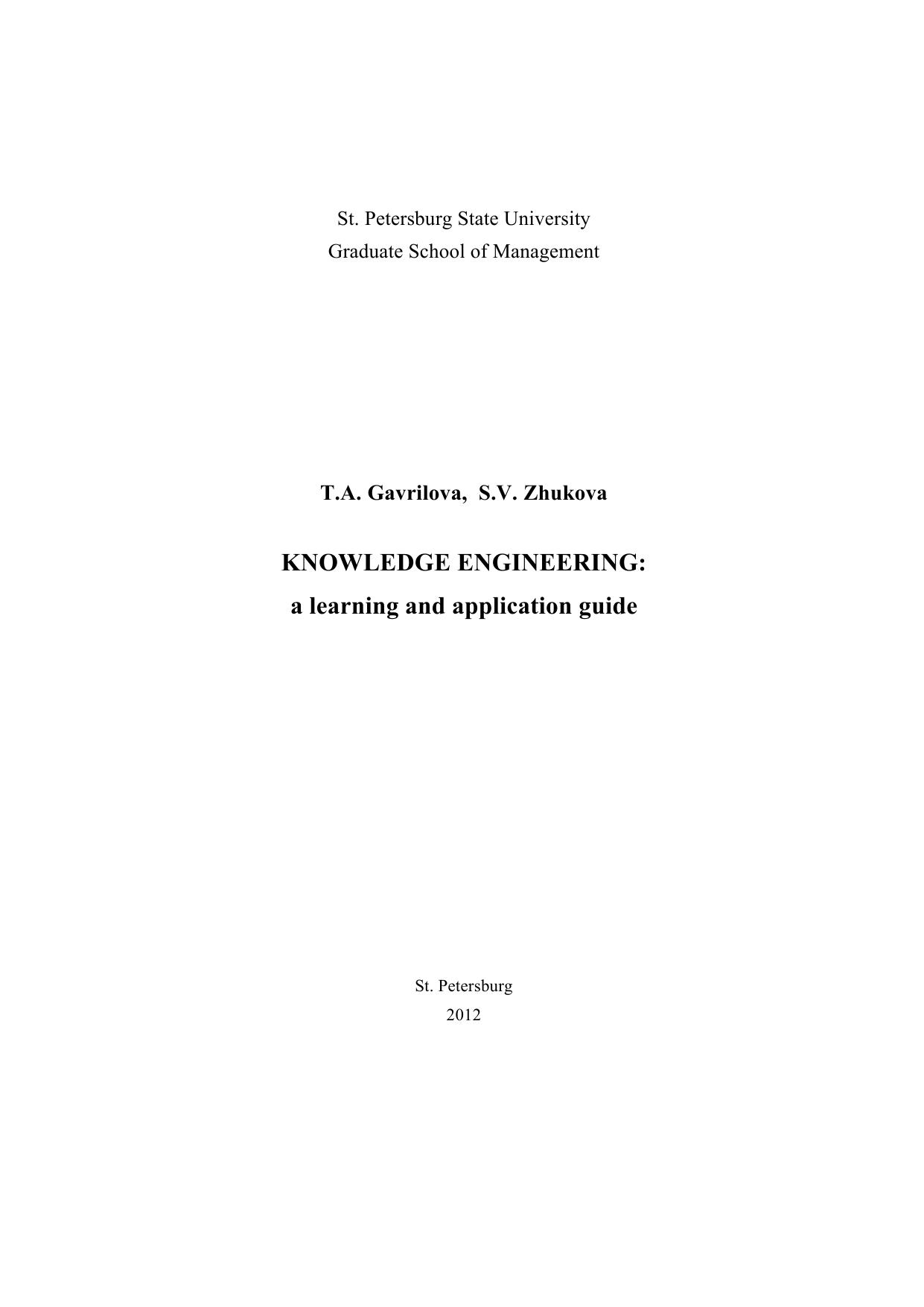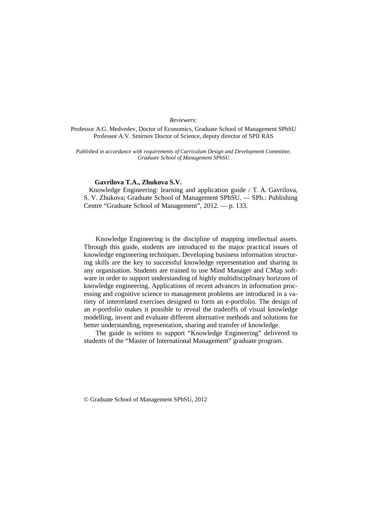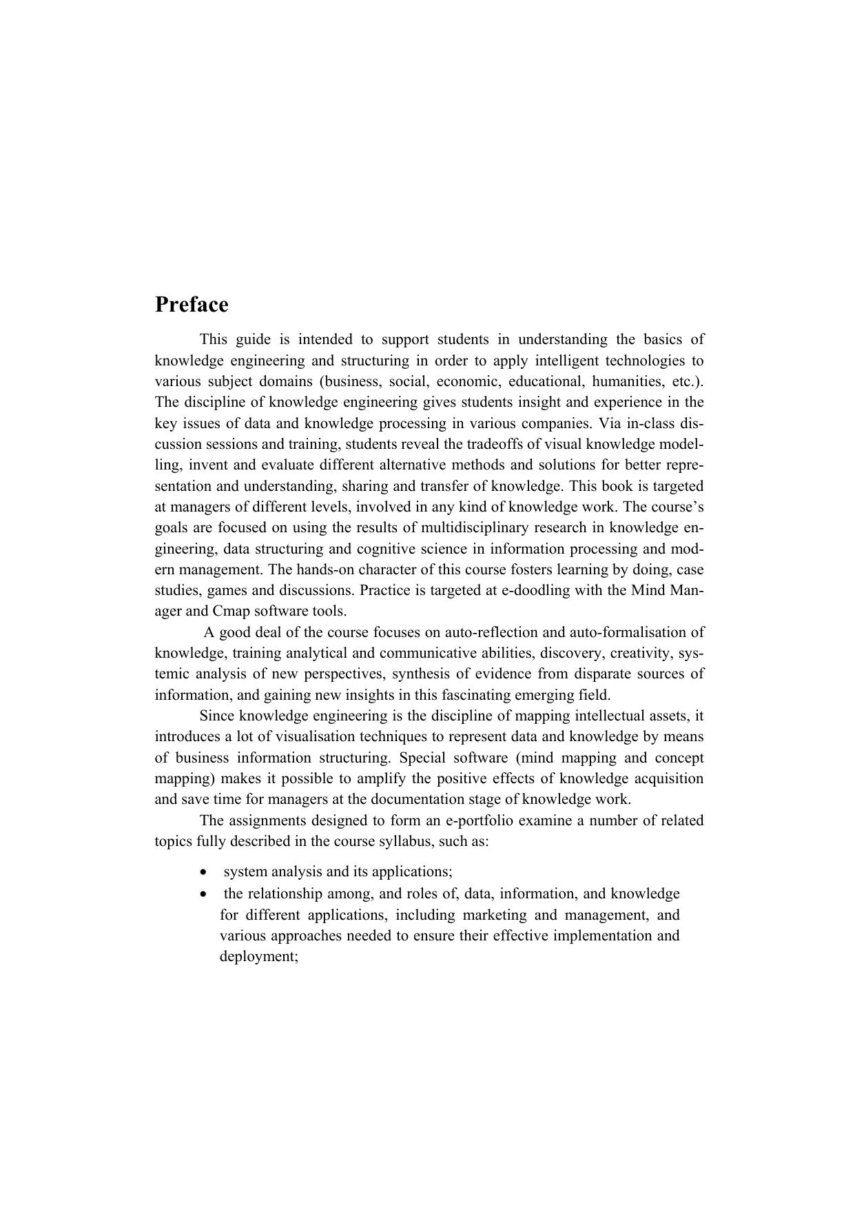 Knowledge Engineering: Learning and Application GuideKnowledge Engineering is the discipline of mapping intellectual assets. Through this guide, students are introduced to the major practical issues of knowledge engineering techniques. Developing business information structuring skills are the key to successful knowledge representation and sharing in any organisation. Students are trained to use Mind Manager and CMap software in order to support understanding of highly multidisciplinary horizons of knowledge engineering. Applications of recent advances in information processing and cognitive science to management problems are introduced in a variety of interrelated exercises designed to form an e-portfolio. The design ofan e-portfolio makes it possible to reveal the tradeoffs of visual knowledge modelling, invent and evaluate different alternative methods and solutions for better understanding, representation, sharing and transfer of knowledge. The guide is written to support “Knowledge Engineering” delivered to students of the “Master of International Management” graduate program.