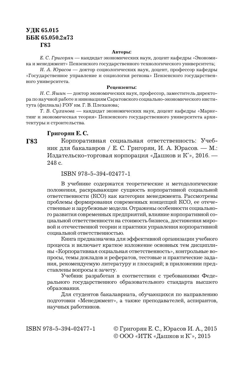 В учебнике содержатся теоретические и методологические положения, раскрывающие сущность корпоративной социальной ответственности (КСО) как категории менеджмента. Рассмотрены проблемы формирования современных концепций КСО, ее отечественные и зарубежные модели. Отражены особенности социального развития современных предприятий, влияние корпоративной социальной ответственности на стоимость бизнеса, достижения мировой и отечественной теории и практики управления корпоративной социальной ответственностью. Книга предназначена для эффективной организации учебного процесса и включает краткое изложение основных тем дисциплины «Корпоративная социальная ответственность», контрольные вопросы, темы докладов и рефератов, тестовые и практические задания, рекомендуемую литературу и глоссарий; в приложении представлены вопросы к зачету. Учебник разработан в соответствии с требованиями Федерального государственного образовательного стандарта высшего образования.