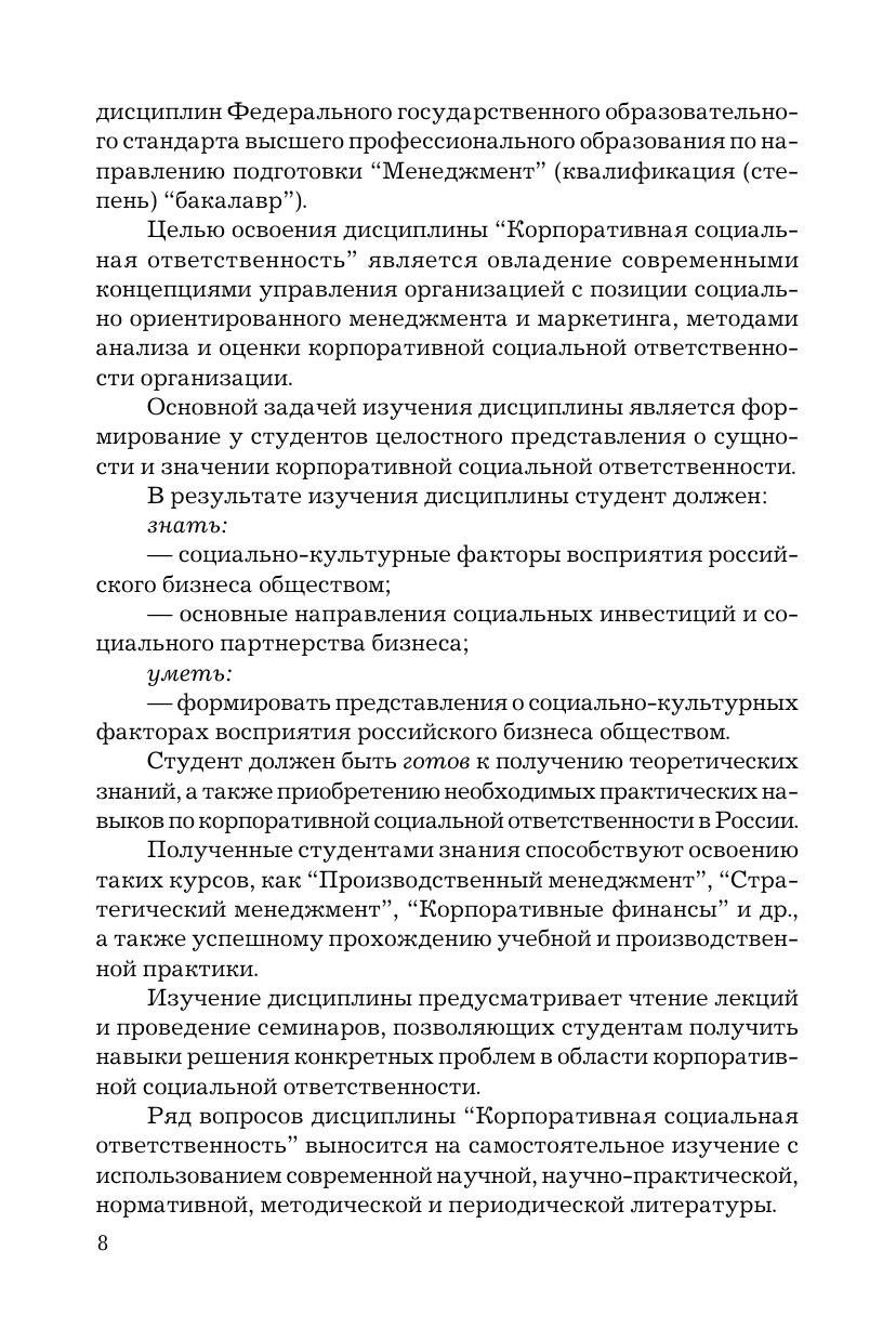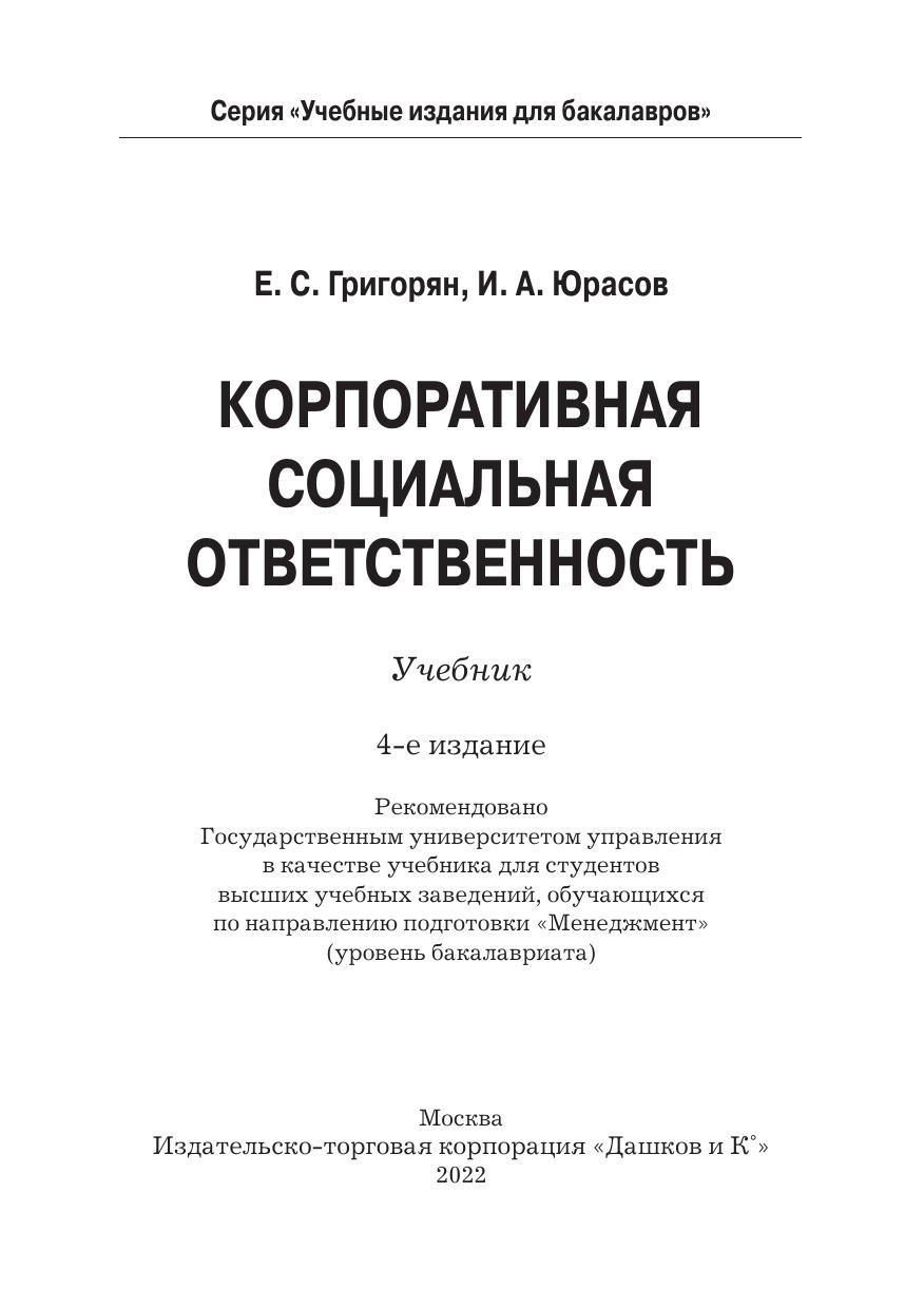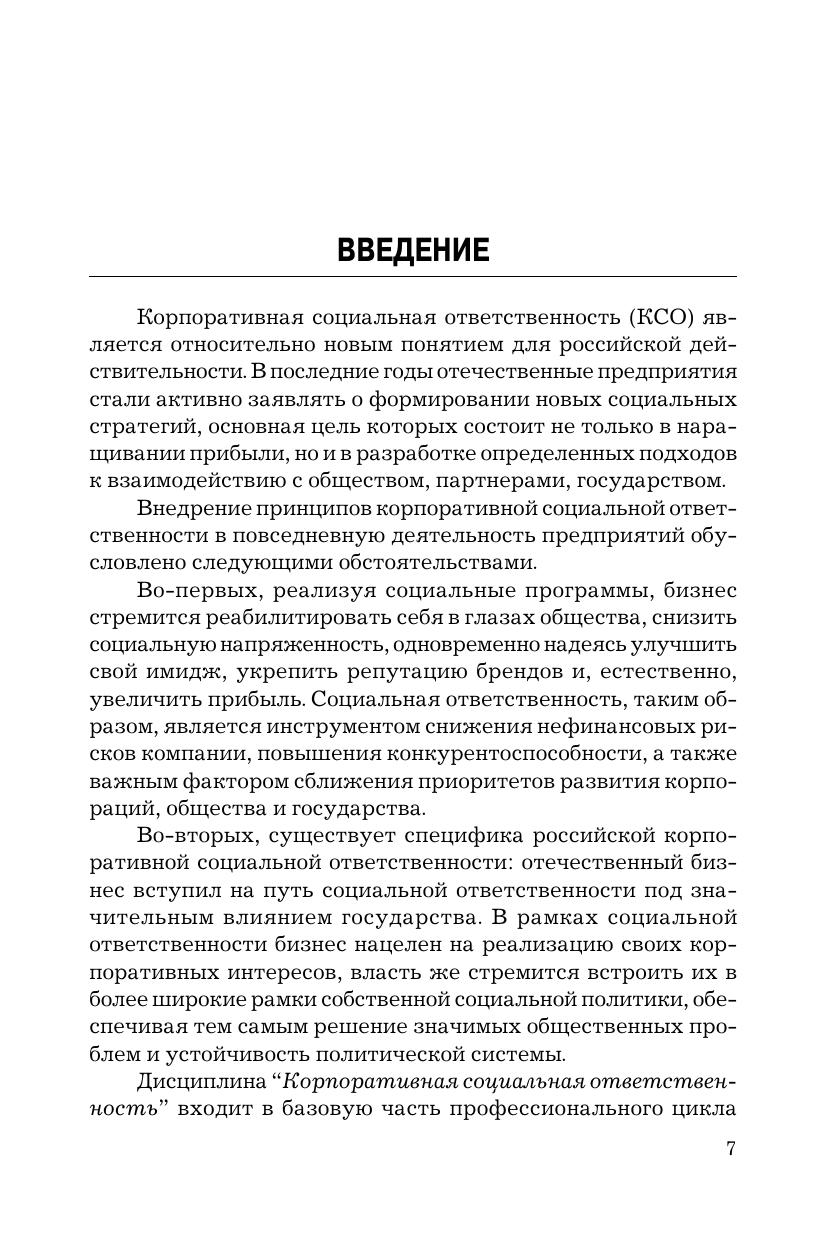 В учебнике содержатся теоретические и методологические положения, раскрывающие сущность корпоративной социальной ответственности (КСО) как категории менеджмента. Рассмотрены проблемы формирования современных концепций КСО, ее отечественные и зарубежные модели. Отражены особенности социального развития современных предприятий, влияние корпоративной социальной ответственности на стоимость бизнеса, достижения мировой и отечественной теории и практики управления корпоративной социальной ответственностью. Книга предназначена для эффективной организации учебного процесса и включает краткое изложение основных тем дисциплины «Корпоративная социальная ответственность», контрольные вопросы, темы докладов и рефератов, тестовые и практические задания, рекомендуемую литературу и глоссарий, в приложении представлены вопросы к зачету. Учебник разработан в соответствии с требованиями Федерального государственного образовательного стандарта высшего образования. Для студентов бакалавриата, обучающихся по направлению подготовки «Менеджмент», а также преподавателей, аспирантов, научных работников.