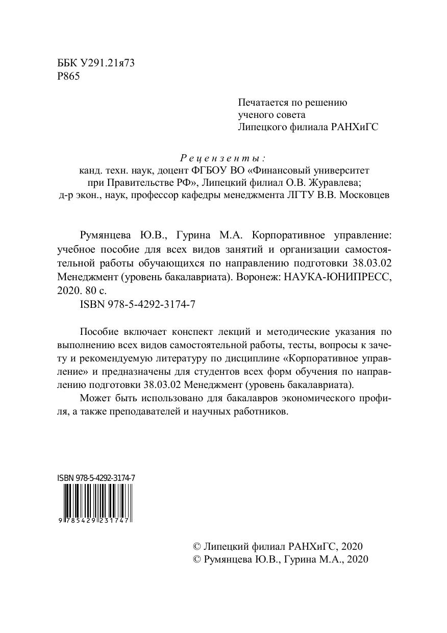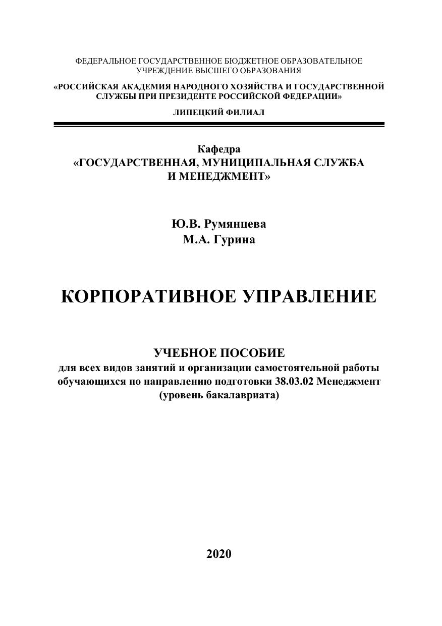 Пособие включает конспект лекций и методические указания по выполнению всех видов самостоятельной работы, тесты, вопросы к зачету и рекомендуемую литературу по дисциплине «Корпоративное управление» и предназначены для студентов всех форм обучения по направлению подготовки 38.03.02 Менеджмент (уровень бакалавриата). Может быть использовано для бакалавров экономического профиля, а также преподавателей и научных работников.