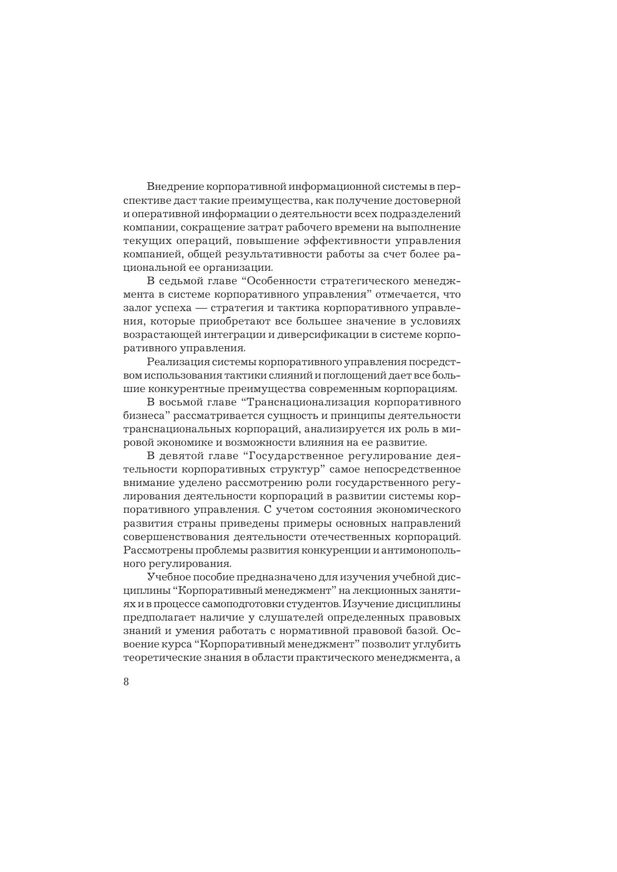В учебном пособии рассмотрены основные понятия теории корпоративного управления, позволяющие раскрыть принципы организации деятельности реально функционирующих корпоративных структур. В нем нашли отражение проблемы организационных преобразований в крупных корпоративных структурах. Авторами предложены направления анализа, позволяющие выбрать оптимальную стратегию и тактику слияний и поглощений, возможных в ходе развития или преобразования бизнес-процессов. Кроме того, отдельно рассмотрены вопросы государственного регулирования деятельности корпораций, роль и место корпоративных структур в мировой экономической системе.