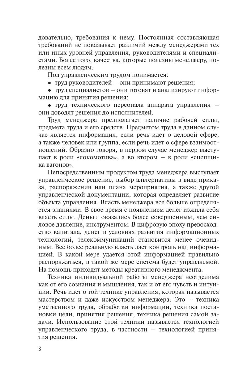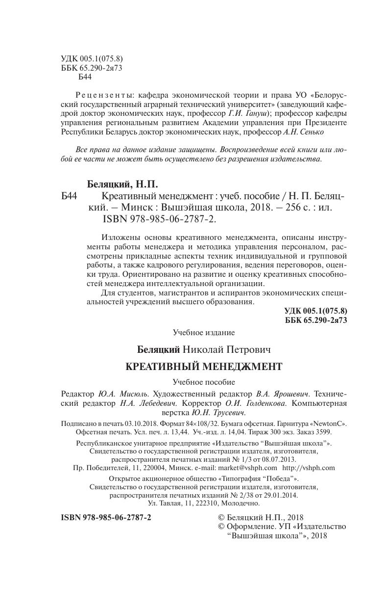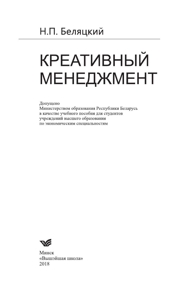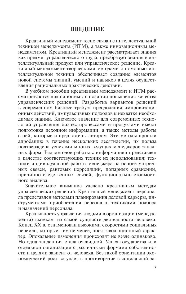 Изложены основы креативного менеджмента, описаны инструменты работы менеджера и методика управления персоналом, рассмотрены прикладные аспекты техник индивидуальной и групповой работы, а также кадрового регулирования, ведения переговоров, оценки труда. Ориентировано на развитие и оценку креативных способностей менеджера интеллектуальной организации. Для студентов, магистрантов и аспирантов экономических специальностей учреждений высшего образования.