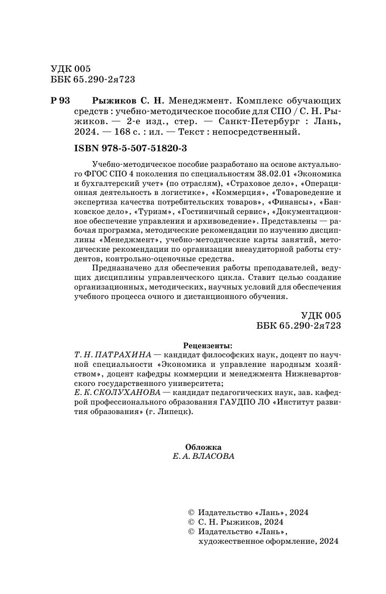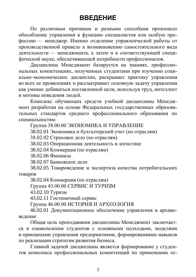 Учебно-методическое пособие разработано на основе актуального ФГОС СПО 4 поколения по специальностям «Экономика и бухгалтерский учет (по отраслям)», «Страховое дело», «Операционная деятельность в логистике», «Коммерция», «Товароведение и экспертиза качества потребительских товаров», «Финансы», «Банковское дело», «Туризм», «Гостиничный сервис», «Документационное обеспечение управления и архивоведение». Представлены рабочая программа, методические рекомендации по изучению дисциплины «Менеджмент», учебно-методические карты занятий, методические рекомендации по организации внеаудиторной работы студентов, контрольно-оценочные средства. Предназначено для обеспечения работы преподавателей, ведущих дисциплины управленческого цикла. Ставит целью создание организационных, методических, научных условий для обеспечения учебного процесса очного и дистанционного обучения.