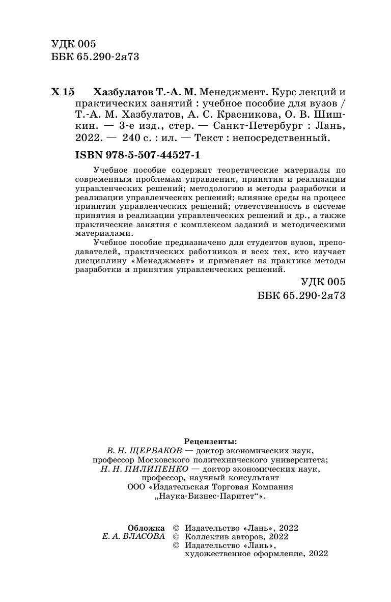 Учебное пособие содержит теоретические материалы по современным проблемам управления, принятия и реализации управленческих решений; методологию и методы разработки и реализации управленческих решений; влияние среды на процесс принятия управленческих решений; ответственность в системе принятия и реализации управленческих решений и др., а также практические занятия с комплексом заданий и методическими материалами.Учебное пособие предназначено для студентов, преподавателей, практических работников и всех тех, кто изучает дисциплину Менеджмент и применяет на практике методы разработки и принятия управленческих решений.