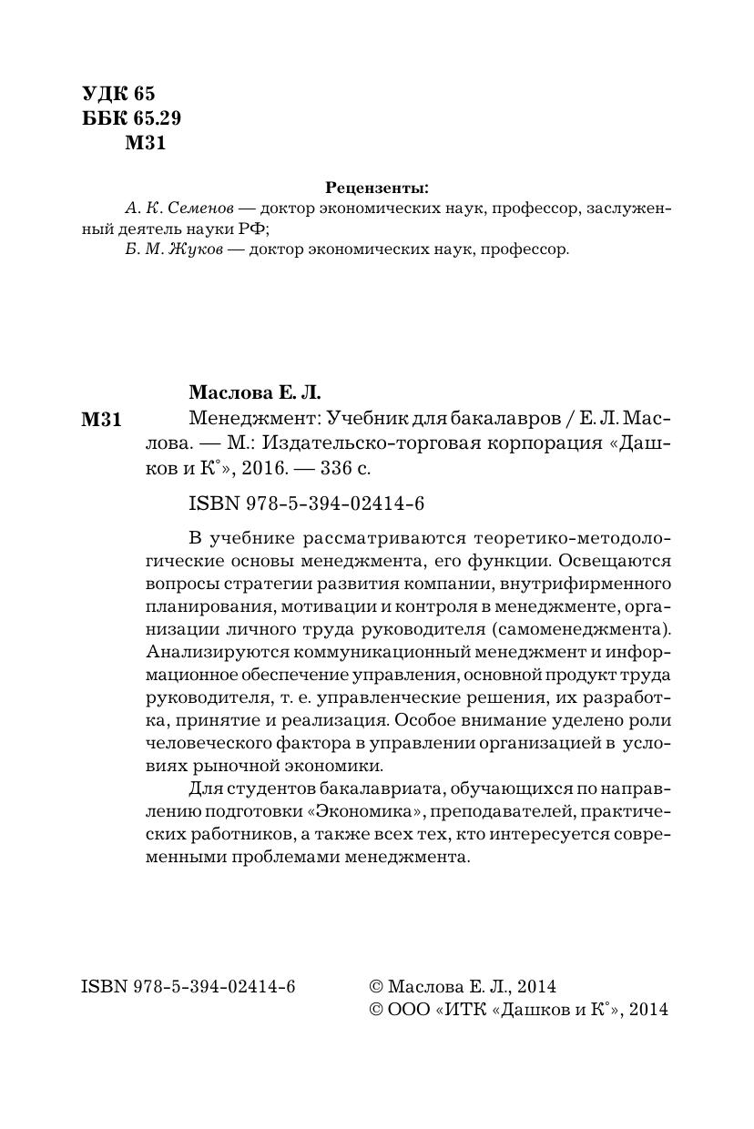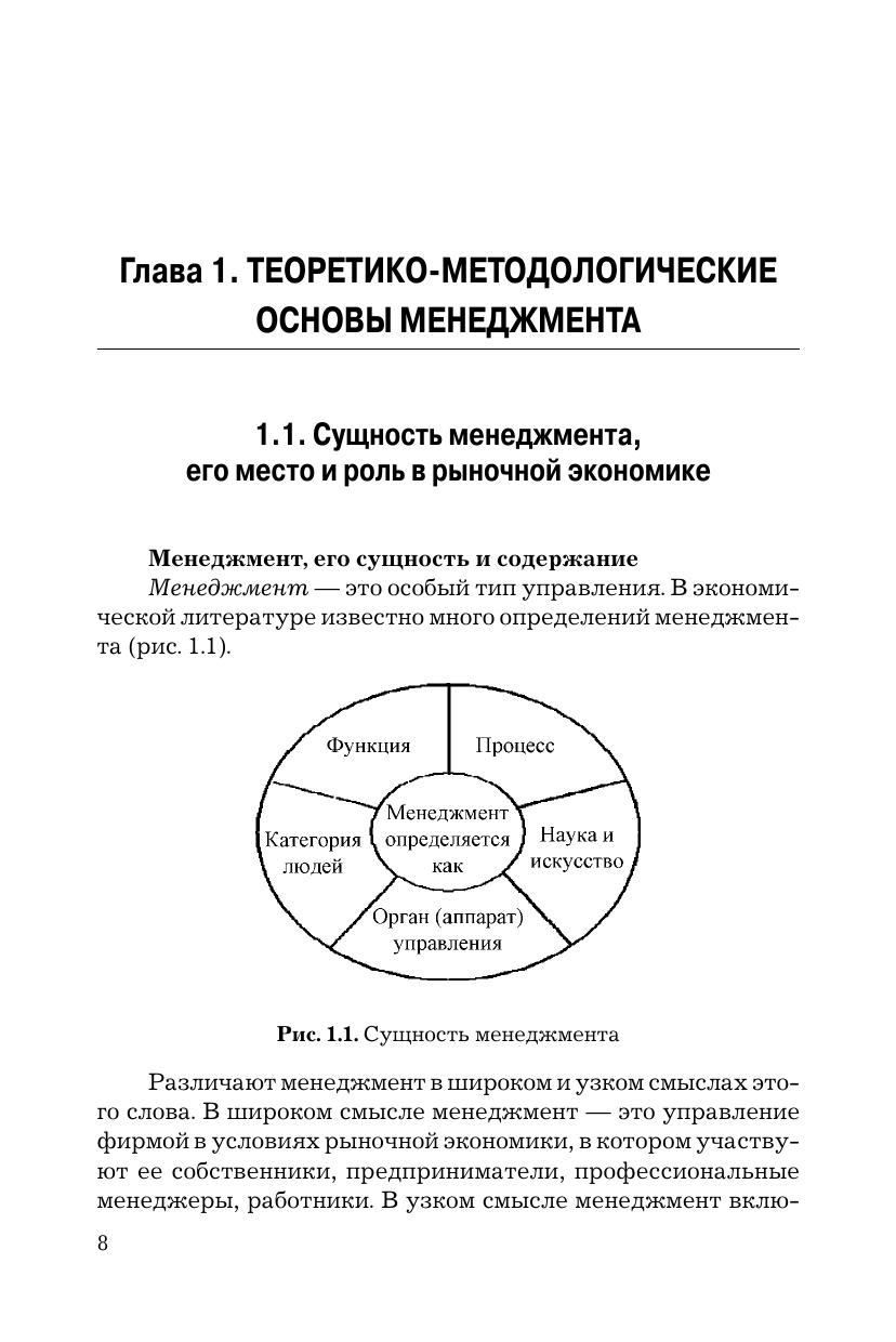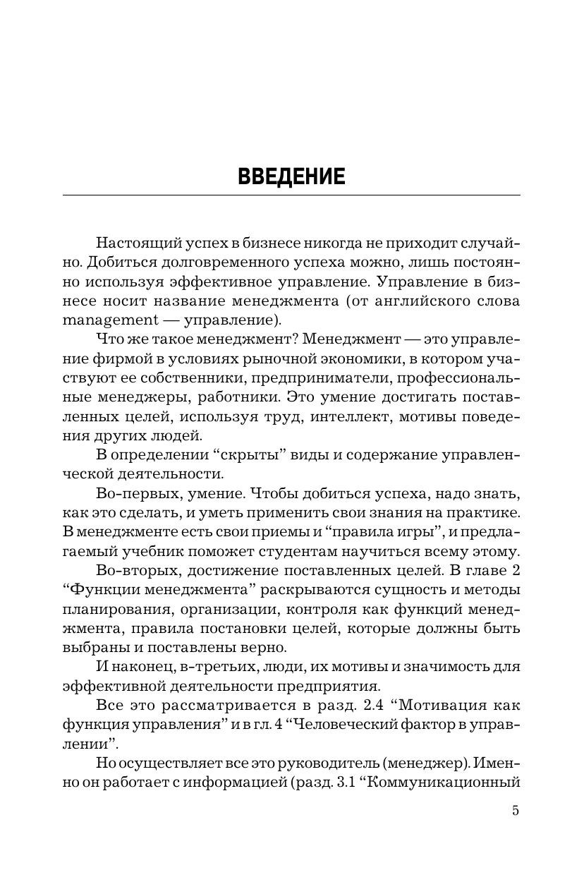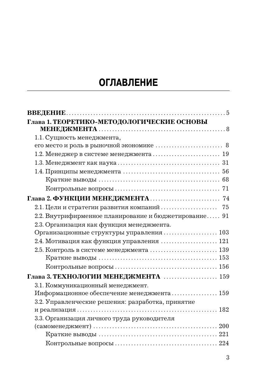 В учебнике рассматриваются теоретико-методологические основы менеджмента, его функции. Освещаются вопросы стратегии развития компании, внутрифирменного планирования, мотивации и контроля в менеджменте, организации личного труда руководителя (самоменеджмента). Анализируются коммуникационный менеджмент и информационное обеспечение управления, основной продукт труда руководителя, т.е. управленческие решения, их разработка, принятие и реализация. Особое внимание уделено роли человеческого фактора в управлении организацией в условиях рыночной экономики. Для студентов бакалавриата, обучающихся по направлению подготовки "Экономика", преподавателей, практических работников, а также всех тех, кто интересуется современными проблемами менеджмента
