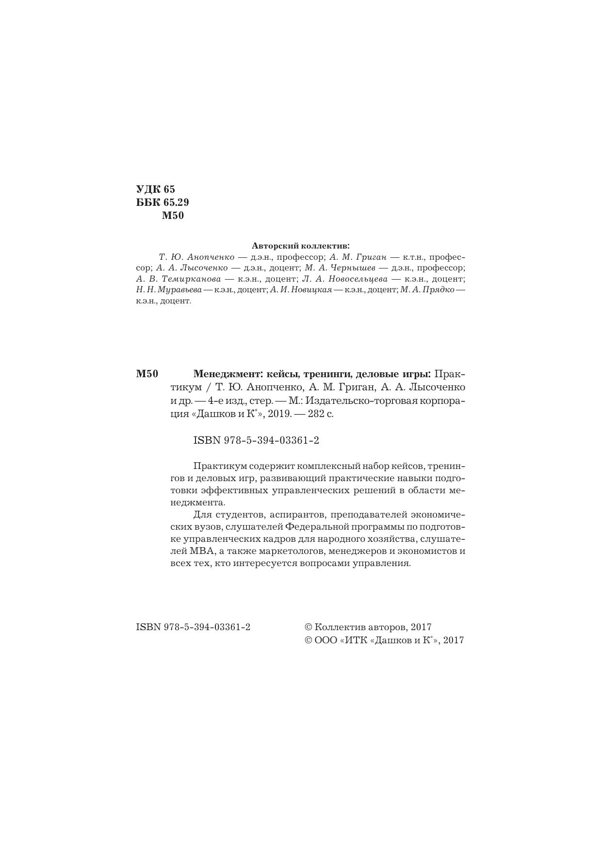 Практикум содержит комплексный набор кейсов, тренингов и деловых игр, развивающий практические навыки подготовки эффективных управленческих решений в области менеджмента. Для студентов, аспирантов, преподавателей экономических вузов, слушателей Федеральной программы по подготовке управленческих кадров для народного хозяйства, слушателей МВА, а также маркетологов, менеджеров и экономистов и всех тех, кто интересуется вопросами управления.