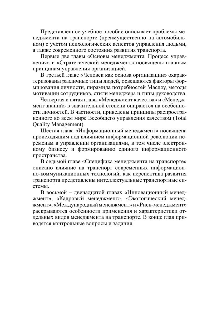 Описано использование менеджмента в транспортной сфере с учетом психологических аспектов управления людьми, а также современного состояния развития транспорта. Рассматриваются интеллектуальные транспортные системы. Приводится информация о различных видах менеджмента: инновационного, международного, экологического, кадрового, информационного.