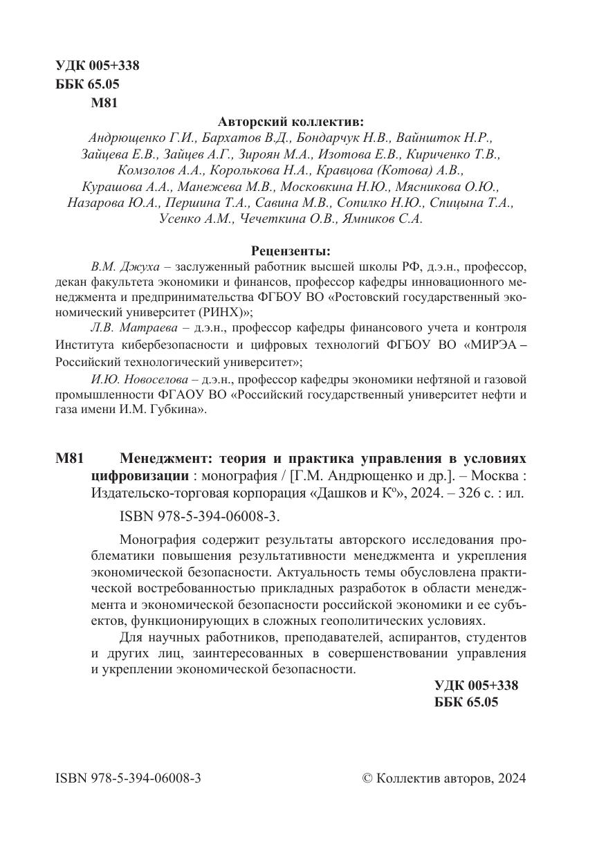 Монография содержит результаты авторского исследования проблематики повышения результативности менеджмента и укрепления экономической безопасности. Актуальность темы обусловлена практической востребованностью прикладных разработок в области менеджмента и экономической безопасности российской экономики и ее субъектов, функционирующих в сложных геополитических условиях.