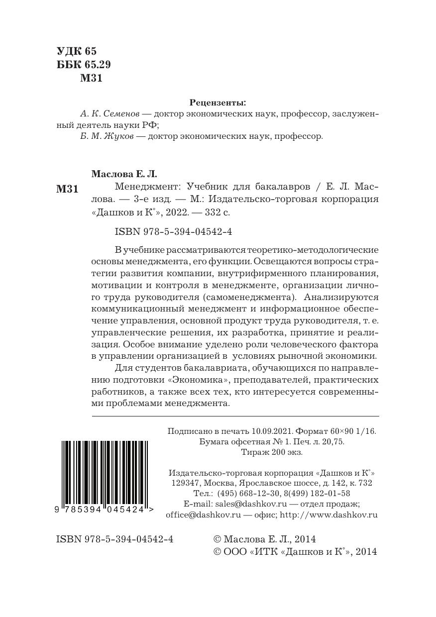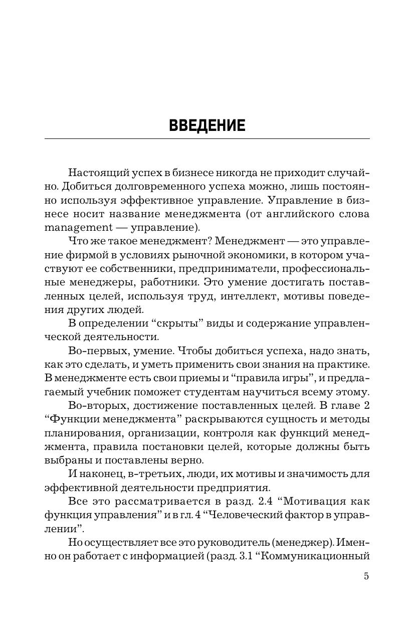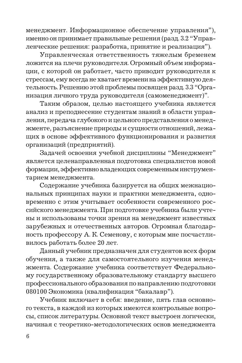 В учебнике рассматриваются теоретико-методологические основы менеджмента, его функции. Освещаются вопросы стратегии развития компании, внутрифирменного планирования, мотивации и контроля в менеджменте, организации личного труда руководителя (самоменеджмента). Анализируются коммуникационный менеджмент и информационное обеспечение управления, основной продукт труда руководителя, т.е. управленческие решения, их разработка, принятие и реализация. Особое внимание уделено роли человеческого фактора в управлении организацией в условиях рыночной экономики. Для студентов бакалавриата, обучающихся по направлению подготовки "Экономика", преподавателей, практических работников, а также всех тех, кто интересуется современными проблемами менеджмента