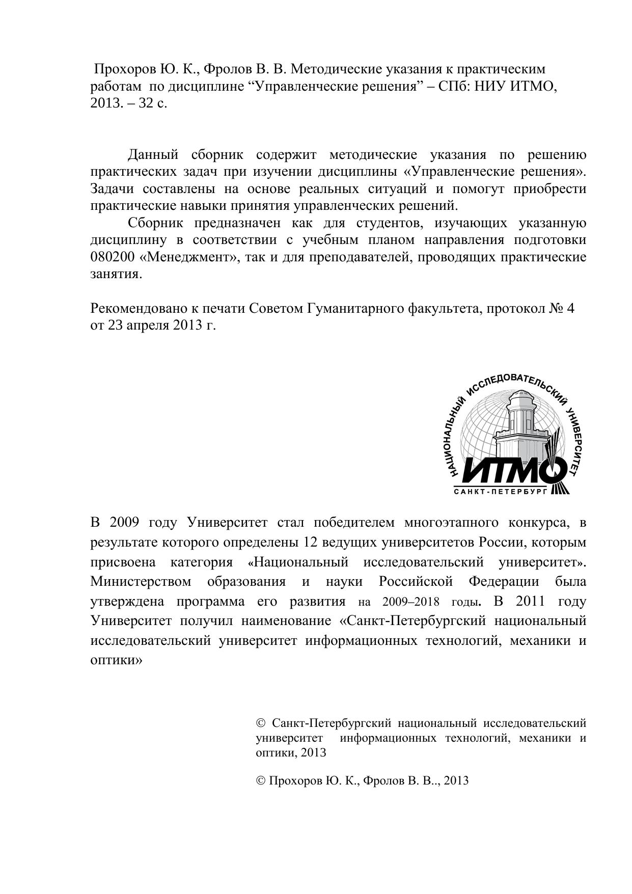 Данный сборник содержит методические указания по решению практических задач при изучении дисциплины «Управленческие решения». Задачи составлены на основе реальных ситуаций и помогут приобрести практические навыки принятия управленческих решений. Сборник предназначен как для студентов, изучающих указанную дисциплину в соответствии с учебным планом направления подготовки 080200 «Менеджмент», так и для преподавателей, проводящих практические занятия.