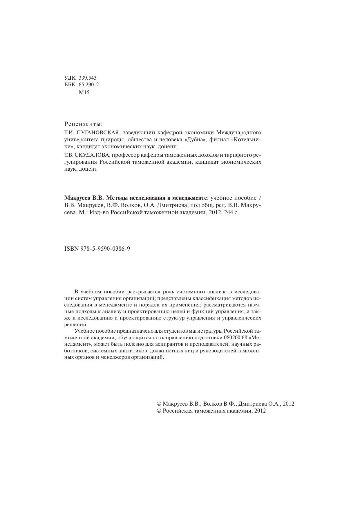 В учебном пособии раскрывается роль системного анализа в исследовании систем управления организаций; представлены классификация методов ис -следования в менеджменте и порядок их применения; рассматриваются научные подходы к анализу и проектированию целей и функций управления, а также к исследованию и проектированию структур управления и управленческих решений. Учебное пособие предназначено для студентов магистратуры Российской таможенной академии, обучающихся по направлению подготовки 080200.68 «Менеджмент», может быть полезно для аспирантов и преподавателей, научных работников, системных аналитиков, должностных лиц и руководителей таможенных органов и менеджеров организаций.