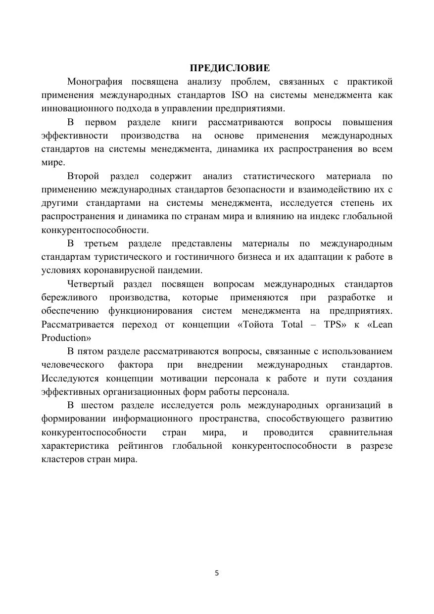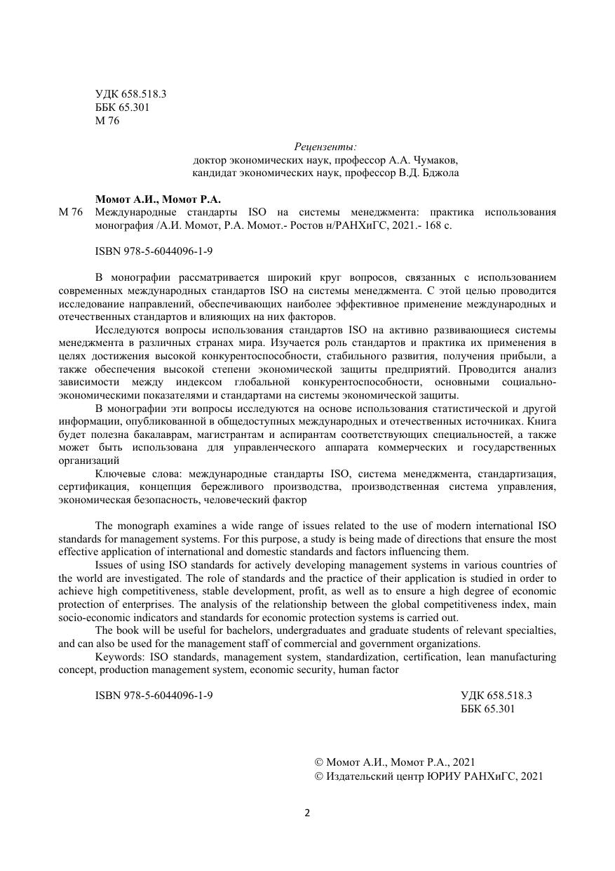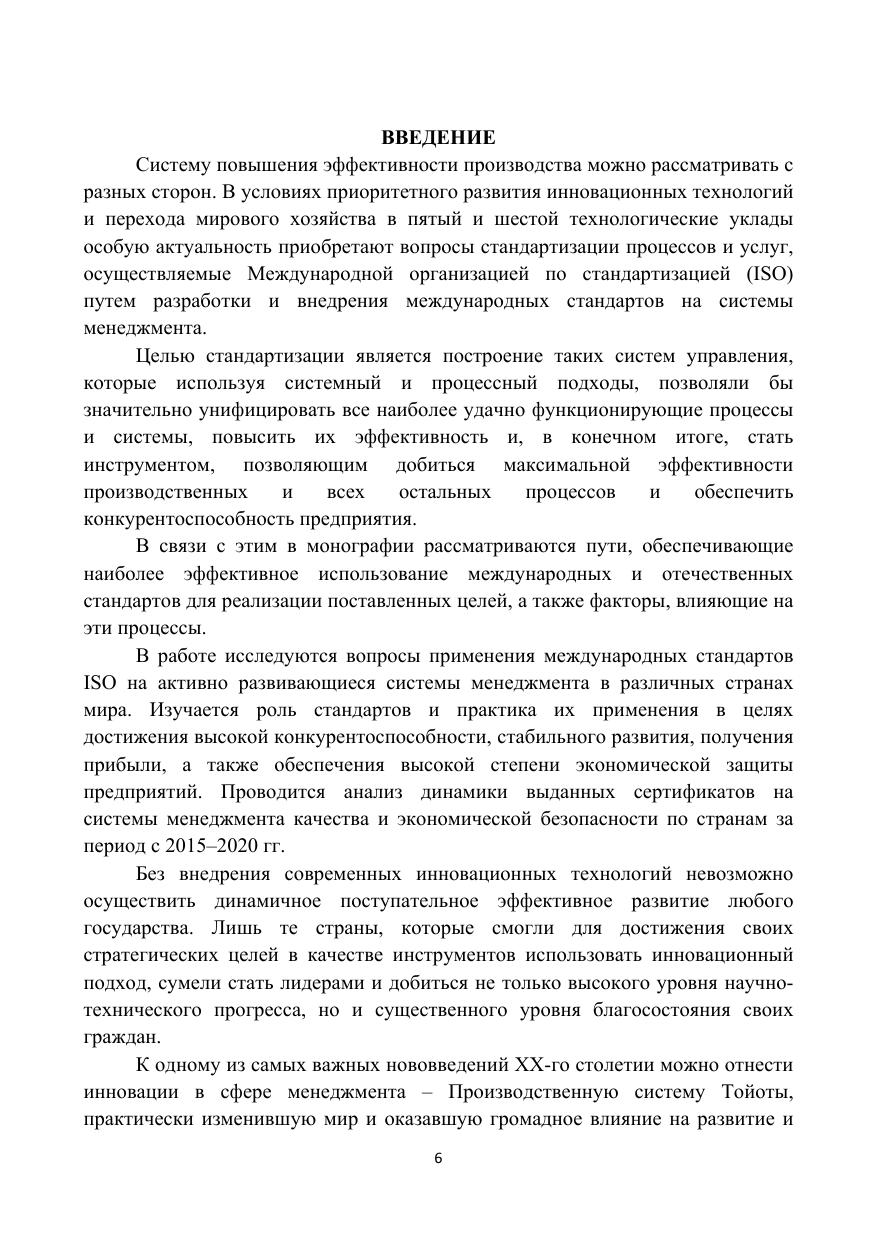 В монографии рассматривается широкий круг вопросов, связанных с использованием современных международных стандартов ISO на системы менеджмента. С этой целью проводится исследование направлений, обеспечивающих наиболее эффективное применение международных и отечественных стандартов и влияющих на них факторов. Исследуются вопросы использования стандартов ISO на активно развивающиеся системы менеджмента в различных странах мира. Изучается роль стандартов и практика их применения в целях достижения высокой конкурентоспособности, стабильного развития, получения прибыли, а также обеспечения высокой степени экономической защиты предприятий. Проводится анализ зависимости между индексом глобальной конкурентоспособности, основными социальноэкономическими показателями и стандартами на системы экономической защиты. В монографии эти вопросы исследуются на основе использования статистической и другой информации, опубликованной в общедоступных международных и отечественных источниках. Книга будет полезна бакалаврам, магистрантам и аспирантам соответствующих специальностей, а также может быть использована для управленческого аппарата коммерческих и государственных организаций Ключевые слова: международные стандарты ISO, система менеджмента, стандартизация, сертификация, концепция бережливого производства, производственная система управления, экономическая безопасность, человеческий фактор