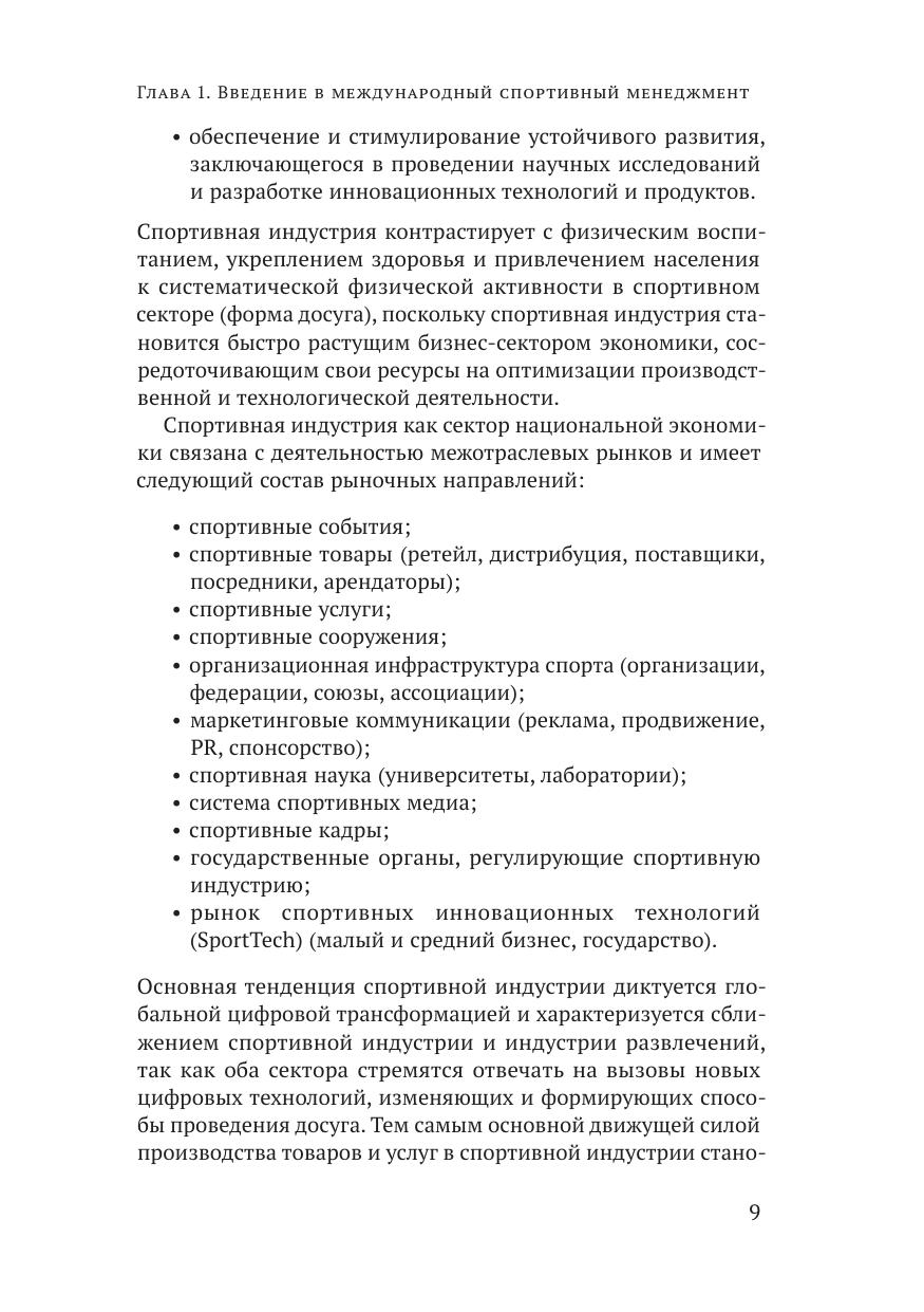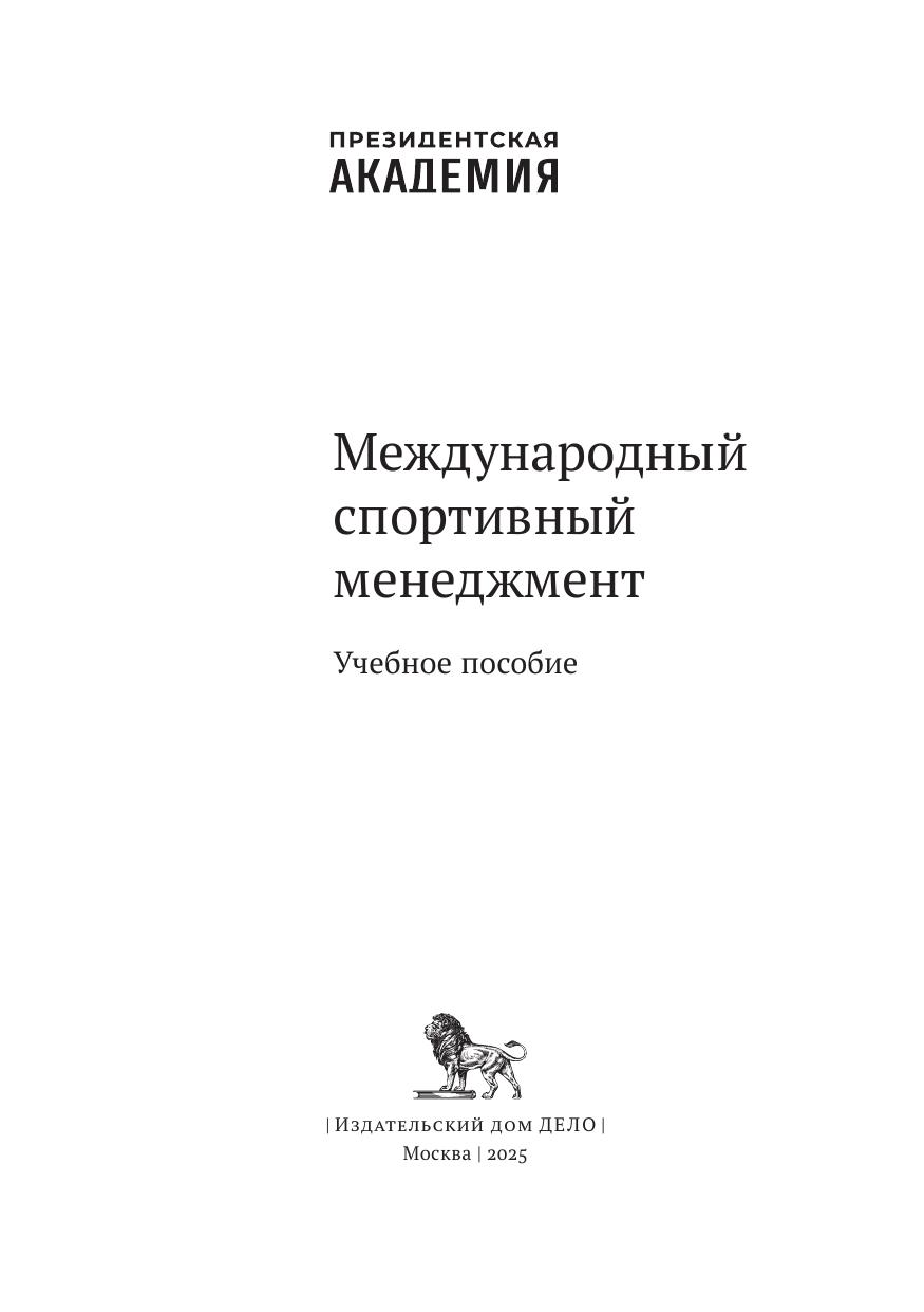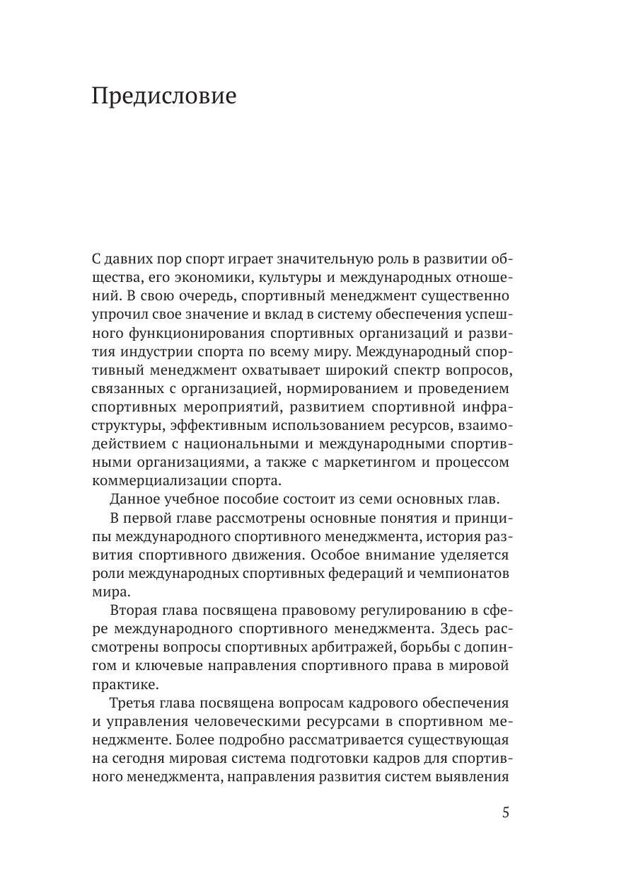 Учебное пособие авторского коллектива кафедры менеджмента спортивной и туристской индустрии посвящено всестороннему исследованию и анализу организационно-экономических, социально-психологических, правовых, инновационно-информационных, кадровых особенностей организации и реализации целей и задач спортивного менеджмента с учетом российской и зарубежной практики. Данное пособие предназначено для студентов управленческих специальностей, изучающих вопросы формирования взаимоотношений, регулирования, психологии, маркетинга и экономики в сфере международного спортивного менеджмента в условиях усиления санкционной политики и перспективных направлений движения России в мировой спортивной индустрии. Пособие может быть полезно студентам, получившим образование в сфере государственного управления, экономики, психологии и приступающим к изучению ключевых направлений и специфики развития спортивного менеджмента в реалиях современной мировой экономики.