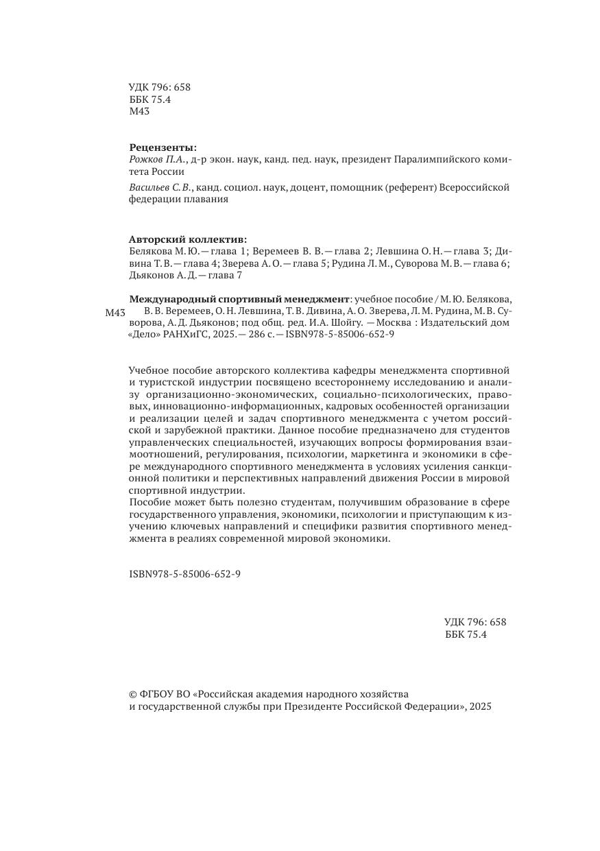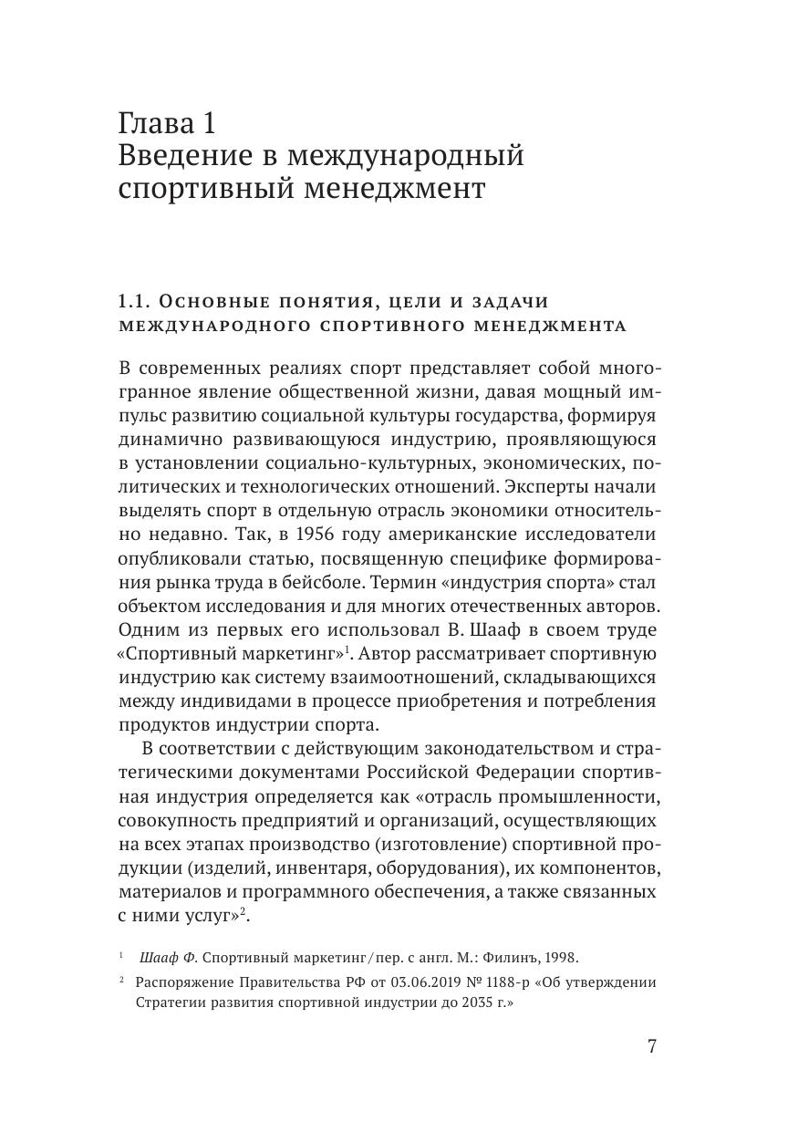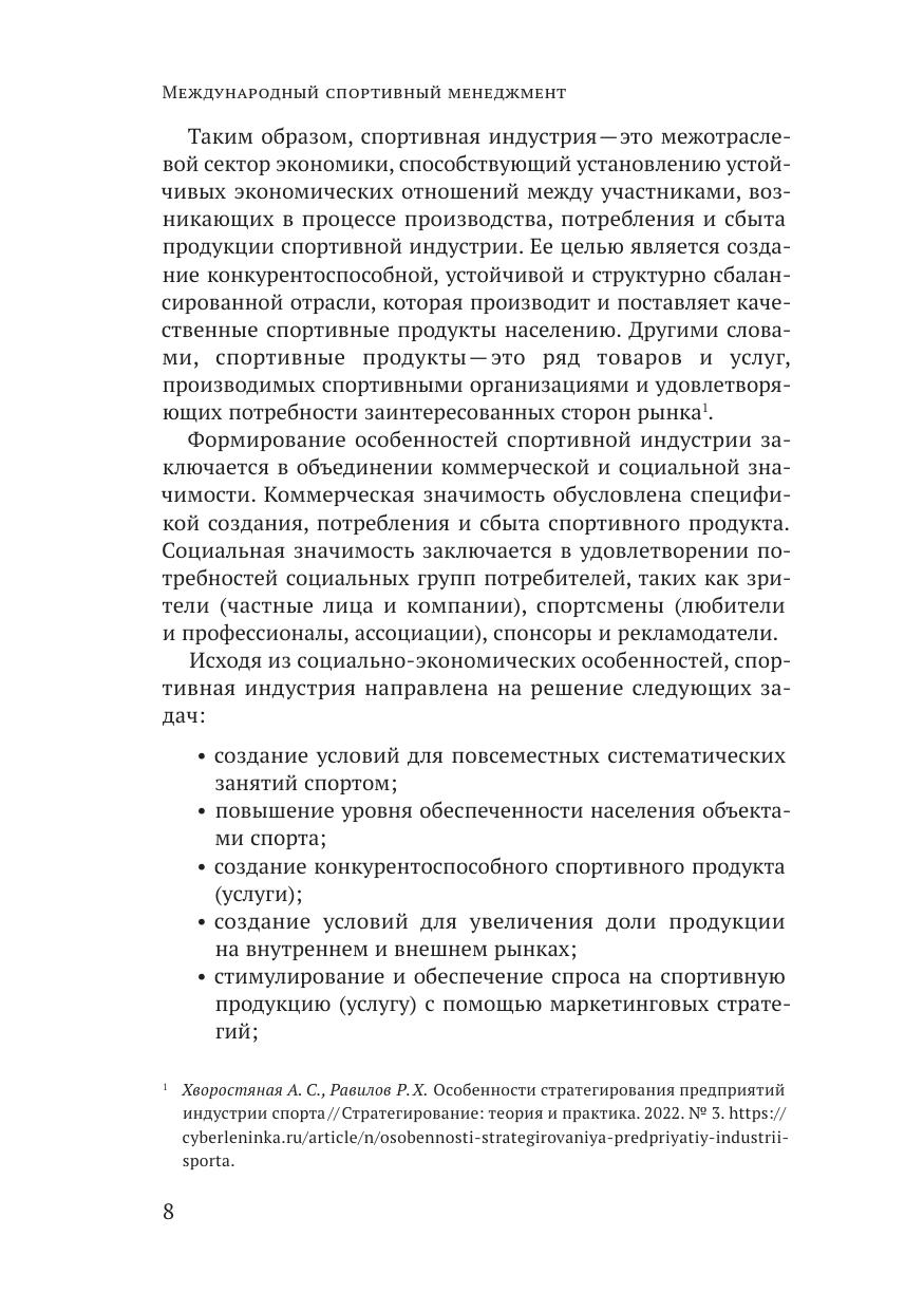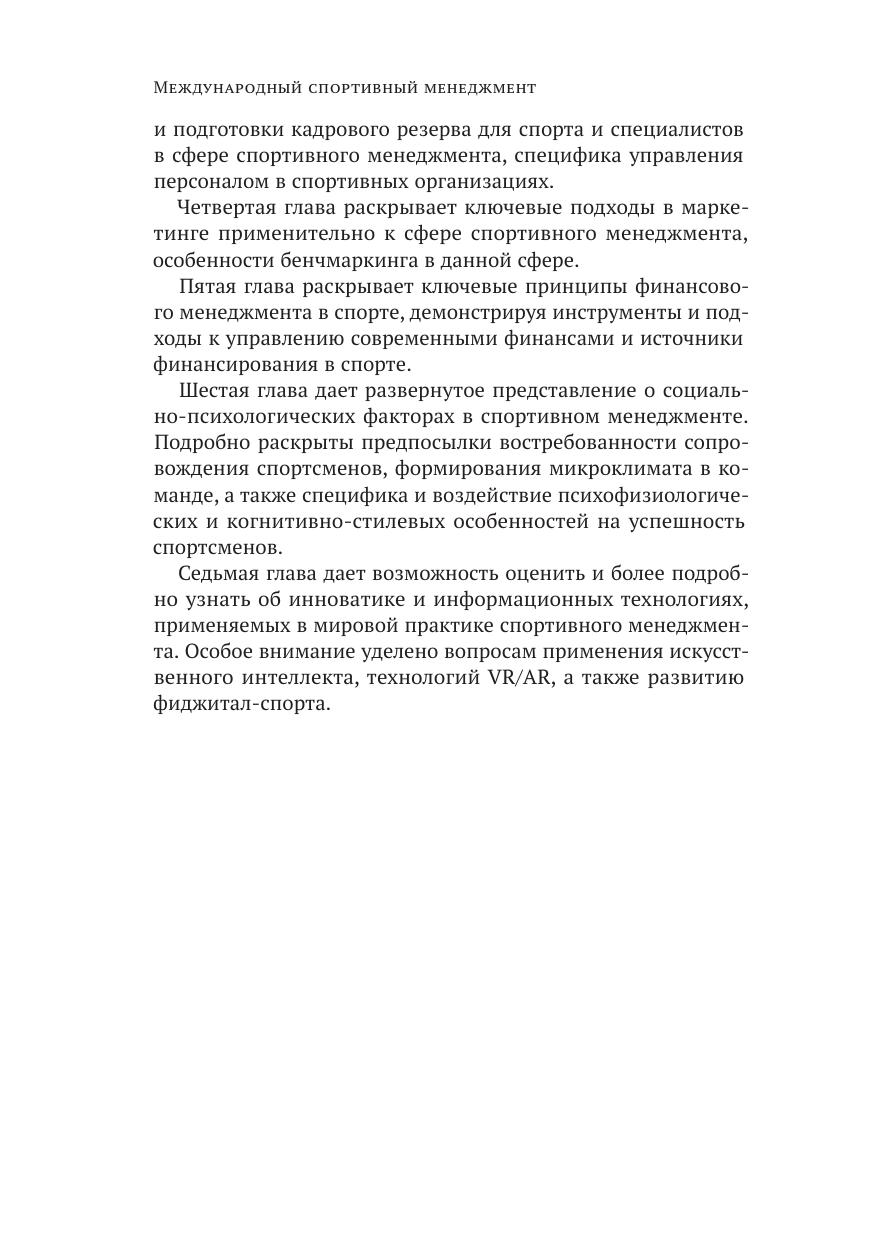 Учебное пособие авторского коллектива кафедры менеджмента спортивной и туристской индустрии посвящено всестороннему исследованию и анализу организационно-экономических, социально-психологических, правовых, инновационно-информационных, кадровых особенностей организации и реализации целей и задач спортивного менеджмента с учетом российской и зарубежной практики. Данное пособие предназначено для студентов управленческих специальностей, изучающих вопросы формирования взаимоотношений, регулирования, психологии, маркетинга и экономики в сфере международного спортивного менеджмента в условиях усиления санкционной политики и перспективных направлений движения России в мировой спортивной индустрии. Пособие может быть полезно студентам, получившим образование в сфере государственного управления, экономики, психологии и приступающим к изучению ключевых направлений и специфики развития спортивного менеджмента в реалиях современной мировой экономики.