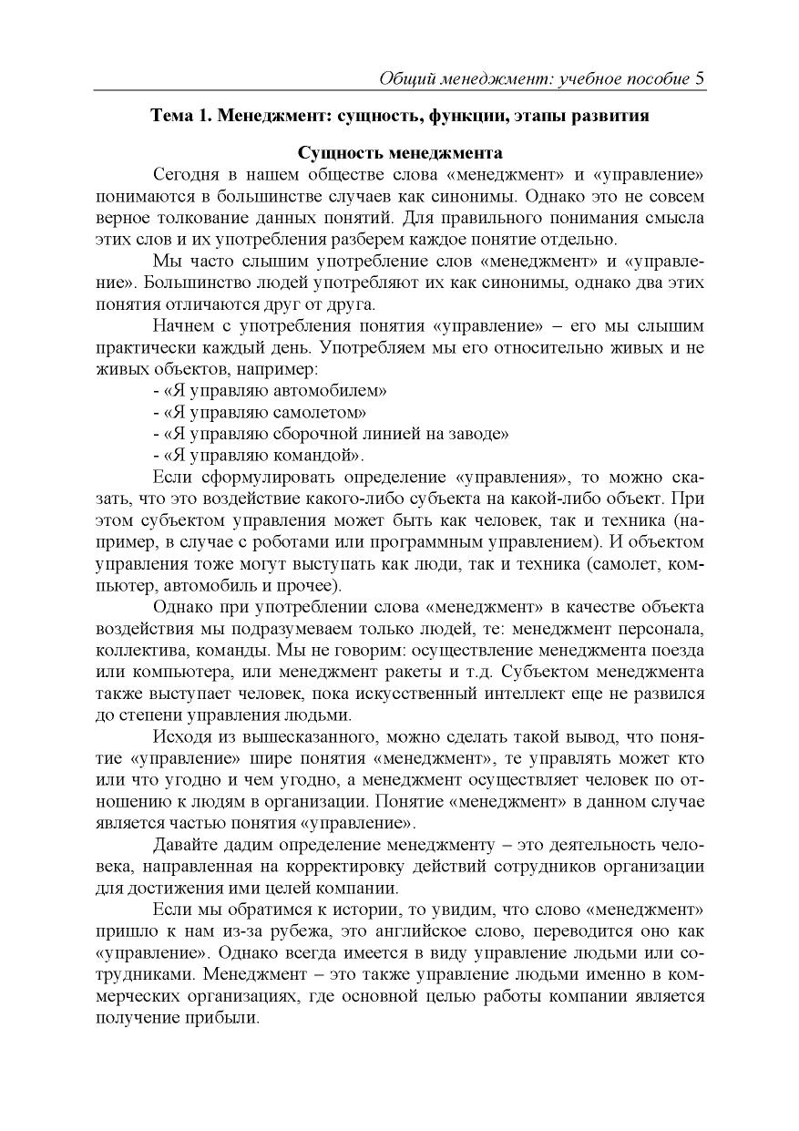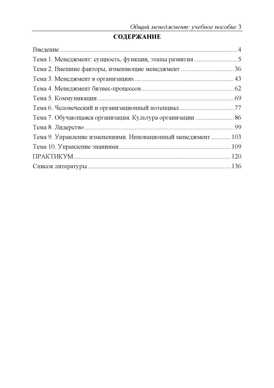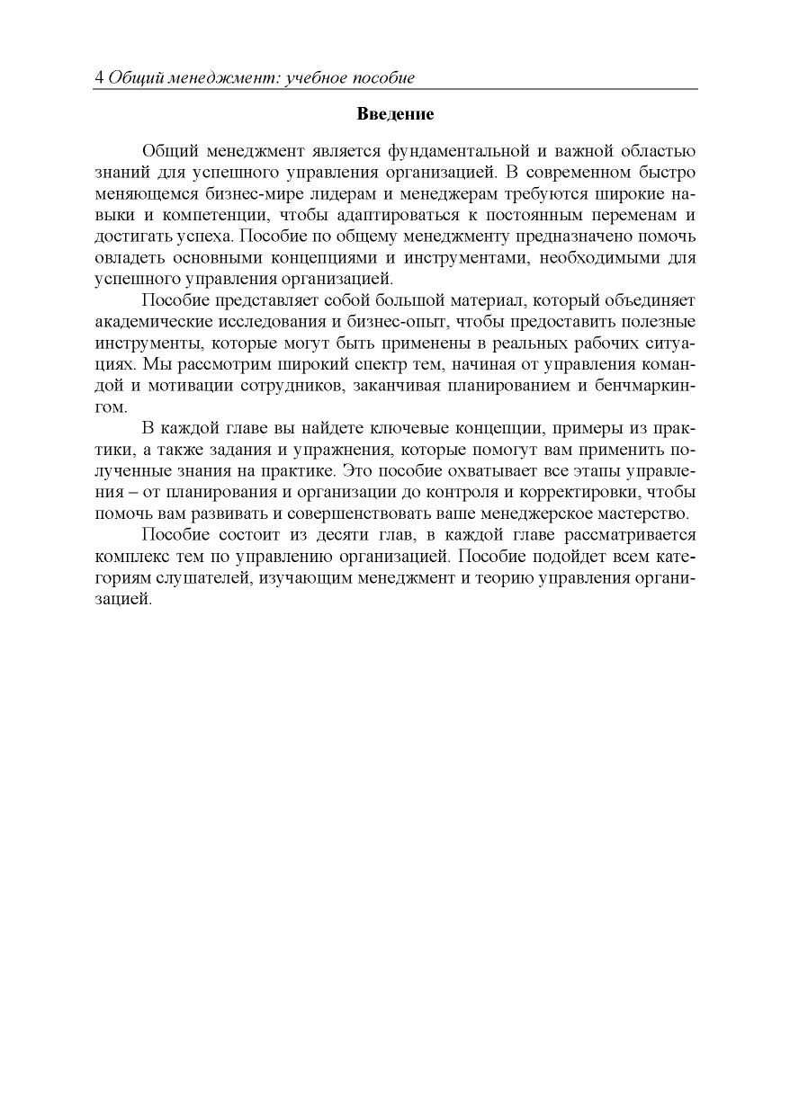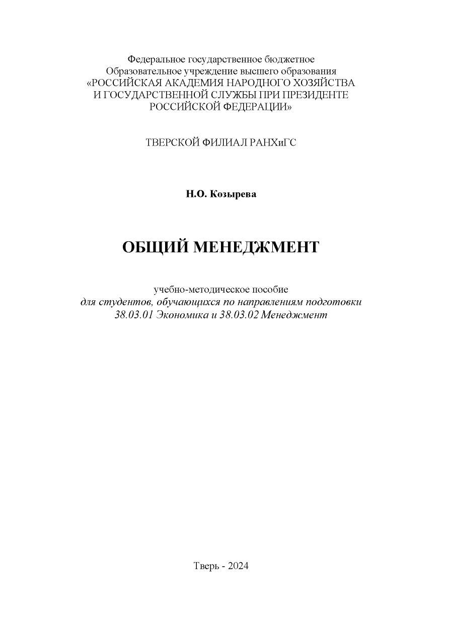 Учебно-методическое пособие посвящено теории и практике общего менеджмента. Изложены методы и функции управления организациями, рассмотрены история и функции менеджмента, а также современные тенденции развития менеджмента. Соответствует актуальным требованиям собственно установленных образовательных стандартов высшего образования Академии. Для студентов вузов; может быть использовано при подготовке специа- листов по программам Master of Business Administration (MBA), а также на программах дополнительного профессионального образования.