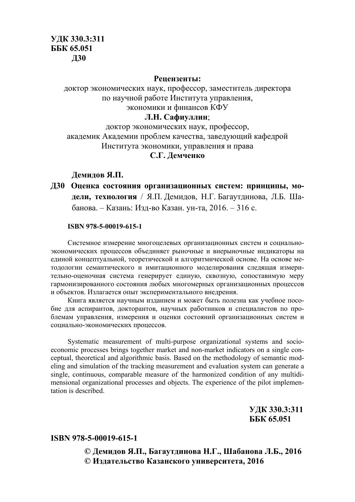 Системное измерение многоцелевых организационных систем и социально-экономических процессов объединяет рыночные и внерыночные индикаторы на единой концептуальной, теоретической и алгоритмической основе. На основе методологии семантического и имитационного моделирования следящая измерительно-оценочная система генерирует единую, сквозную, сопоставимую меру гармонизированного состояния любых многомерных организационных процессов и объектов. Излагается опыт экспериментального внедрения. Книга является научным изданием и может быть полезна как учебное пособие для аспирантов, докторантов, научных работников и специалистов по проблемам управления, измерения и оценки состояний организационных систем и социально-экономических процессов.