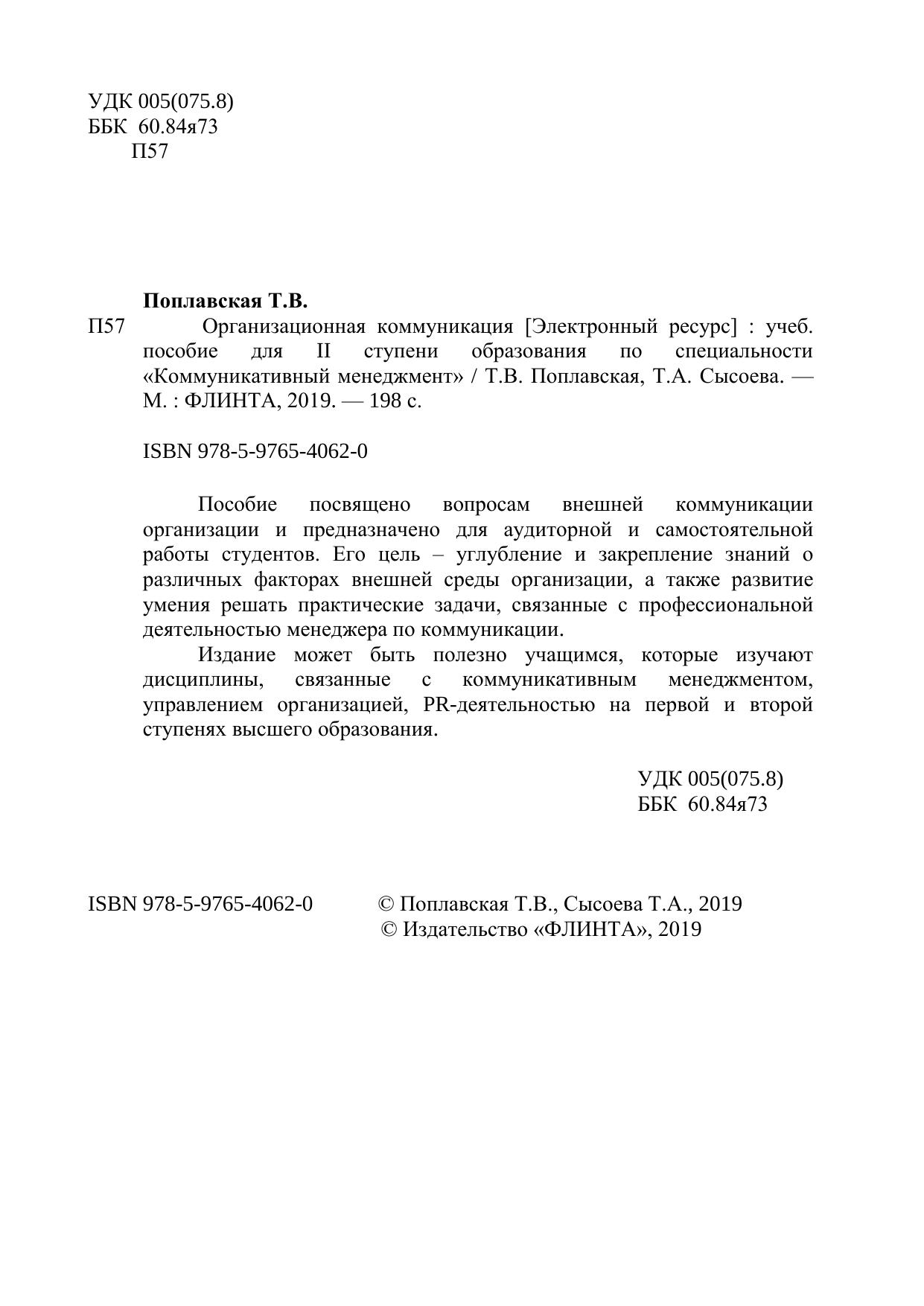 Издание может быть полезно учащимся, которые изучают дисциплины, связанные с коммуникативным менеджментом, управлением организацией, PR-деятельностью на первой и второй ступенях высшего образования.