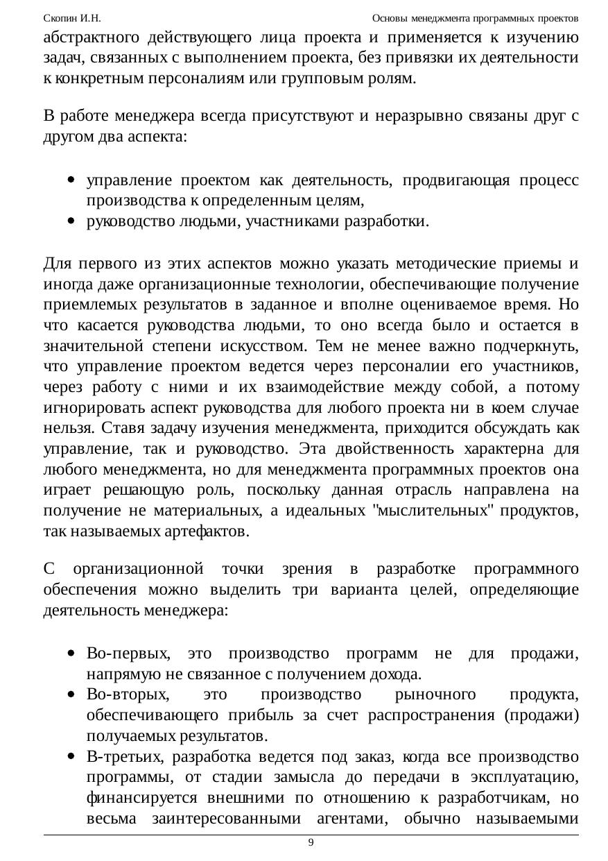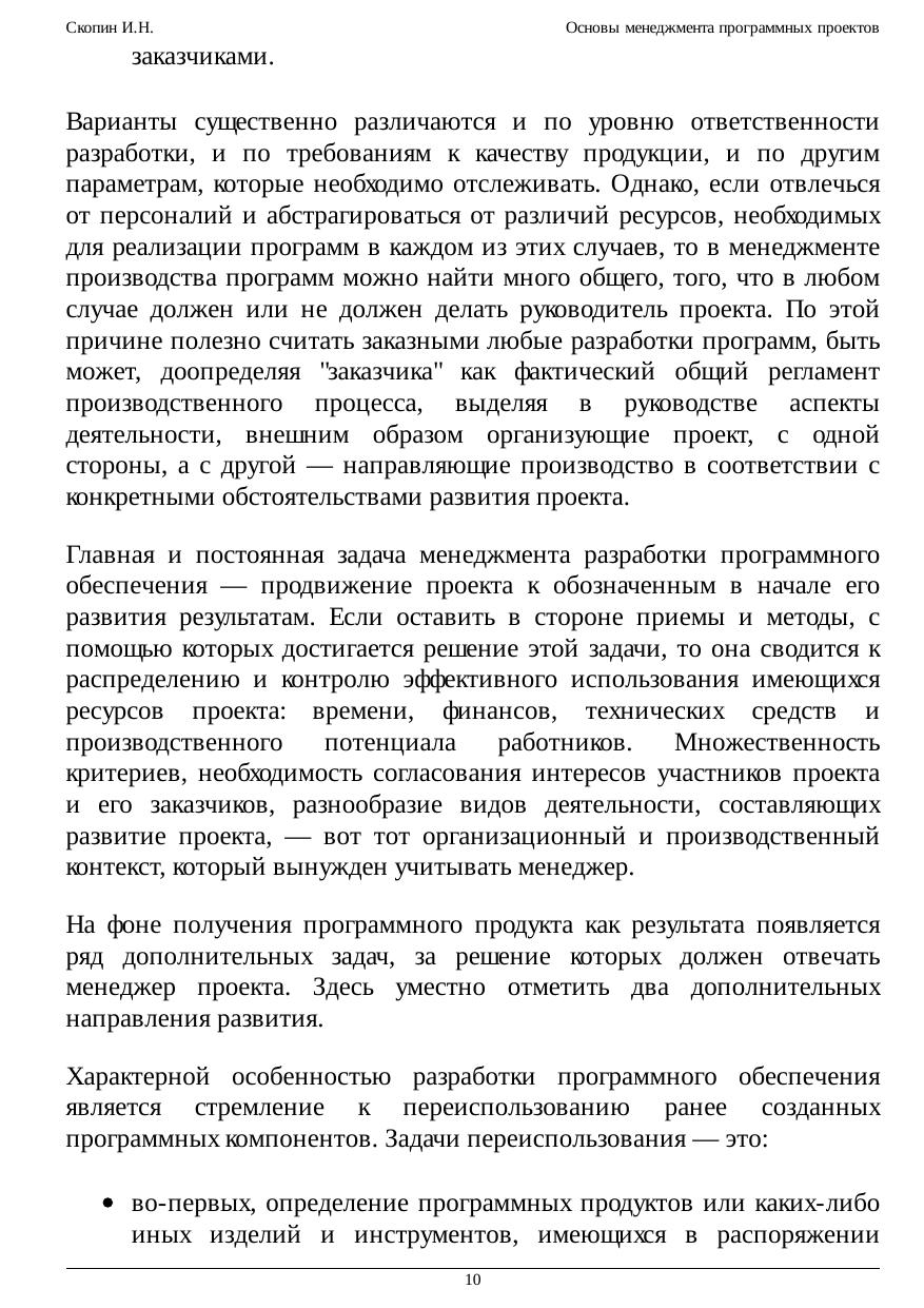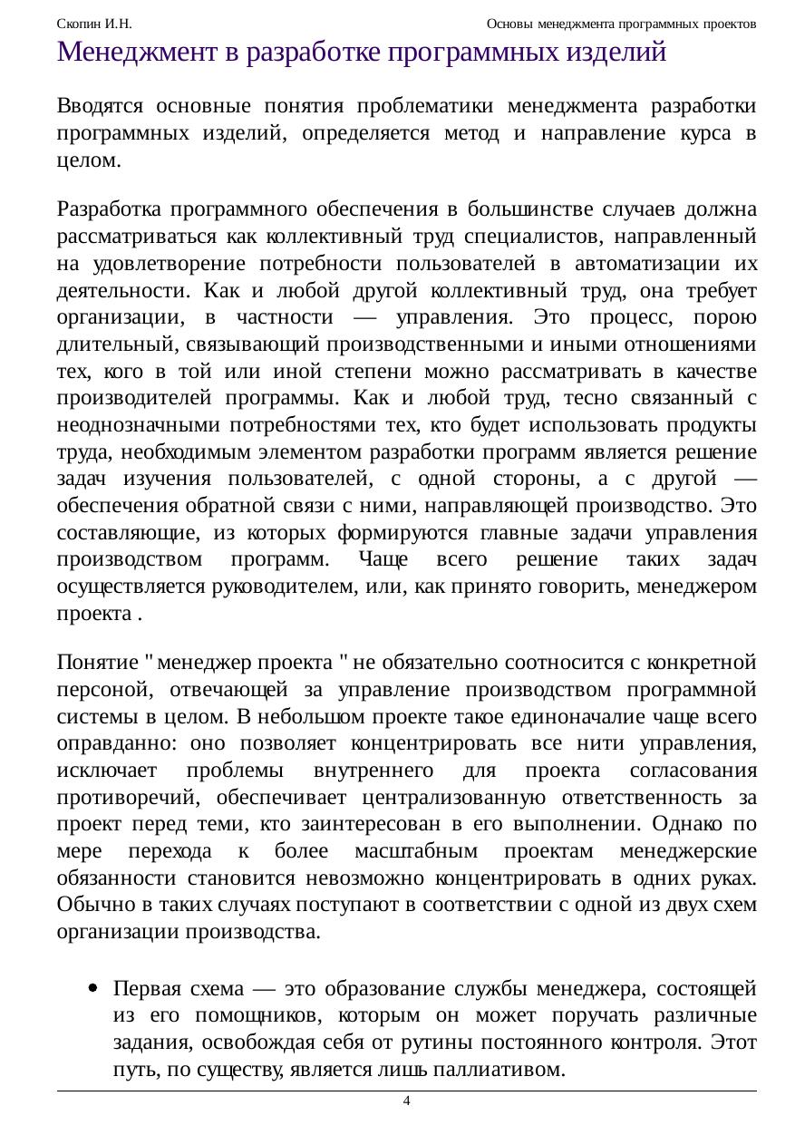 Обсуждаются понятия и методы менеджмента в объеме, необходимом для общего образования программиста. Вводится система понятий менеджмента программных проектов, достаточная для того, чтобы обучаемый смог самостоятельно осваивать существующие методы и технологии проектирования для их применения в практической деятельности. Изложение строится в привязке деятельности менеджера к этапам жизненного цикла проекта. Особое внимание обращается на разграничение аспектов руководства и управления в деятельности менеджера.