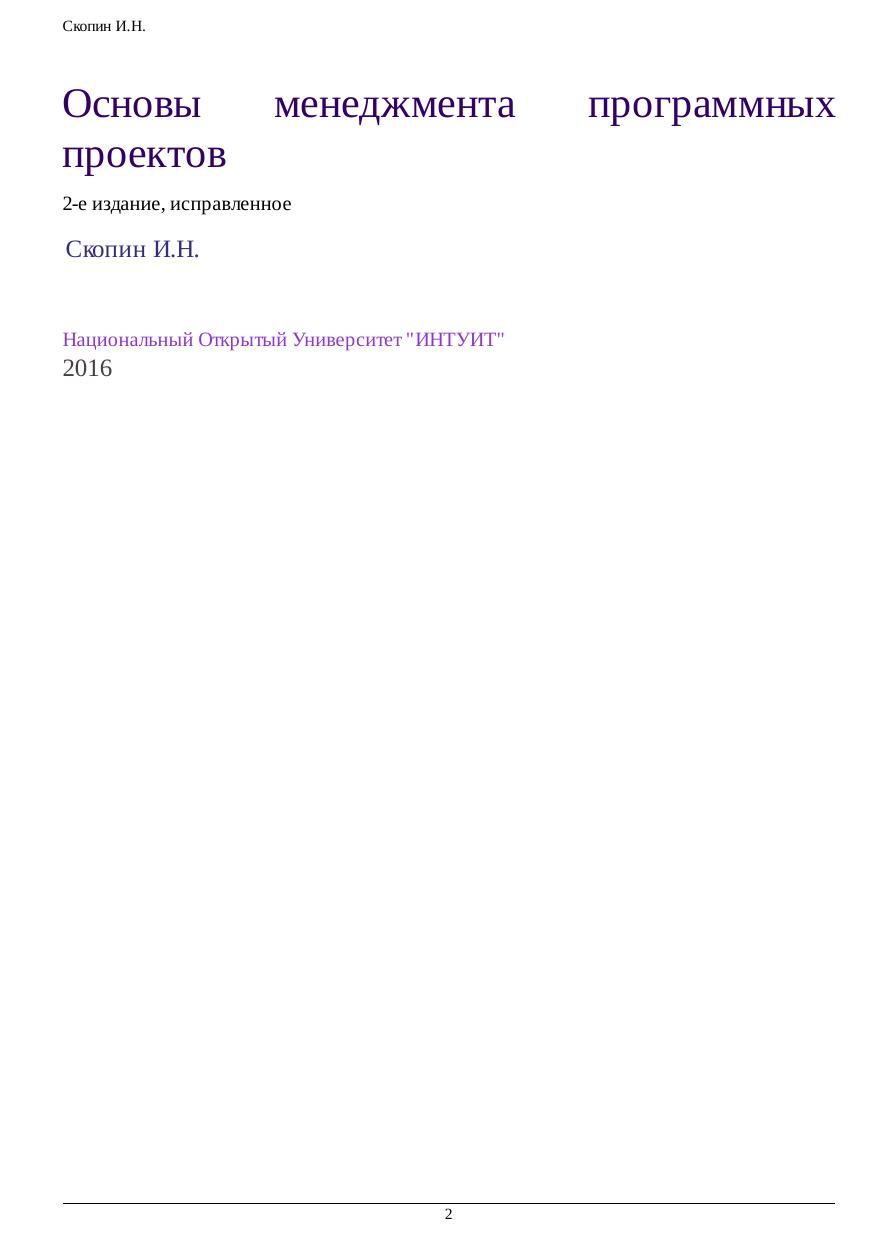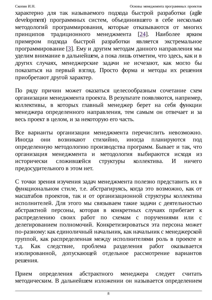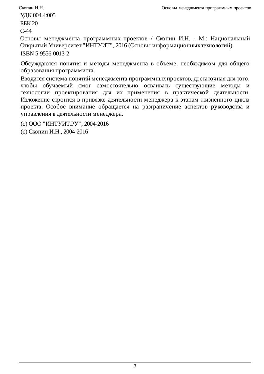 Обсуждаются понятия и методы менеджмента в объеме, необходимом для общего образования программиста. Вводится система понятий менеджмента программных проектов, достаточная для того, чтобы обучаемый смог самостоятельно осваивать существующие методы и технологии проектирования для их применения в практической деятельности. Изложение строится в привязке деятельности менеджера к этапам жизненного цикла проекта. Особое внимание обращается на разграничение аспектов руководства и управления в деятельности менеджера.