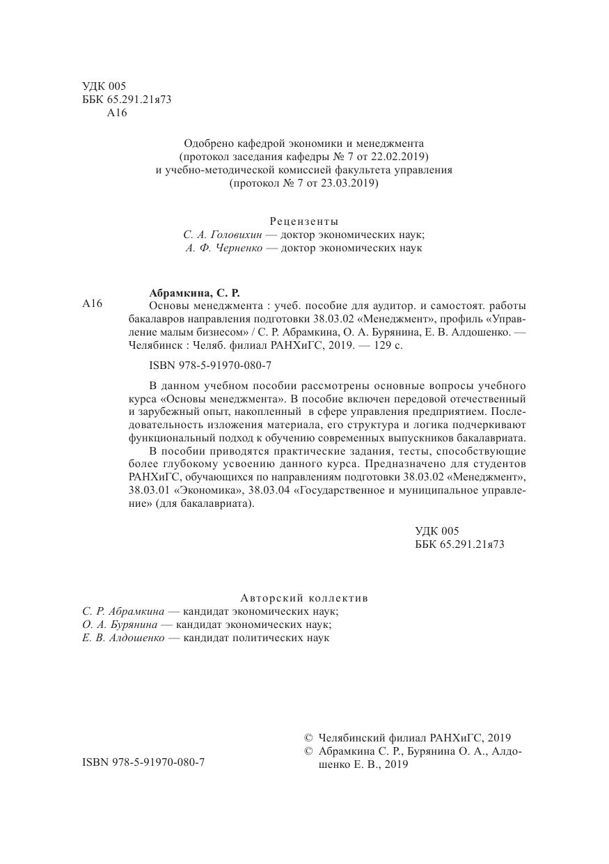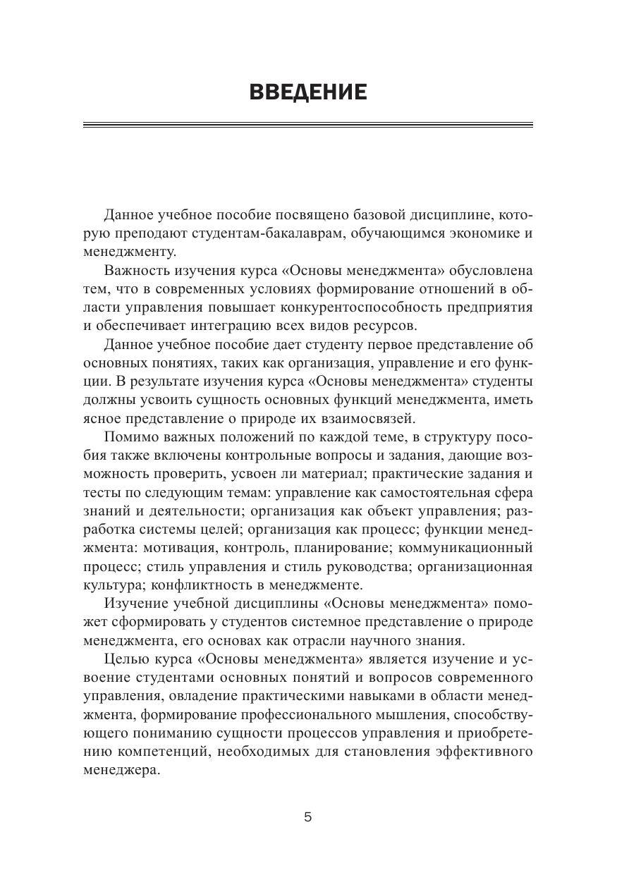 В данном учебном пособии рассмотрены основные вопросы учебного курса «Основы менеджмента». В пособие включен передовой отечественный и зарубежный опыт, накопленный в сфере управления предприятием. Последовательность изложения материала, его структура и логика подчеркивают функциональный подход к обучению современных выпускников бакалавриата. В пособии приводятся практические задания, тесты, способствующие более глубокому усвоению данного курса. Предназначено для студентов РАНХиГС, обучающихся по направлениям подготовки 38.03.02 «Менеджмент», 38.03.01 «Экономика», 38.03.04 «Государственное и муниципальное управление» (для бакалавриата).