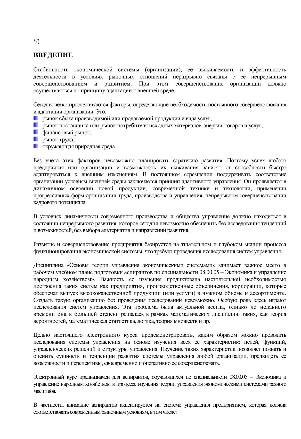 Становление и развитие рыночных отношений в России потребовало коренного пересмотра стиля и методов управления социально-экономическими системами различного масштаба. Современные специалисты в сфере управления должны обладать комплексом знаний и умений, который позволит их производить качественные исследования, способствующие развитию теории и практики построения новых и совершенствования функционирующих систем управления. Электронный курс «Основы теории управления экономическими системами» представляет собой изложение понятийного аппарата и базовых положений учебной дисциплины, тексты лекций, включает учебную программу дисциплины, контрольные вопросы и тесты для промежуточного и итогового контроля, глоссарий. Электронный курс адресован аспирантам, обучающимся по специальности 08.00.05 – Экономика и управление народным хозяйством, и является составной частью рабочего учебного плана подготовки аспирантов.