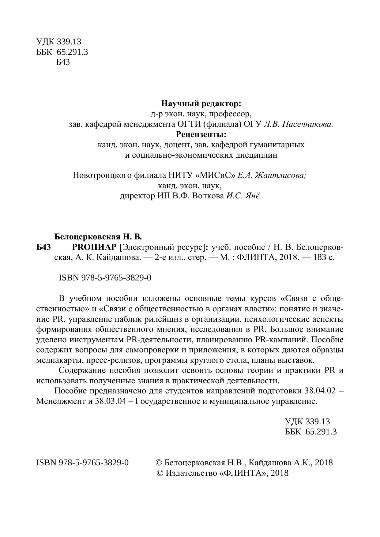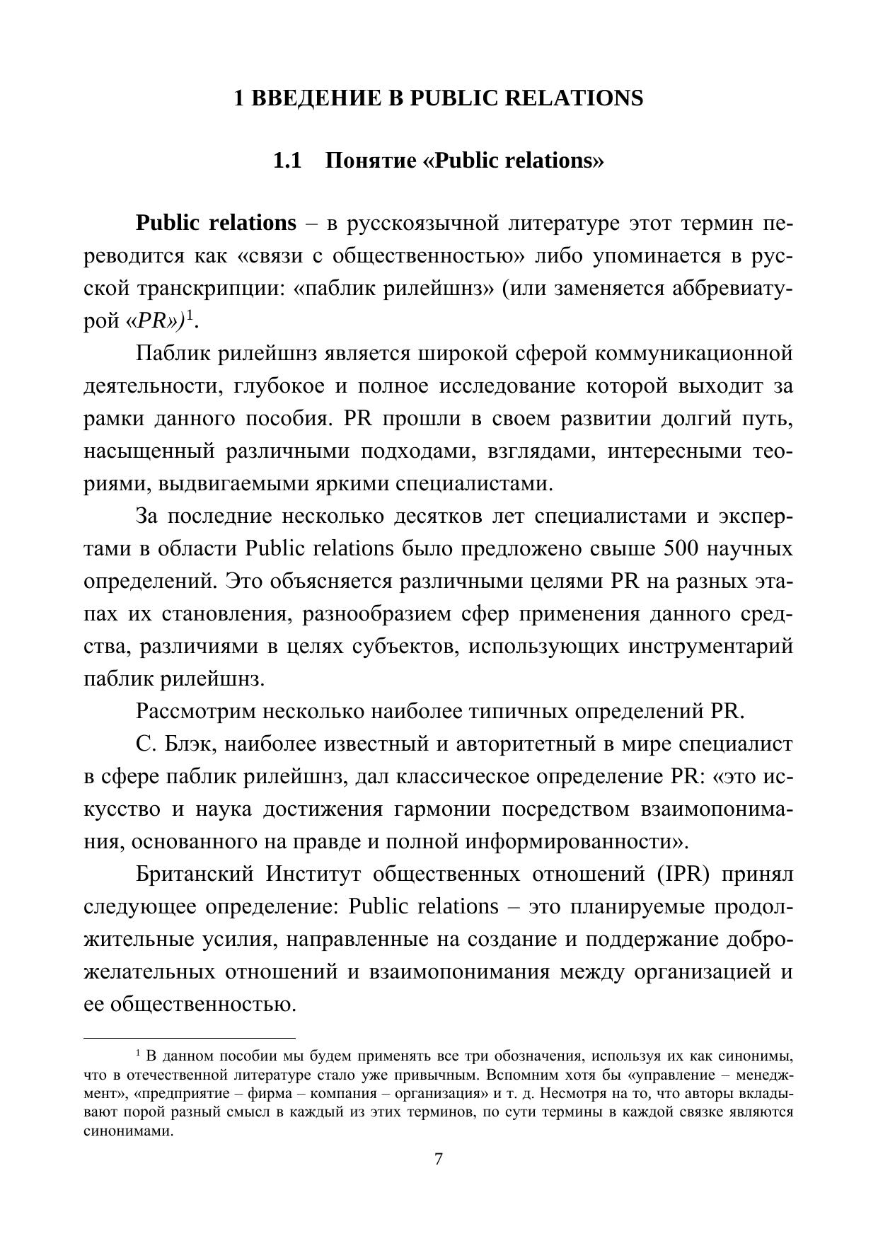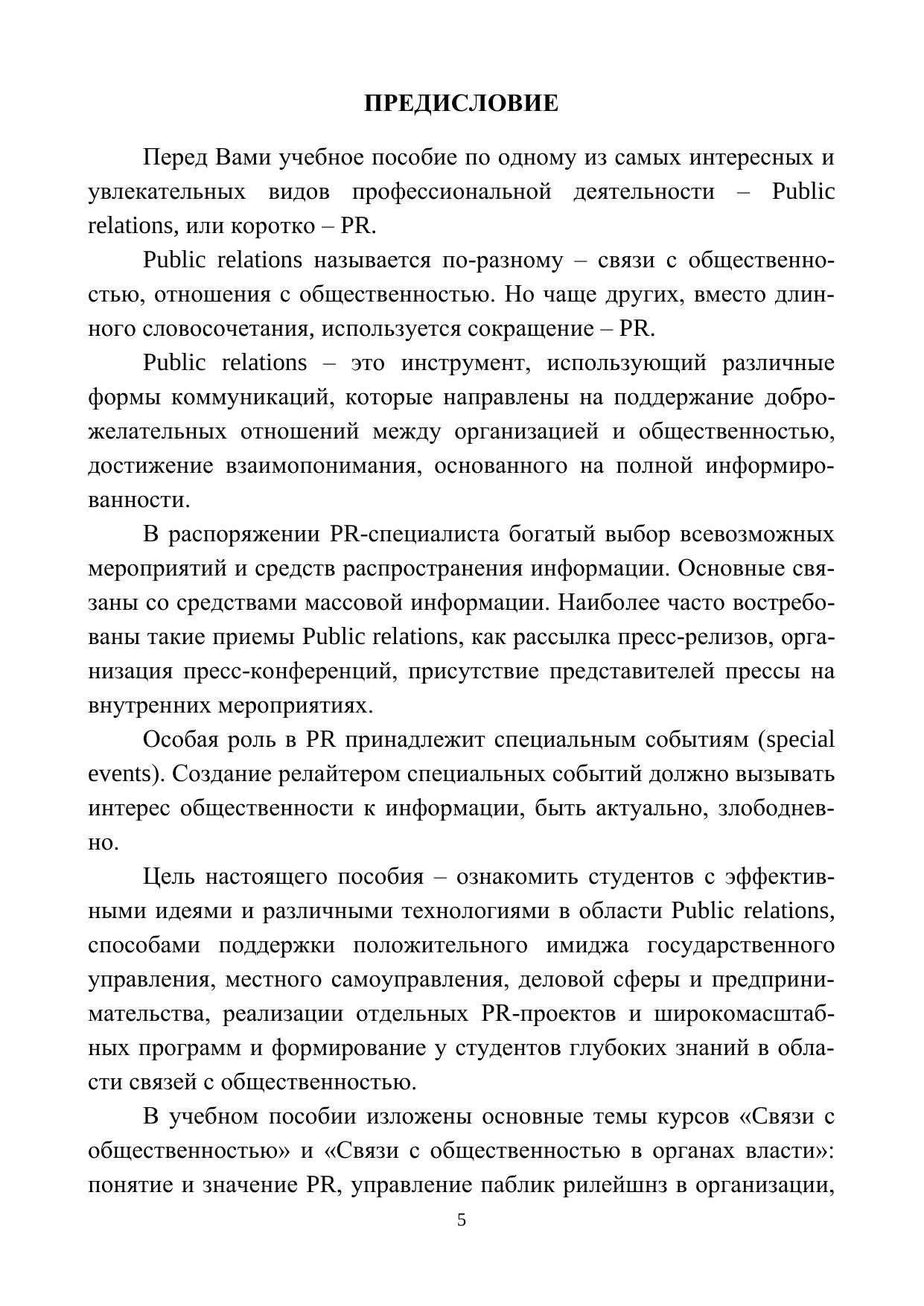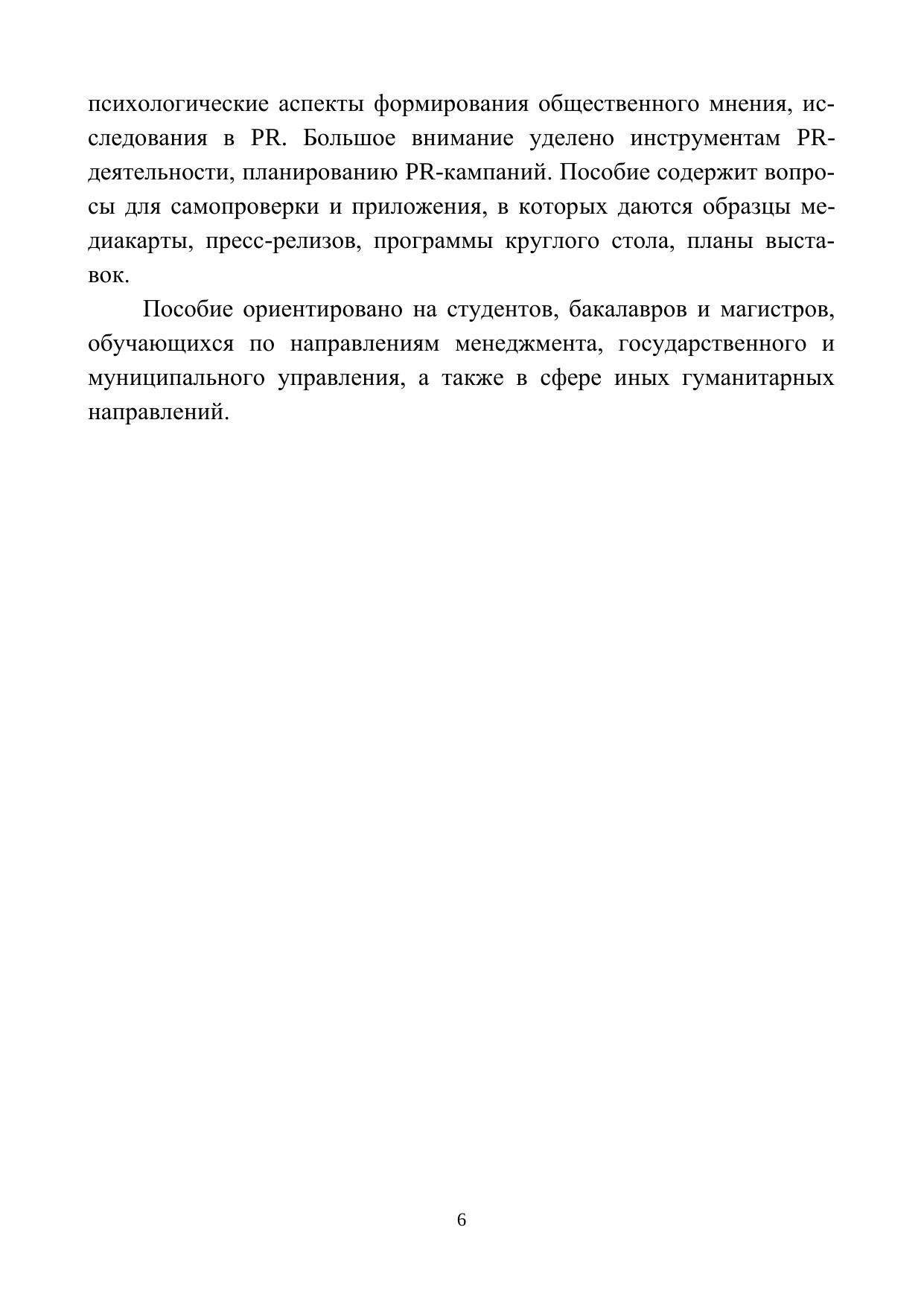 В учебном пособии изложены основные темы курсов «Cвязи с общественностью» и «Связи с общественностью в органах власти»: понятие и значение PR, управление паблик рилейшнз в организации, психологические аспекты формирования общественного мнения, исследования в PR. Большое внимание уделено инструментам PR-деятельности, планированию PR-кампаний. Пособие содержит вопросы для самопроверки и приложения, в которых даются образцы медиакарты, пресс-релизов, программы круглого стола, планы выставок. Содержание пособия позволит освоить основы теории и практики PR и использовать полученные знания в практической деятельности. Пособие предназначено для студентов направлений подготовки 38.04.02 – Менеджмент и 38.03.04 – Государственное и муниципальное управлени