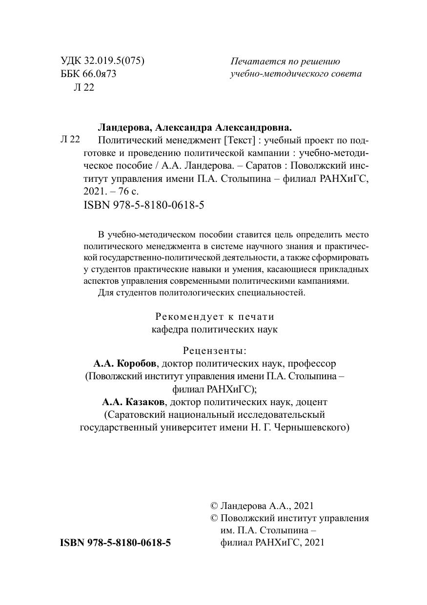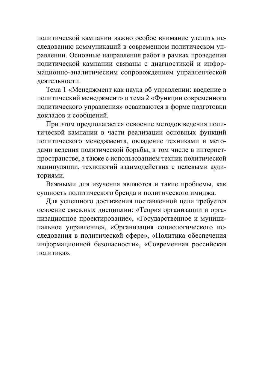 В учебно-методическом пособии ставится цель определить место политического менеджмента в системе научного знания и практической государственно-политической деятельности, а также сформировать у студентов практические навыки и умения, касающиеся прикладных аспектов управления современными политическими кампаниями. Для студентов политологических специальностей.