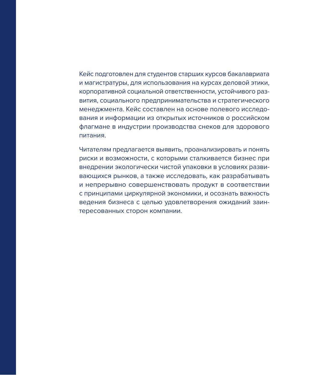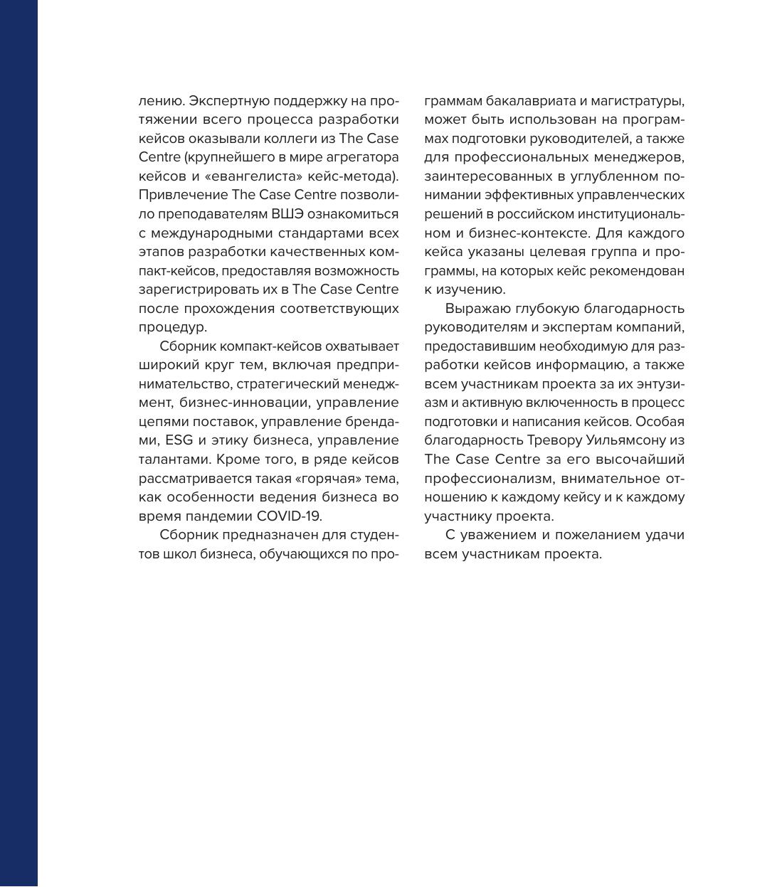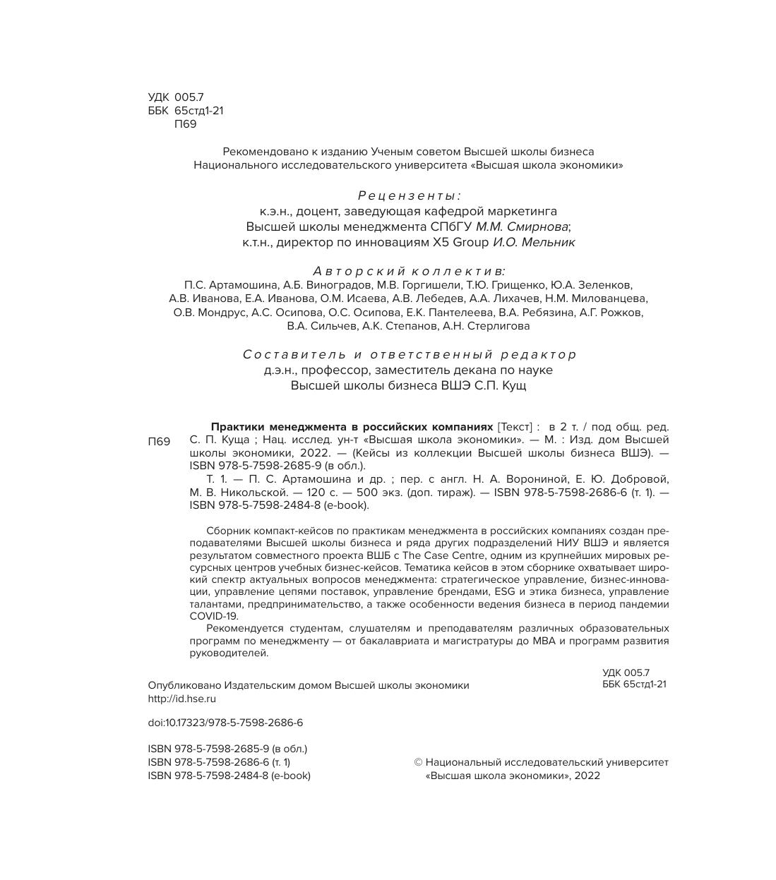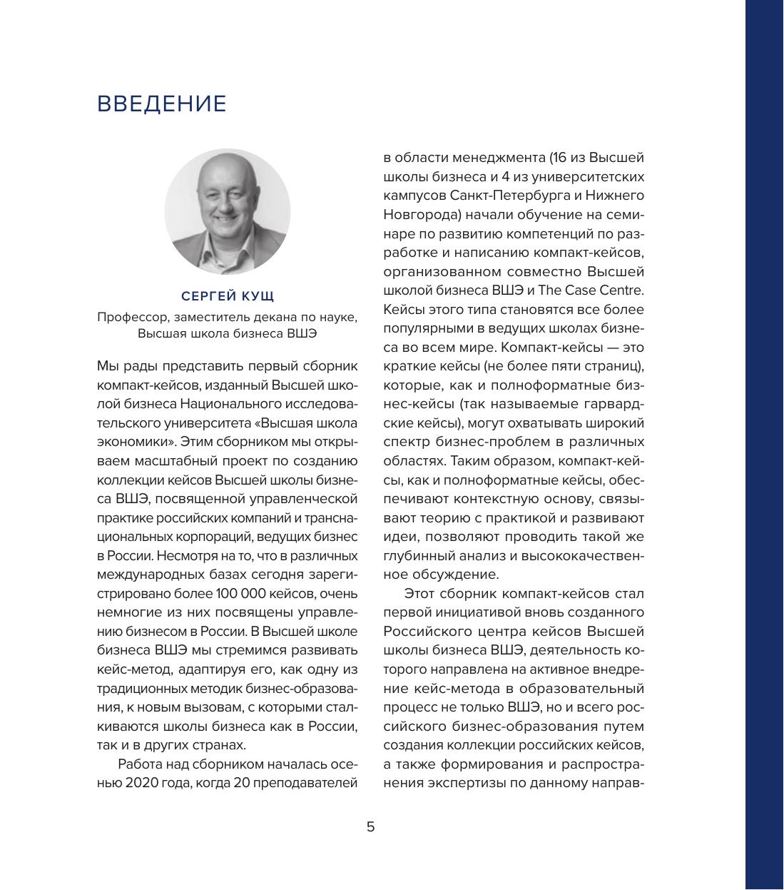 Сборник компакт-кейсов по практикам менеджмента в российских компаниях создан преподавателями Высшей школы бизнеса и ряда других подразделений НИУ ВШЭ и является результатом совместного проекта ВШБ с The Case Centre, одним из крупнейших мировых ресурсных центров учебных бизнес-кейсов. Тематика кейсов в этом сборнике охватывает широкий спектр актуальных вопросов менеджмента: стратегическое управление, бизнес-инновации, управление цепями поставок, управление брендами, ESG и этика бизнеса, управление талантами, предпринимательство, а также особенности ведения бизнеса в период пандемии COVID-19.
