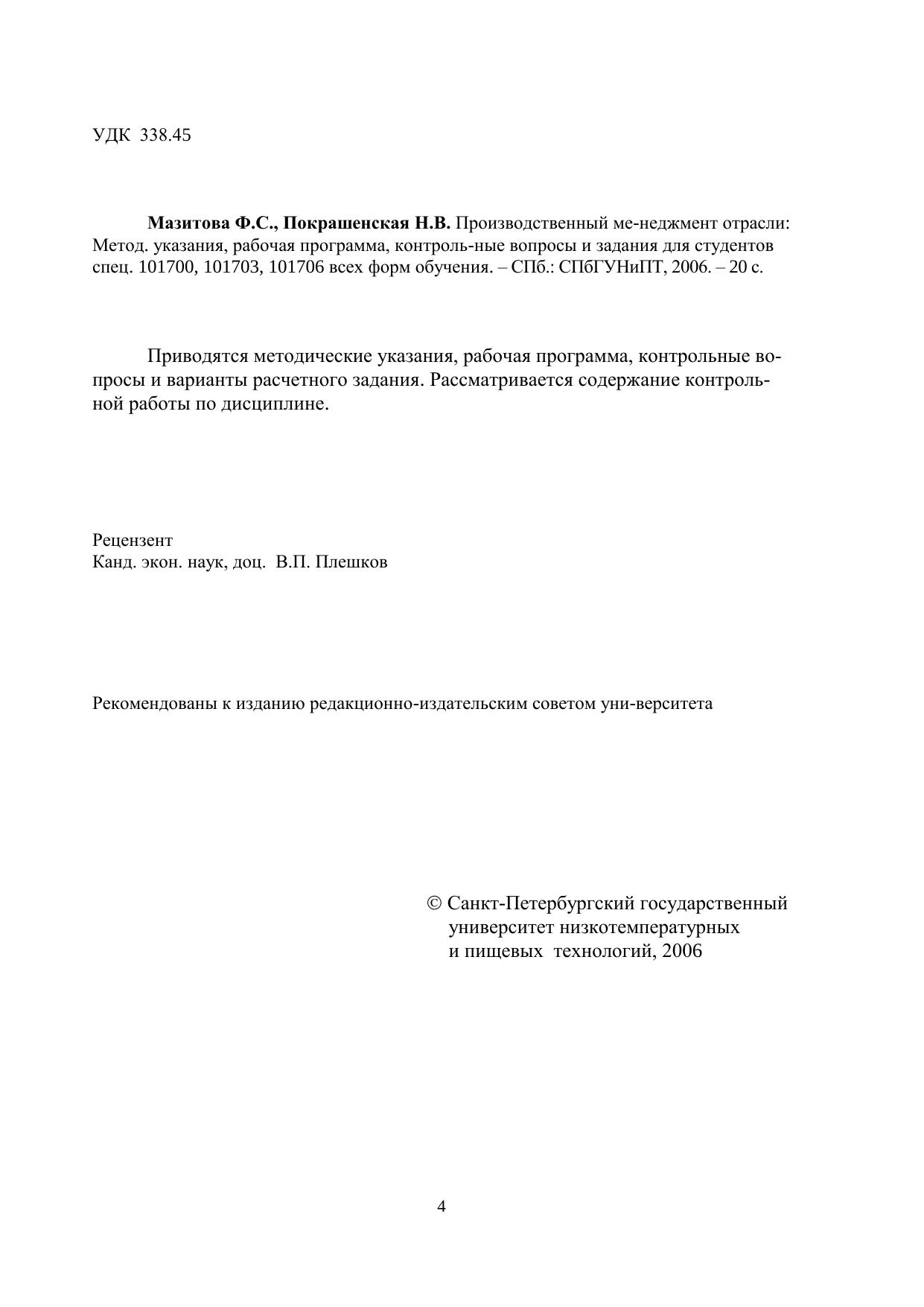Производственный менеджмент отрасли: Методические указания, рабочая программа, контрольные вопросы и задания для студентов спец. 101700, 101703, 101706 всех форм обучения