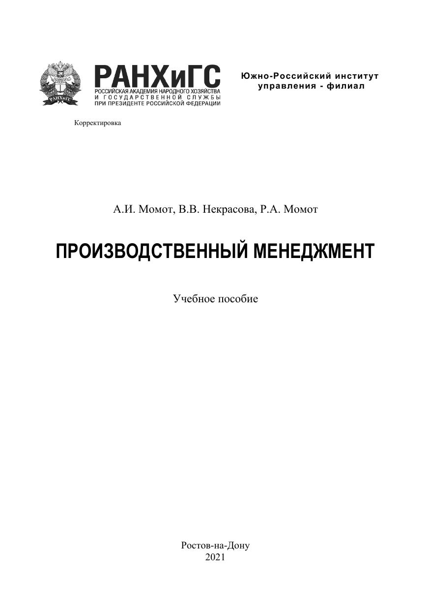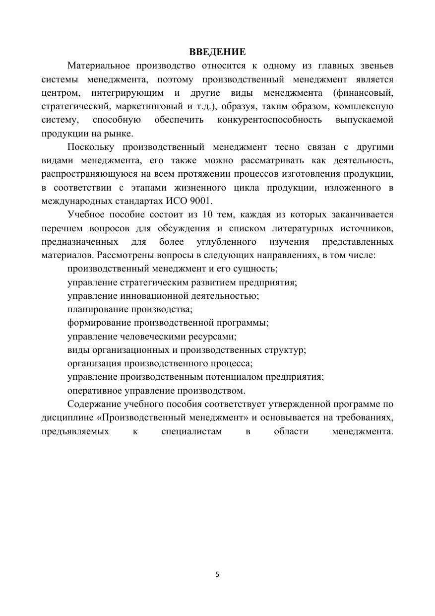 В учебном пособии рассматриваются составляющие элементы производственного менеджмента: управление стратегическим развитием предприятия; управление инновационной деятельностью; планирование производства; формирование производственной программы. Дается характеристика видов организационных и производственных структур; уделяется внимание управлению человеческими ресурсами, организации производственного процесса, управлению производственным потенциалом и оперативному управлению производством. Учебное пособие предназначено для студентов высших учебных заведений экономического профиля, изучающих курс "Производственный менеджмент" специальности «Менеджмент», а также практических работников, менеджеров производственных предприятий.