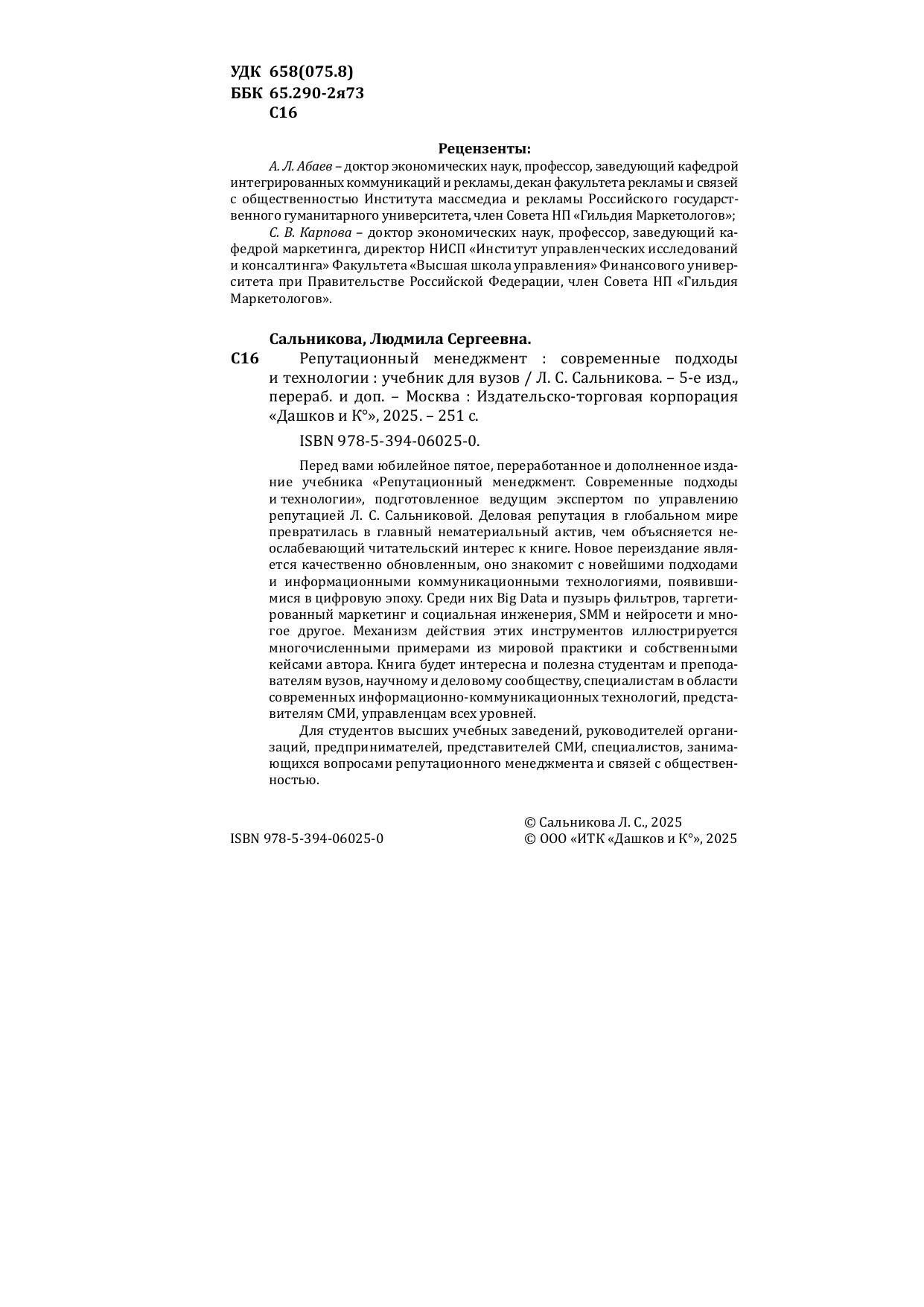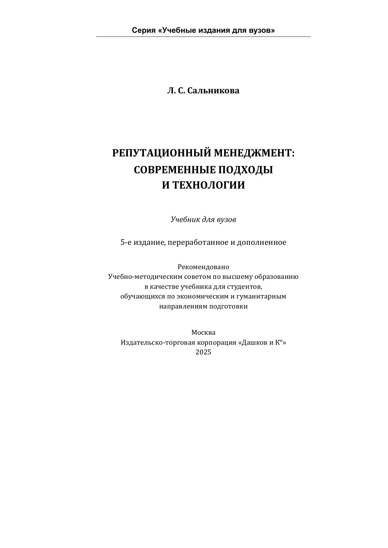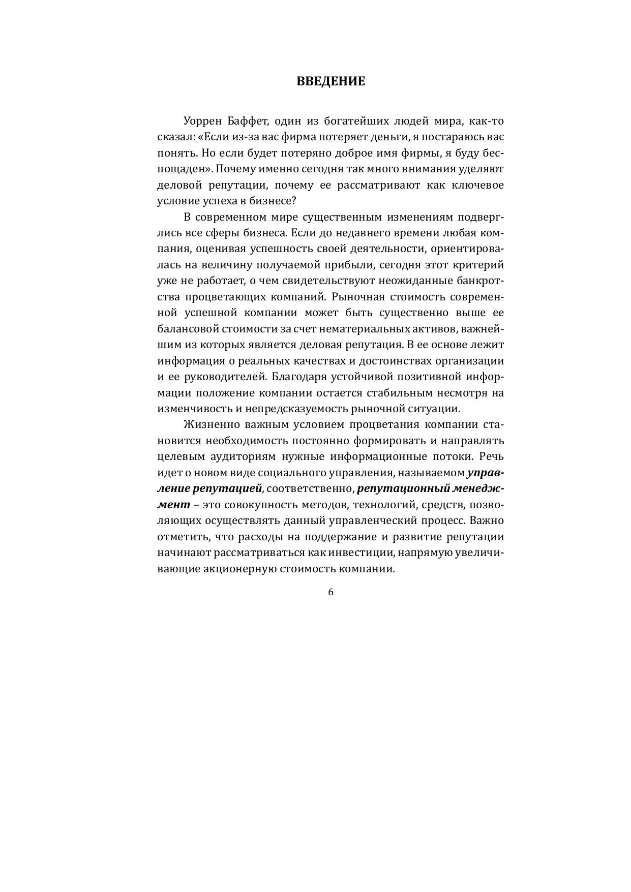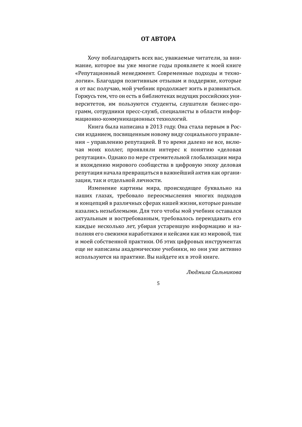 Перед вами юбилейное пятое, переработанное и дополненное издание учебника «Репутационный менеджмент. Современные подходы и технологии», подготовленное ведущим экспертом по управлению репутацией Л. С. Сальниковой. Деловая репутация в глобальном мире превратилась в главный нематериальный актив, чем объясняется неослабевающий читательский интерес к книге. Новое переиздание является качественно обновленным, оно знакомит с новейшими подходами и информационными коммуникационными технологиями, появившимися в цифровую эпоху. Среди них Big Data и пузырь фильтров, таргетированный маркетинг и социальная инженерия, SMM и нейросети и многое другое. Механизм действия этих инструментов иллюстрируется многочисленными примерами из мировой практики и собственными кейсами автора. Книга будет интересна и полезна студентам и преподавателям вузов, научному и деловому сообществу, специалистам в области современных информационно-коммуникационных технологий, представителям СМИ, управленцам всех уровней. Для студентов высших учебных заведений, руководителей организаций, предпринимателей, представителей СМИ, специалистов, занимающихся вопросами репутационного менеджмента и связей с общественностью.