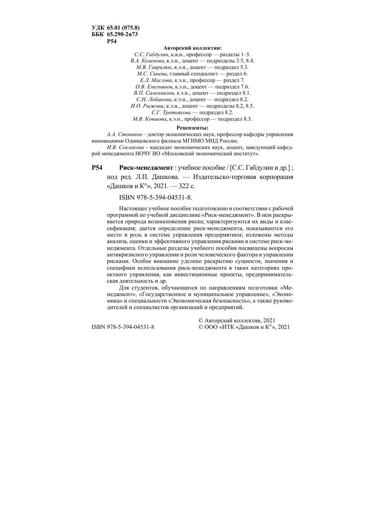 Отдельные разделы учебного пособия посвящены вопросам антикризисного управления и роли человеческого фактора в управлении рисками. Особое внимание уделено раскрытию сущности, значения и специфики использования риск-менеджмента в таких категориях проектного управления, как инвестиционные проекты, предпринимательская деятельность и др.