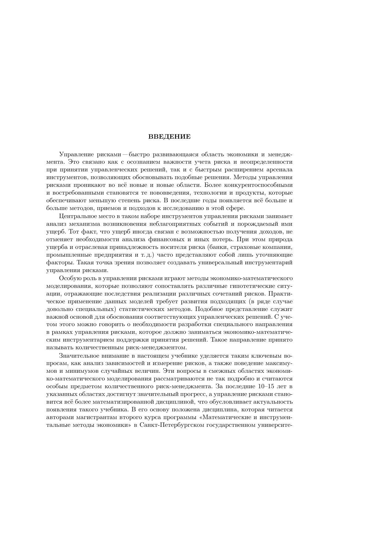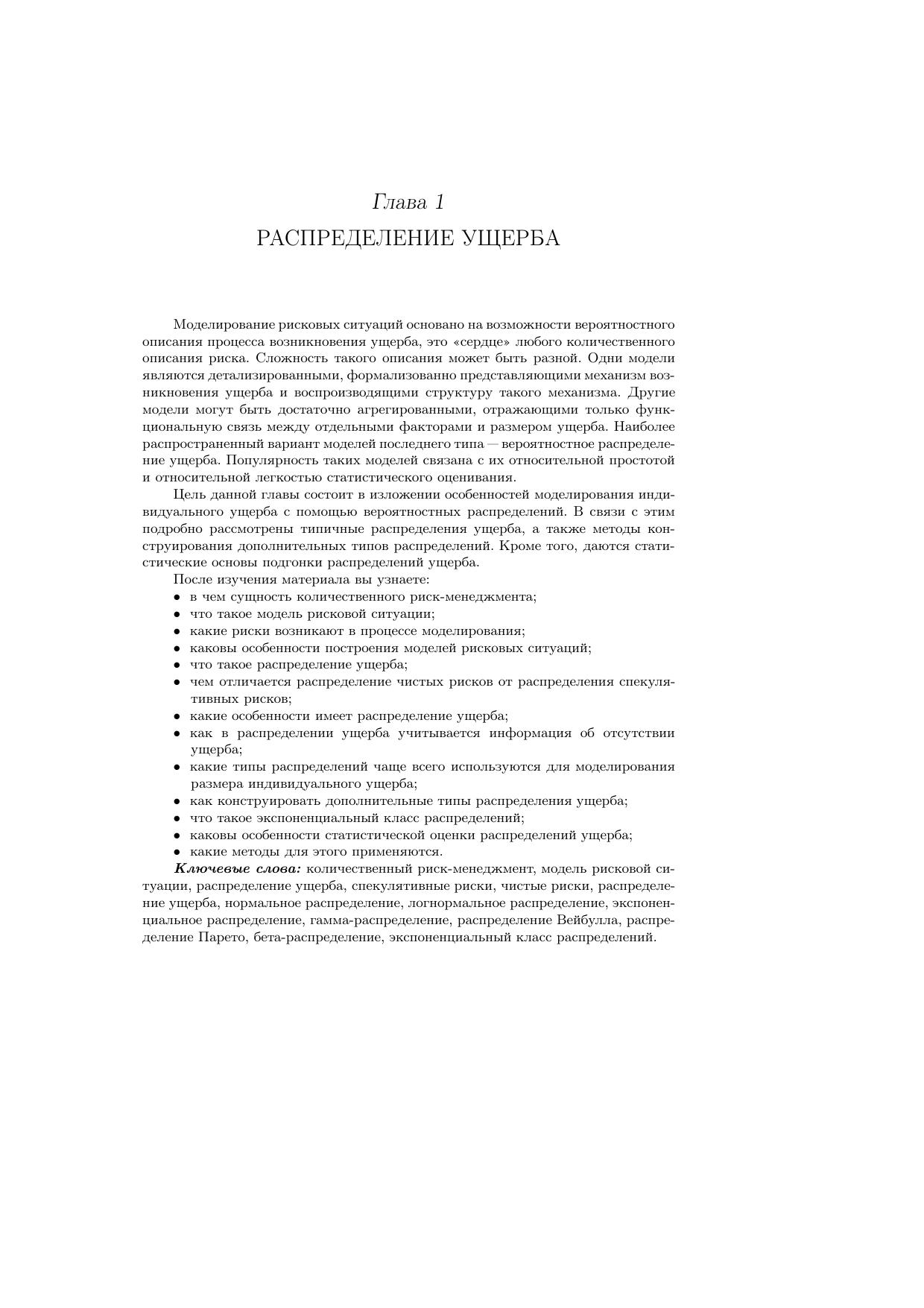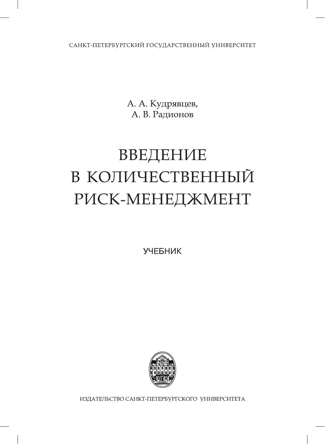 Настоящий учебник содержит материал по изучению количественных методов, применяемых в области управления рисками. Основное внимание уделяется вопросам оценки вероятностных распределений ущерба — как индивидуального, так и совокупного, для портфеля рисков в целом. В этом контексте подробно рассматриваются такие аспекты, как анализ стохастических зависимостей и эффекты, вызываемые неоднородностями статистических выборок, а также поведение максимумов и минимумов случайных величин. Необходимость учета подобных аспектов при решении практических проблем экономики и бизнеса часто затрудняют применение стандартных статистических методов. Кроме того, в книге дается введение в теорию количественной оценки риска, являющейся основой экономико-математического моделирования в области управления рисками. Для студентов, магистрантов и аспирантов, специализирующихся в вопросах управления рисками или в области экономико-математического моделирования, а также для всех интересующихся указанными проблемами.