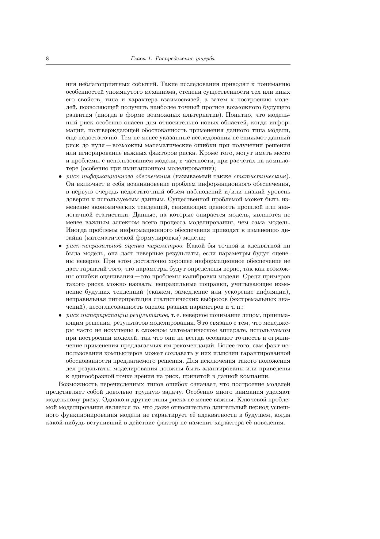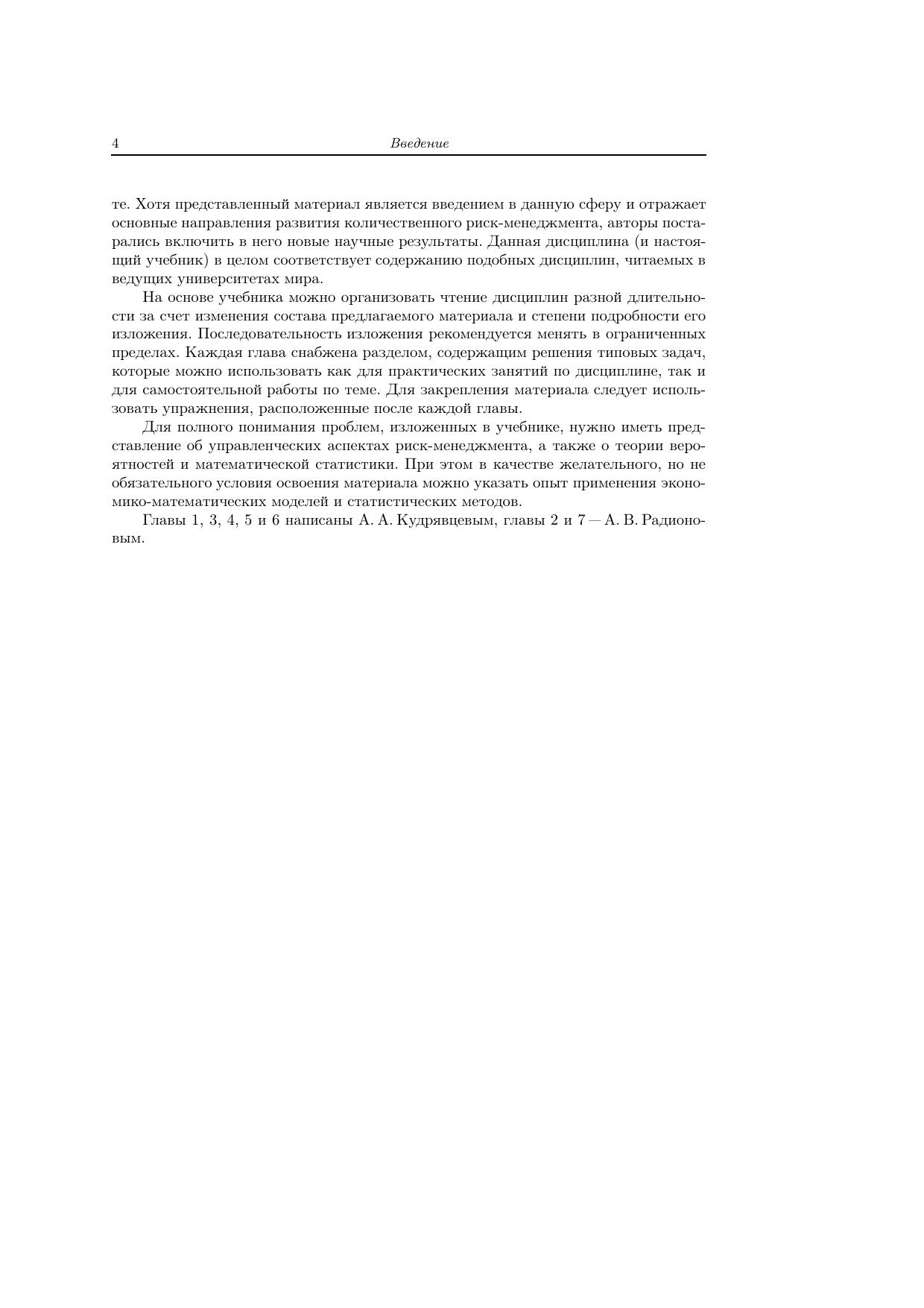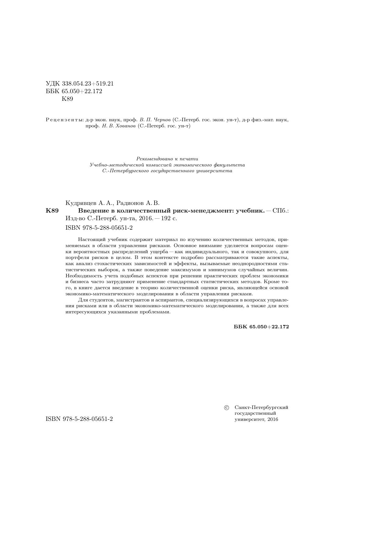 Настоящий учебник содержит материал по изучению количественных методов, применяемых в области управления рисками. Основное внимание уделяется вопросам оценки вероятностных распределений ущерба — как индивидуального, так и совокупного, для портфеля рисков в целом. В этом контексте подробно рассматриваются такие аспекты, как анализ стохастических зависимостей и эффекты, вызываемые неоднородностями статистических выборок, а также поведение максимумов и минимумов случайных величин. Необходимость учета подобных аспектов при решении практических проблем экономики и бизнеса часто затрудняют применение стандартных статистических методов. Кроме того, в книге дается введение в теорию количественной оценки риска, являющейся основой экономико-математического моделирования в области управления рисками. Для студентов, магистрантов и аспирантов, специализирующихся в вопросах управления рисками или в области экономико-математического моделирования, а также для всех интересующихся указанными проблемами.