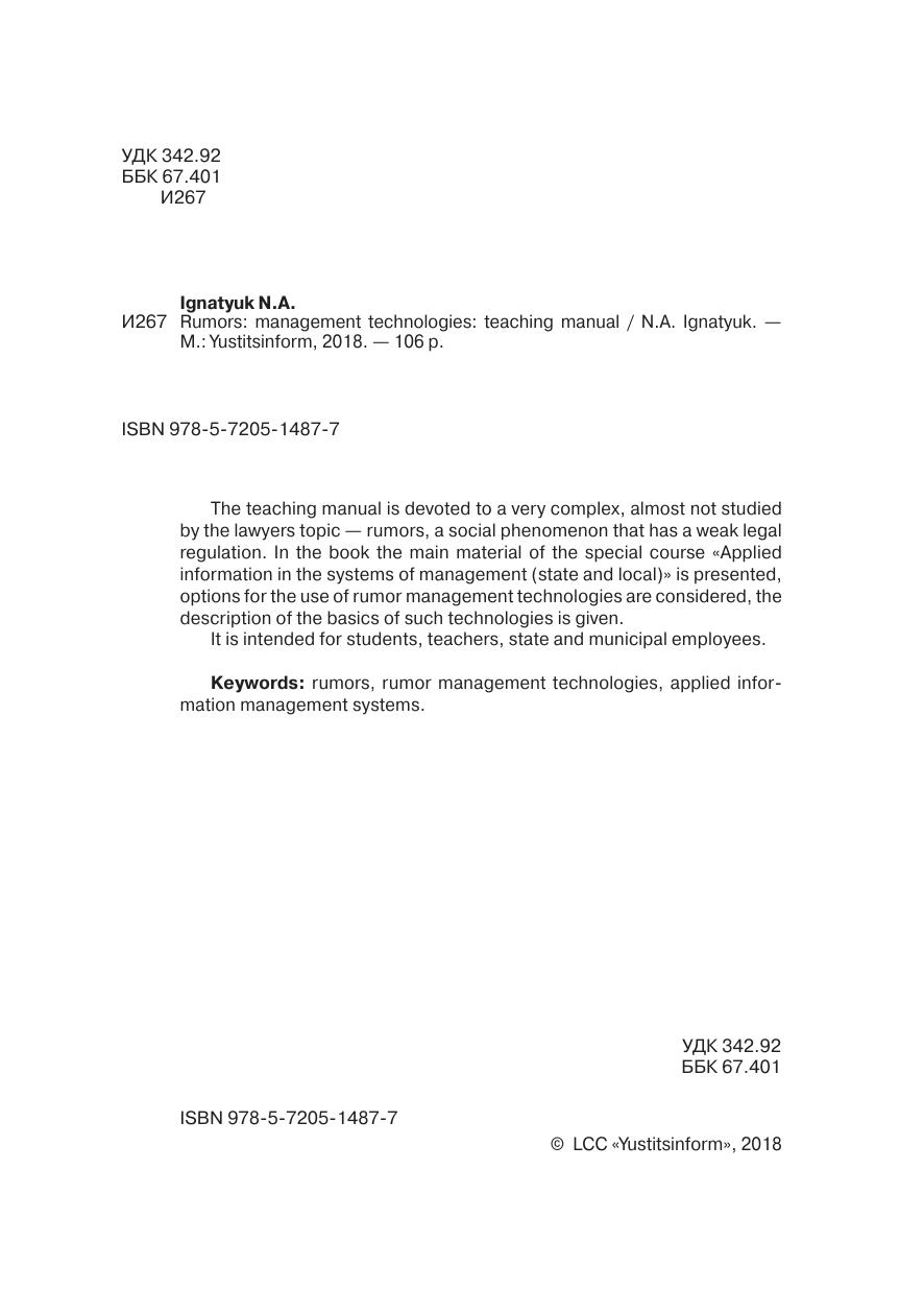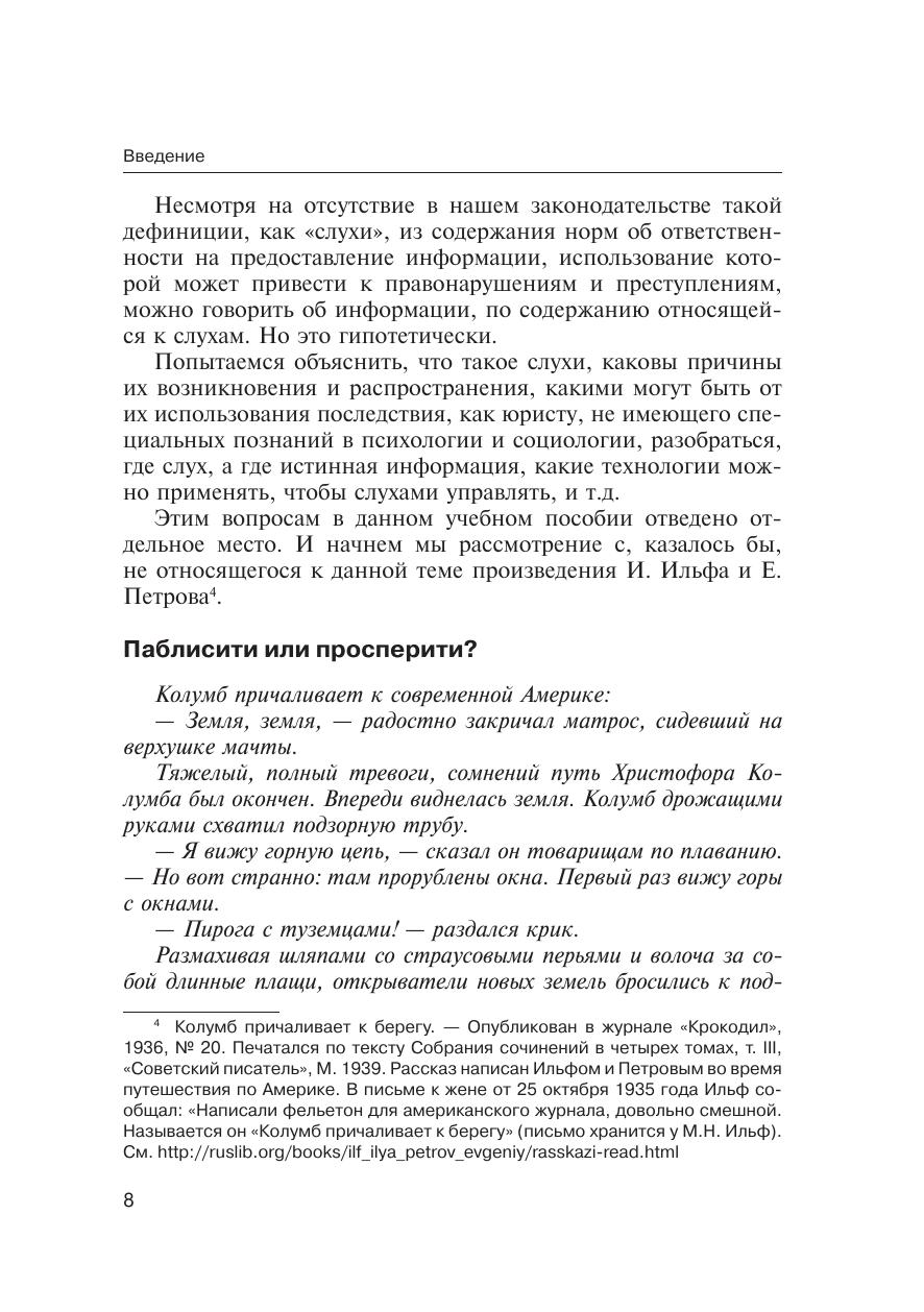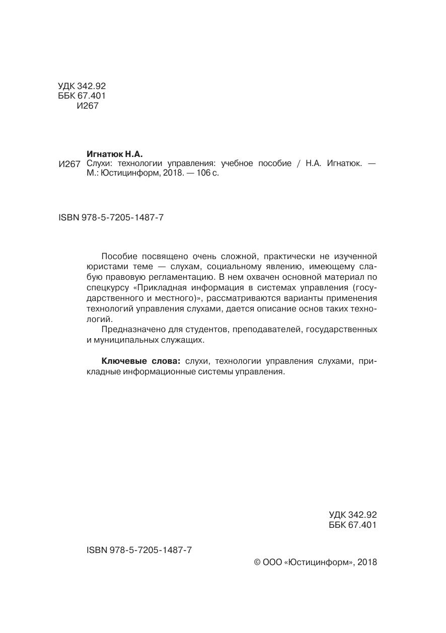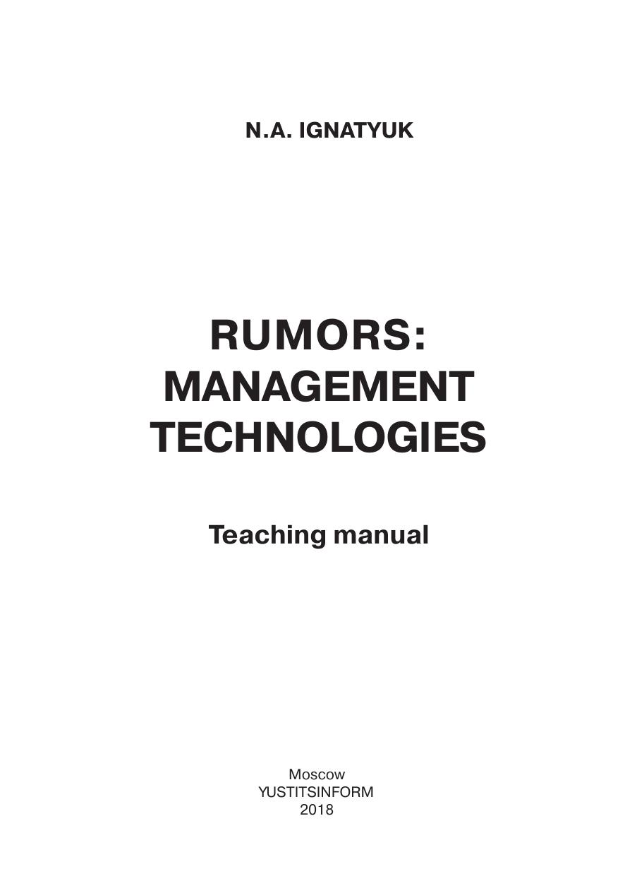 Пособие посвящено очень сложной, практически не изученной юристами теме — слухам, социальному явлению, имеющему слабую правовую регламентацию. В нем охвачен основной материал по спецкурсу «Прикладная информация в системах управления (государственного и местного)», рассматриваются варианты применения технологий управления слухами, дается описание основ таких технологий.