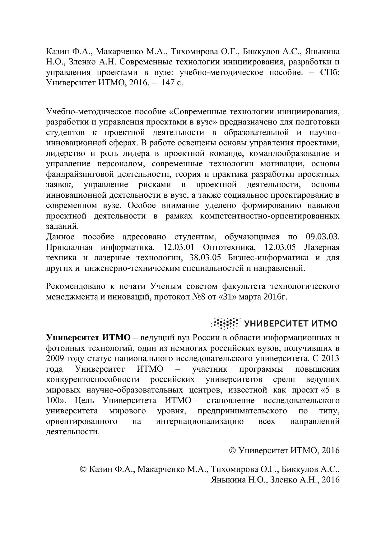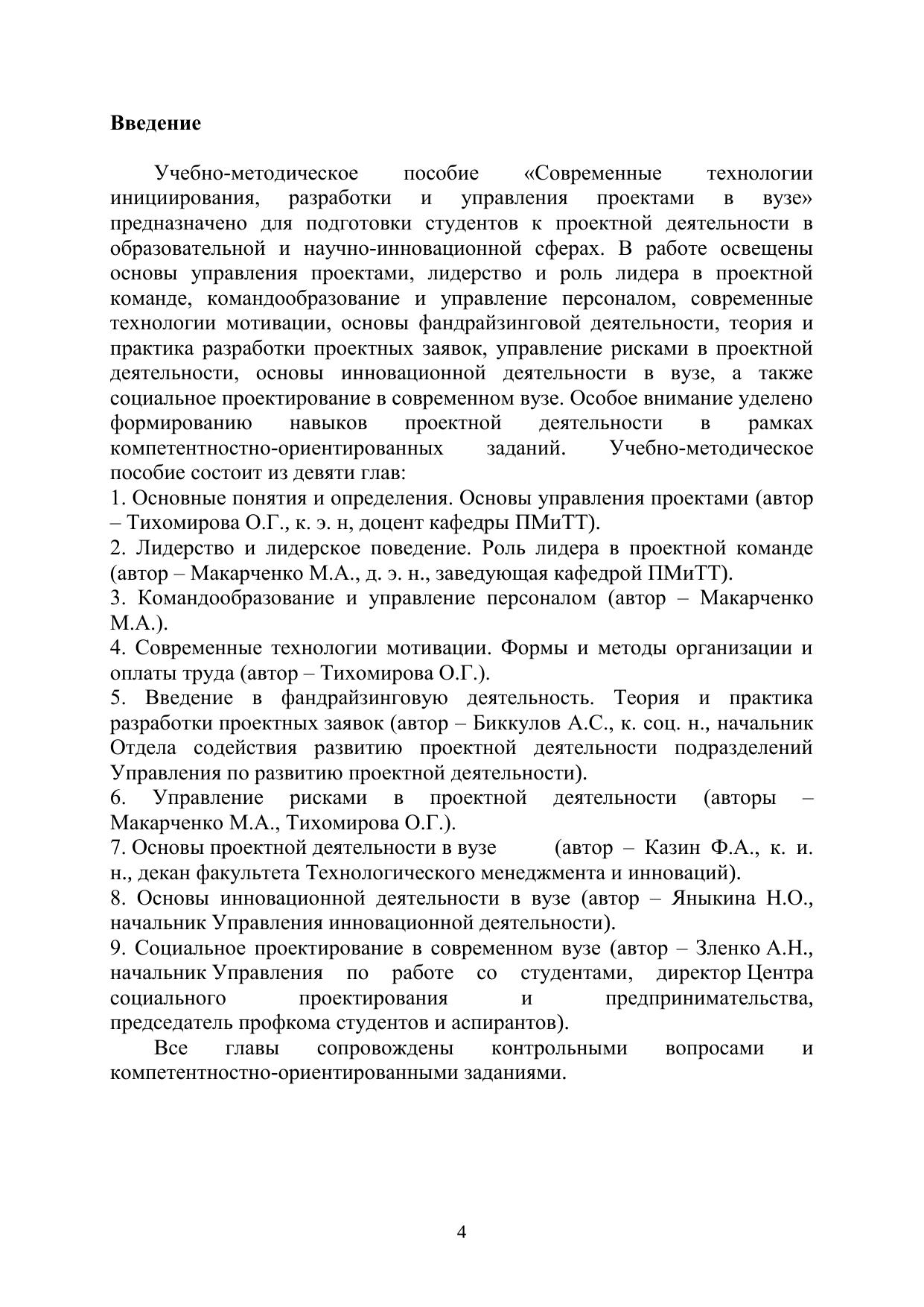 Учебно-методическое пособие «Современные технологии инициирования, разработки и управления проектами в вузе» предназначено для подготовки студентов к проектной деятельности в образовательной и научно-инновационной сферах. В работе освещены основы управления проектами, лидерство и роль лидера в проектной команде, командообразование и управление персоналом, современные технологии мотивации, основы фандрайзинговой деятельности, теория и практика разработки проектных заявок, управление рисками в проектной деятельности, основы инновационной деятельности в вузе, а также социальное проектирование в современном вузе. Особое внимание уделено формированию навыков проектной деятельности в рамках компетентностно-ориентированных заданий.
