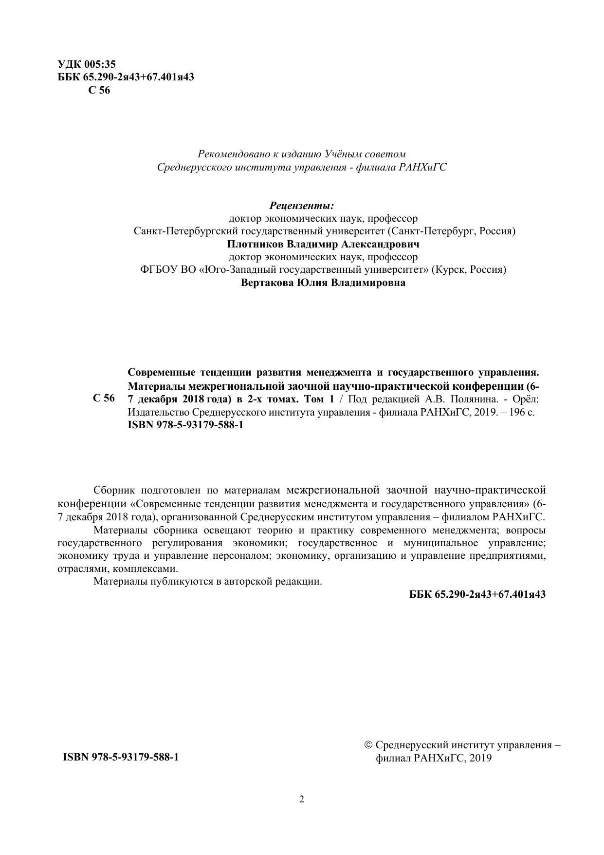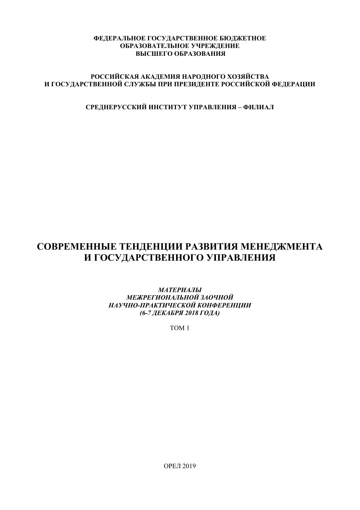 Современные тенденции развития менеджмента и государственного управления. Материалы межрегиональной заочной научно-практической конференции (6- 7 декабря 2018 года) в 2-х томах. Том 1