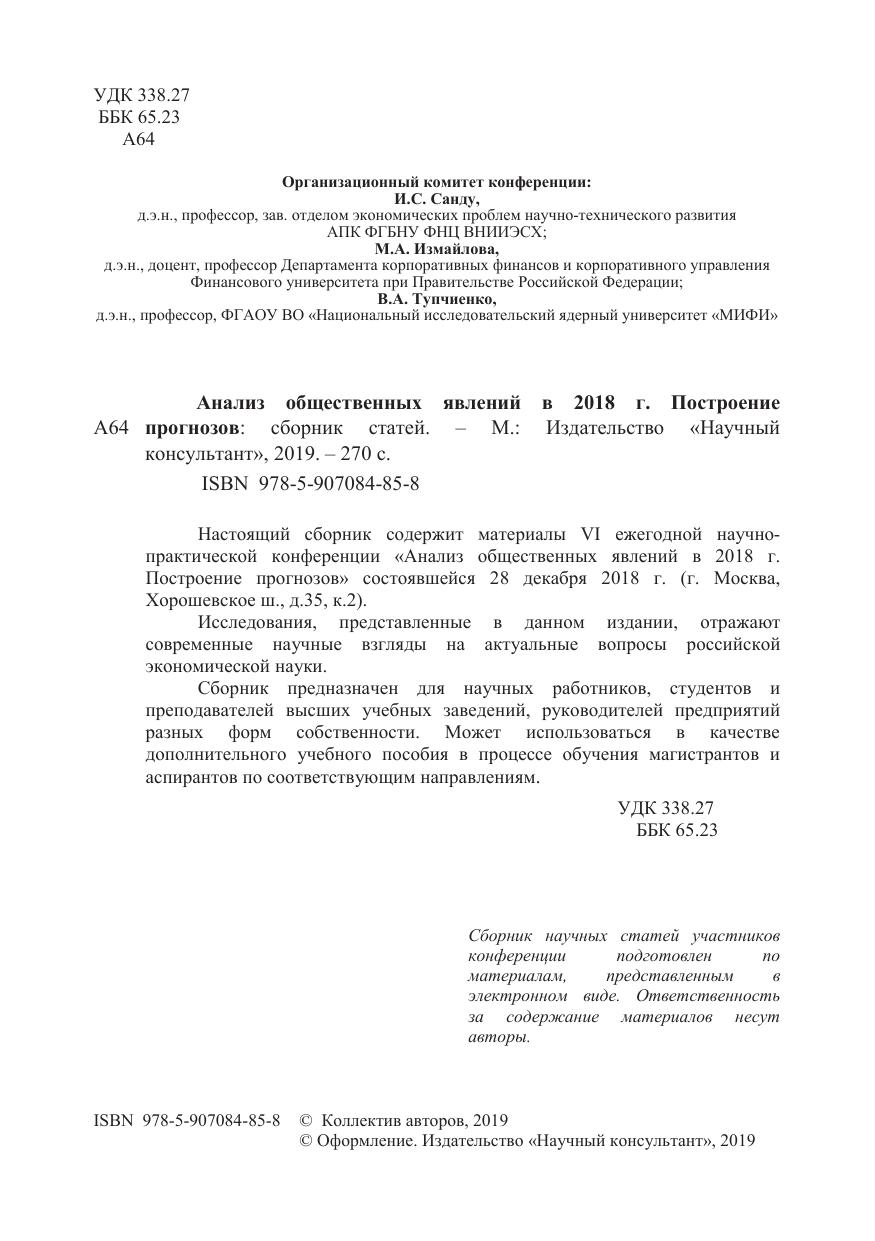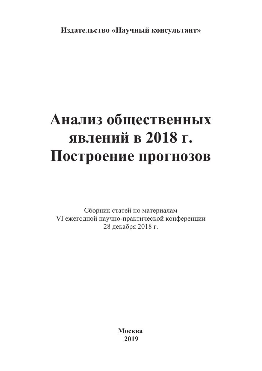 Сборник научных трудов. Настоящий сборник содержит материалы VI ежегодной научно-практической конференции «Анализ общественных явлений в 2018 г. Построение прогнозов», состоявшейся 28 декабря 2018г. (г. Москва, Хорошевское шоссе, д. 35 к.2.
