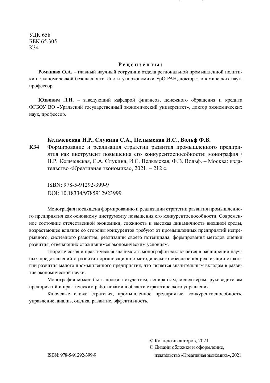 Теоретическая и практическая значимость монографии заключается в расширении научных представлений о развитии организационно-методического обеспечения реализации стратегии развития малого промышленного предприятия, что является значительным вкладом в развитие экономической науки.