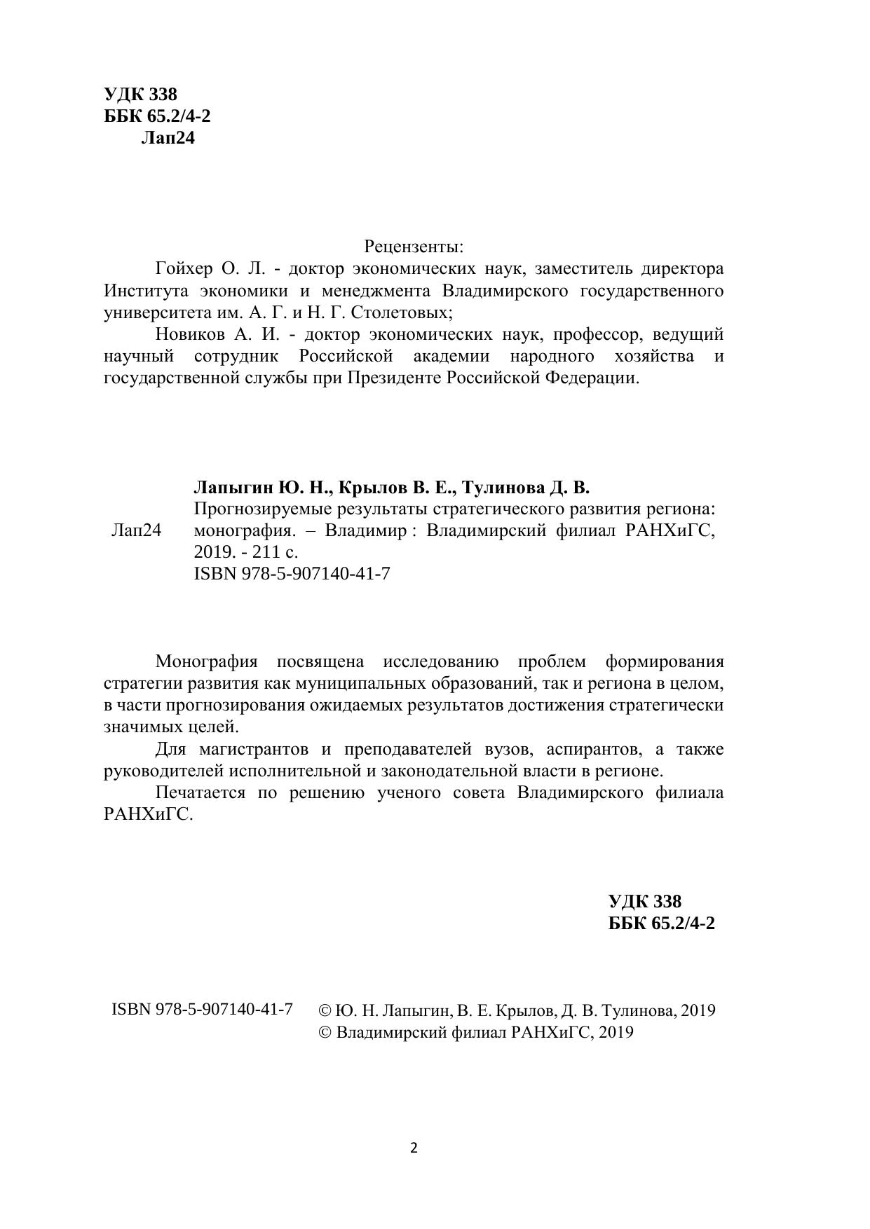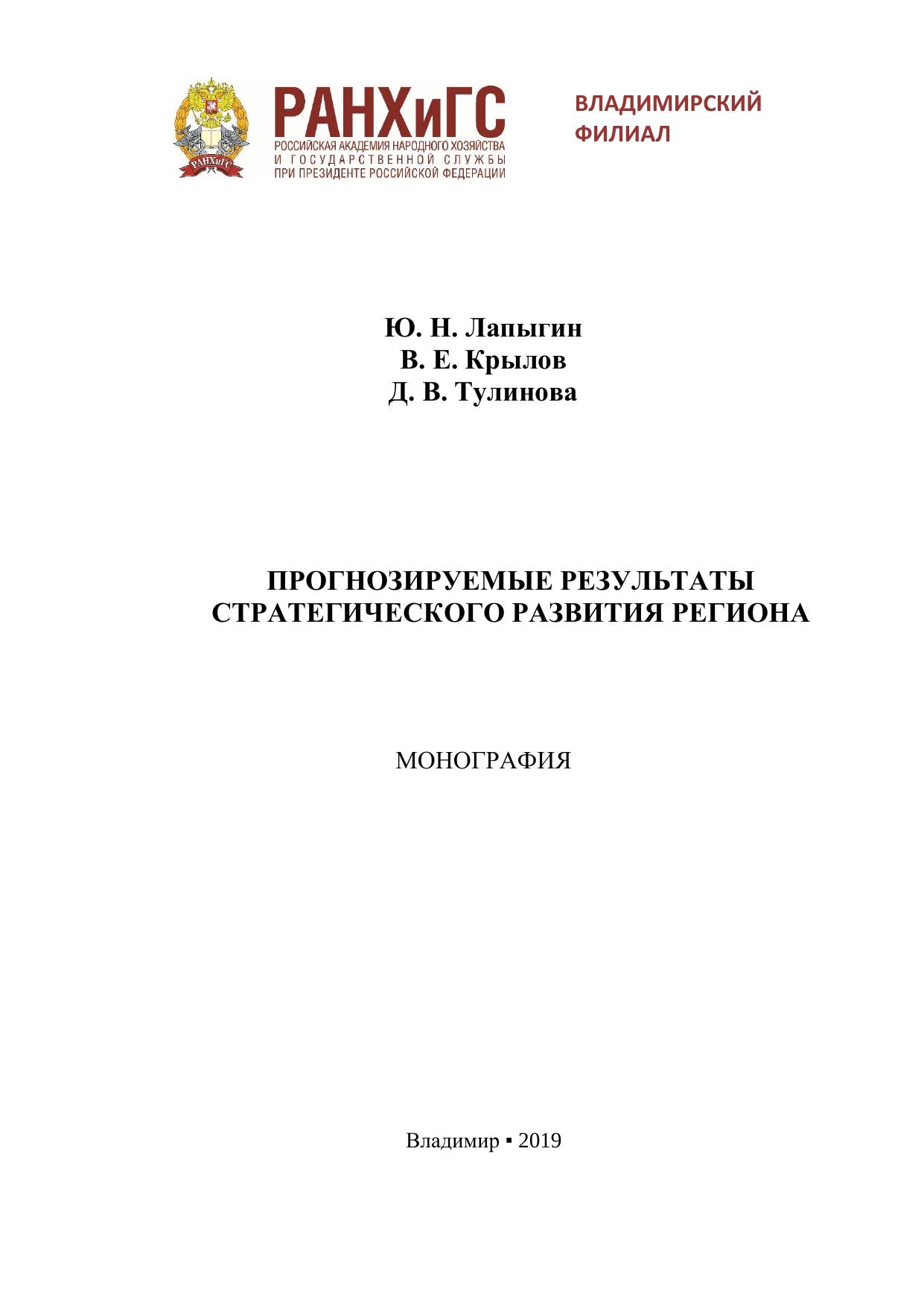 Монография посвящена исследованию проблем формирования стратегии развития как муниципальных образований, так и региона в целом, в части прогнозирования ожидаемых результатов достижения стратегически значимых целей. Для магистрантов и преподавателей вузов, аспирантов, а также руководителей исполнительной и законодательной власти в регионе. Печатается по решению ученого совета Владимирского филиала РАНХиГС.