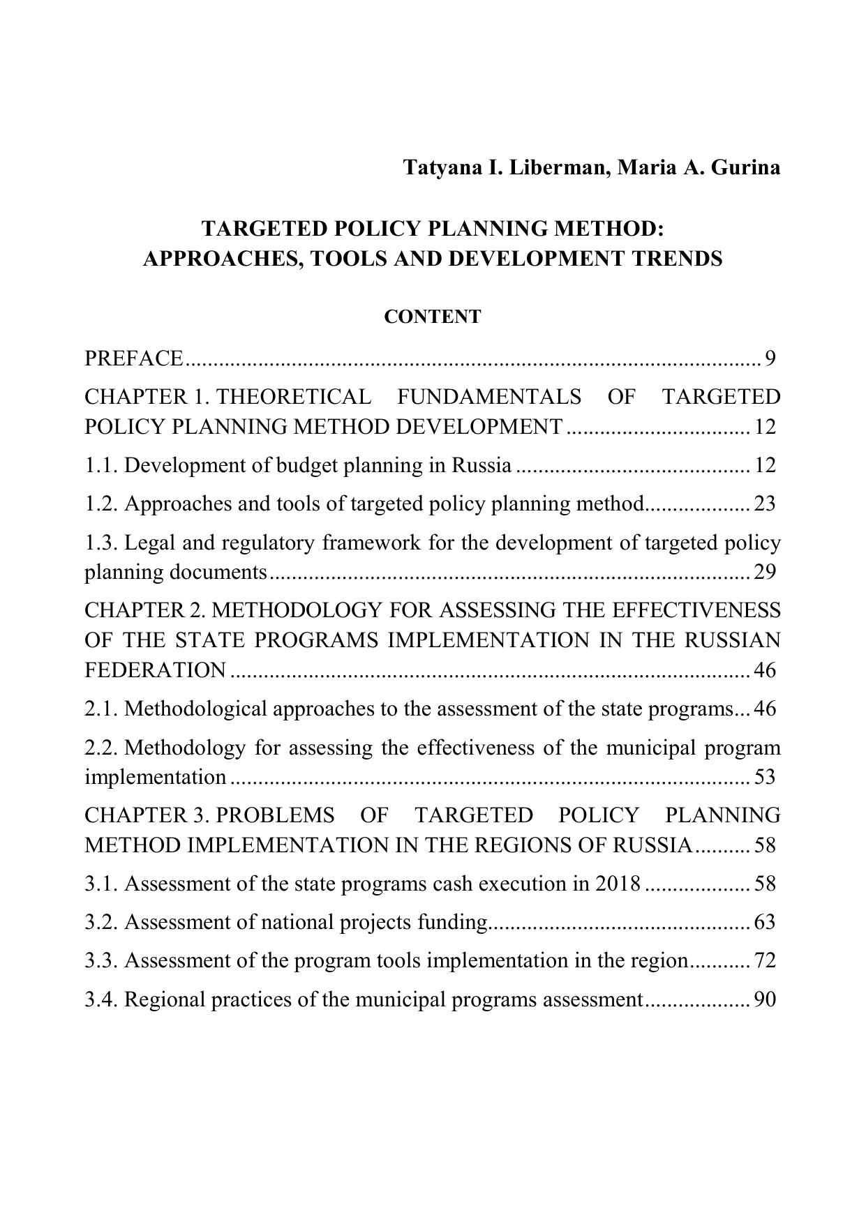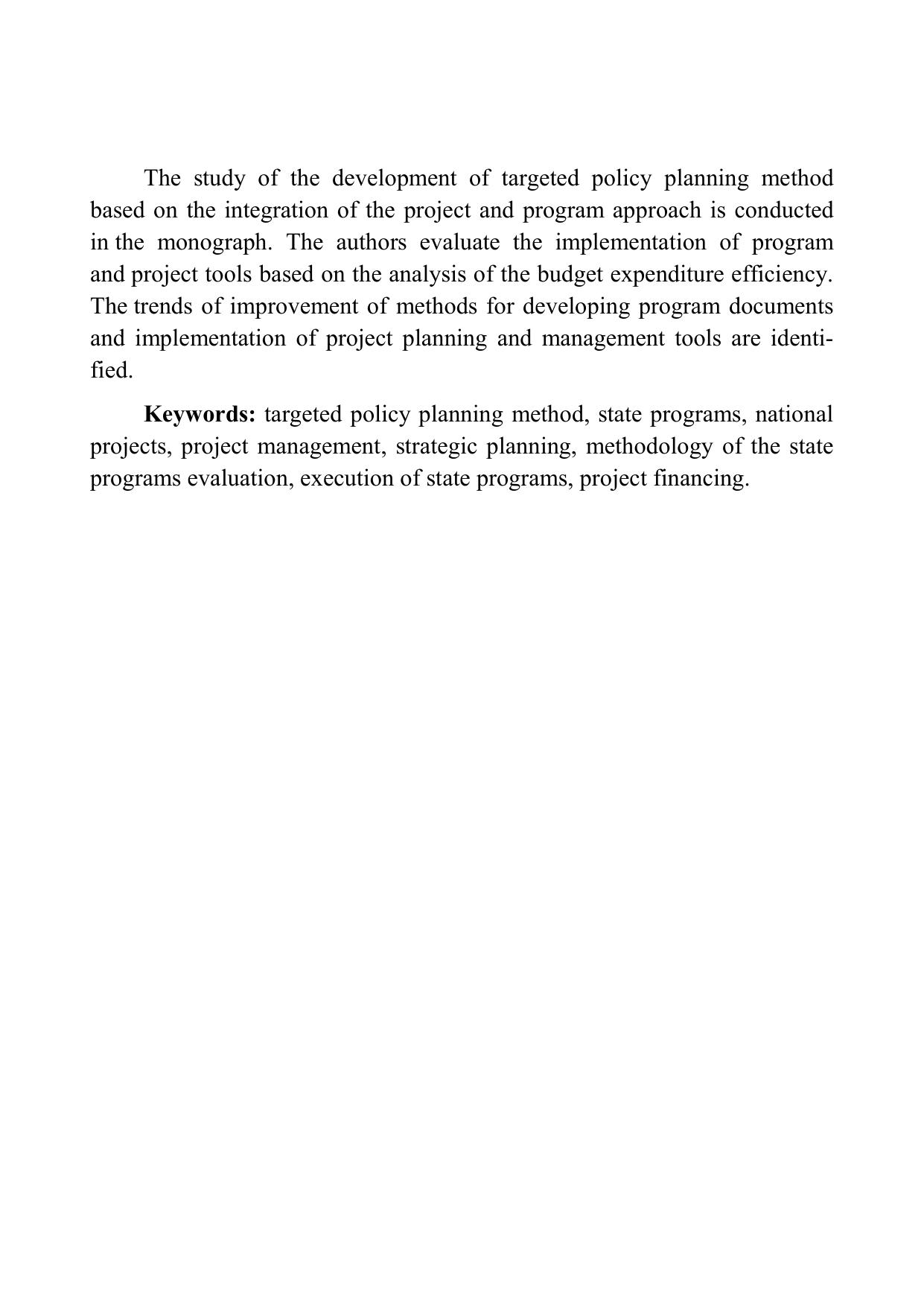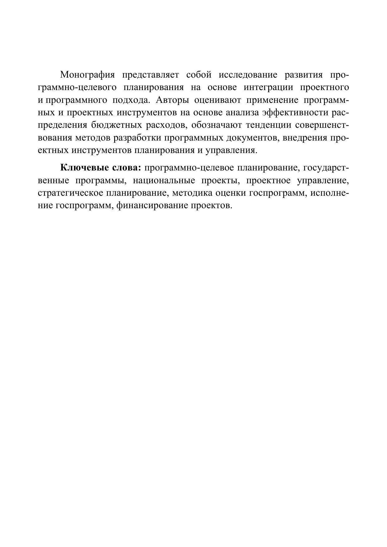Монография представляет собой исследование развития программноцелевого планирования на основе интеграции проектного и программного подхода. Авторы оценивают применение программных и проектных инструментов на основе анализа эффективности распределения бюджетных расходов, обозначают тенденции совершенствования методов разработки программных документов, внедрения проектных инструментов планирования и управления.