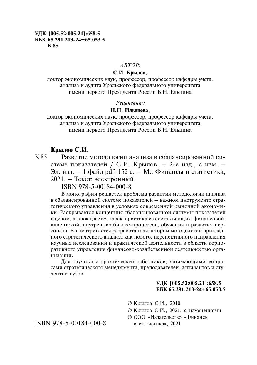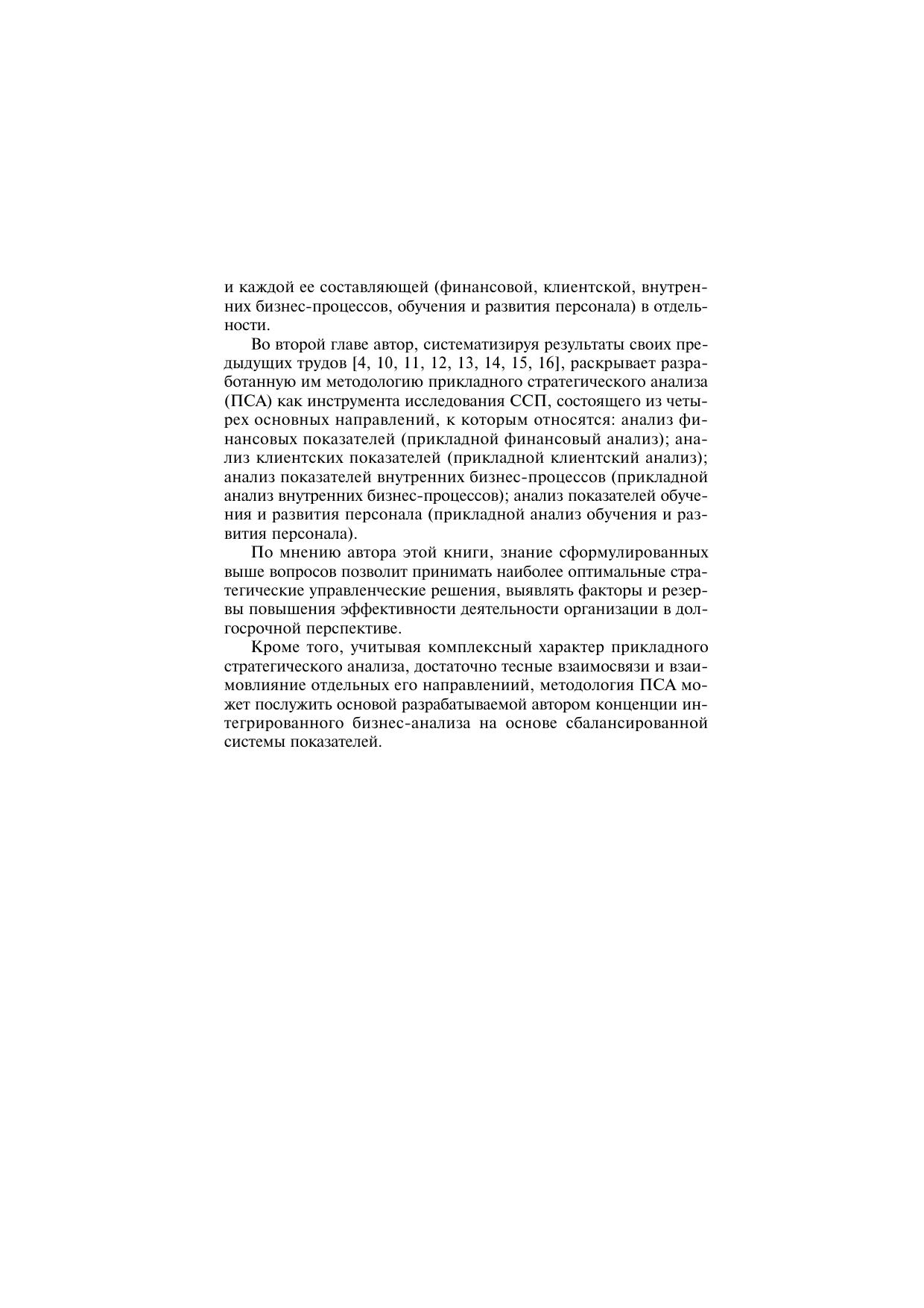 В монографии решается проблема развития методологии анализа в сбалансированной системе показателей – важном инструменте стратегического управления в условиях современной рыночной экономики. Раскрывается концепция сбалансированной системы показателей в целом, а также дается характеристика ее составляющих: финансовой, клиентской, внутренних бизнес-процессов, обучения и развития персонала. Рассматривается разработанная автором методология прикладного стратегического анализа как нового, перспективного направления научных исследований и практической деятельности в области корпоративного управления финансово-хозяйственной деятельностью организации.