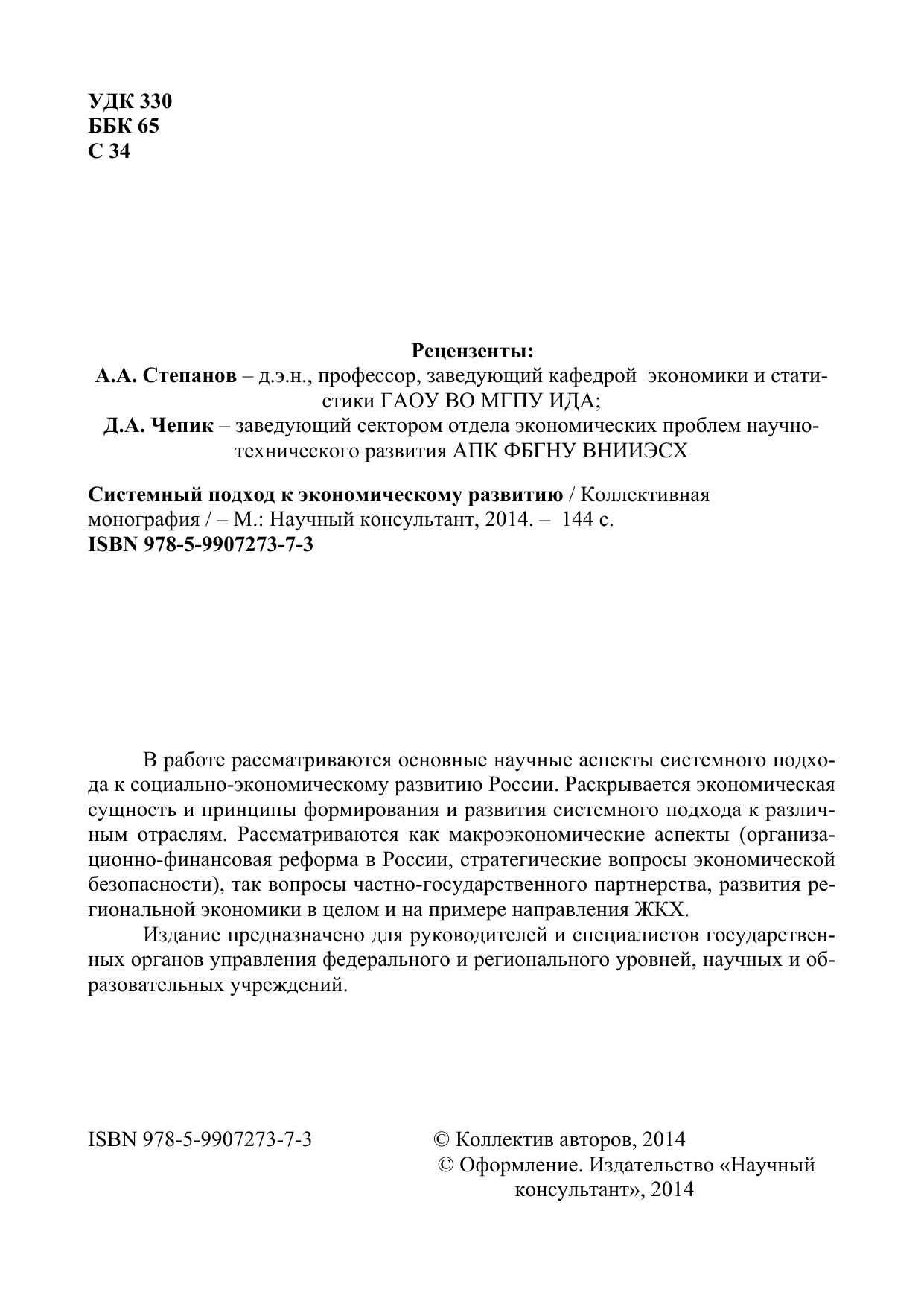 В работе рассматриваются основные научные аспекты системного подхода к социально-экономическому развитию России. Раскрывается экономическая сущность и принципы формирования и развития системного подхода к различным отраслям. Рассматриваются как макроэкономические аспекты (организационно-финансовая реформа в России, стратегические вопросы экономической безопасности), так вопросы частно-государственного партнерства, развития региональной экономики в целом и на примере направления ЖКХ. Издание предназначено для руководителей и специалистов государственных органов управления федерального и регионального уровней, научных и образовательных учреждений.