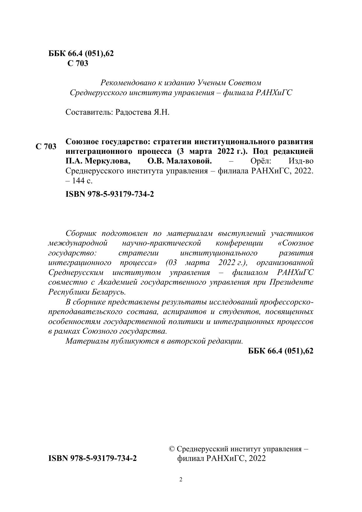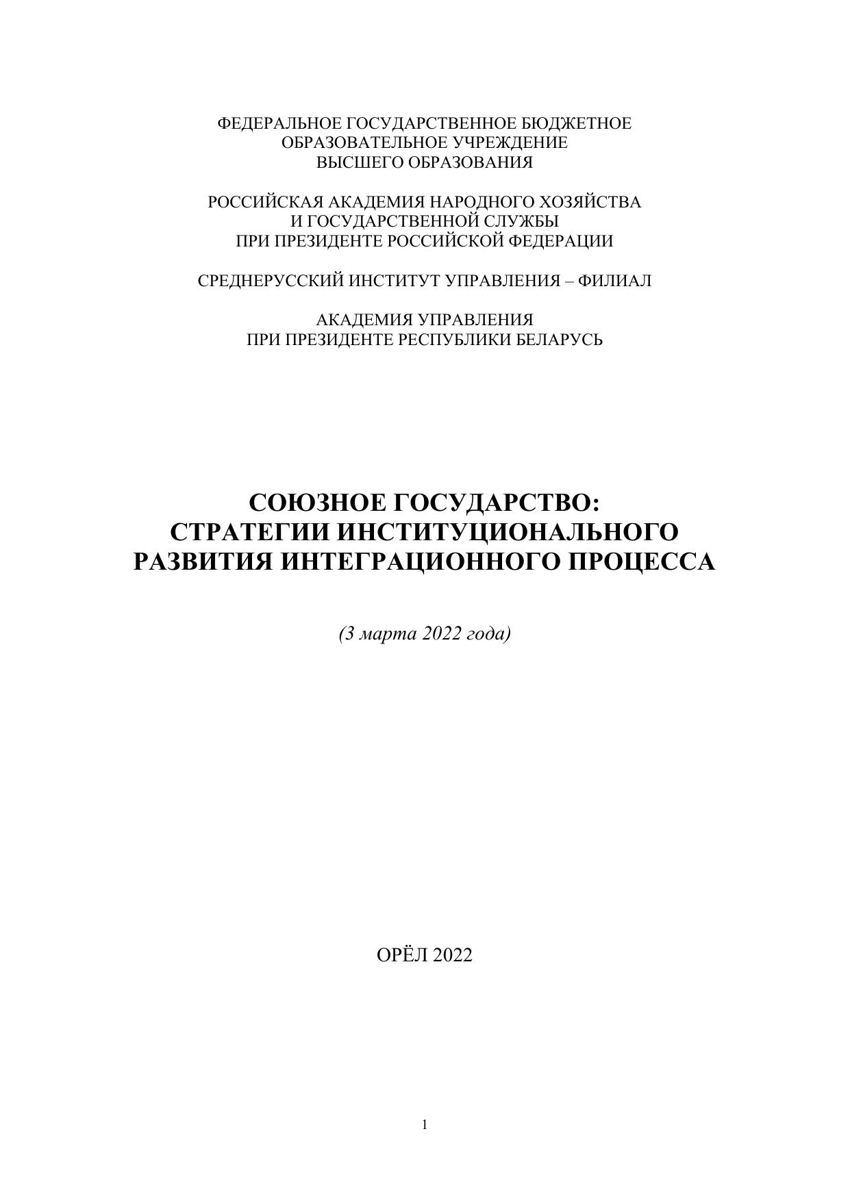 Сборник подготовлен по материалам выступлений участников международной научно-практической конференции «Союзное государство: стратегии институционального развития интеграционного процесса» (03 марта 2022 г.), организованной Среднерусским институтом управления – филиалом РАНХиГС совместно с Академией государственного управления при Президенте Республики Беларусь. В сборнике представлены результаты исследований профессорскопреподавательского состава, аспирантов и студентов, посвященных особенностям государственной политики и интеграционных процессов в рамках Союзного государства. Материалы публикуются в авторской редакции.