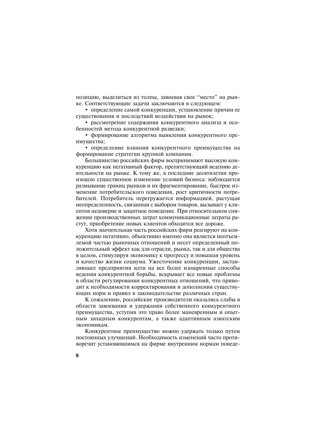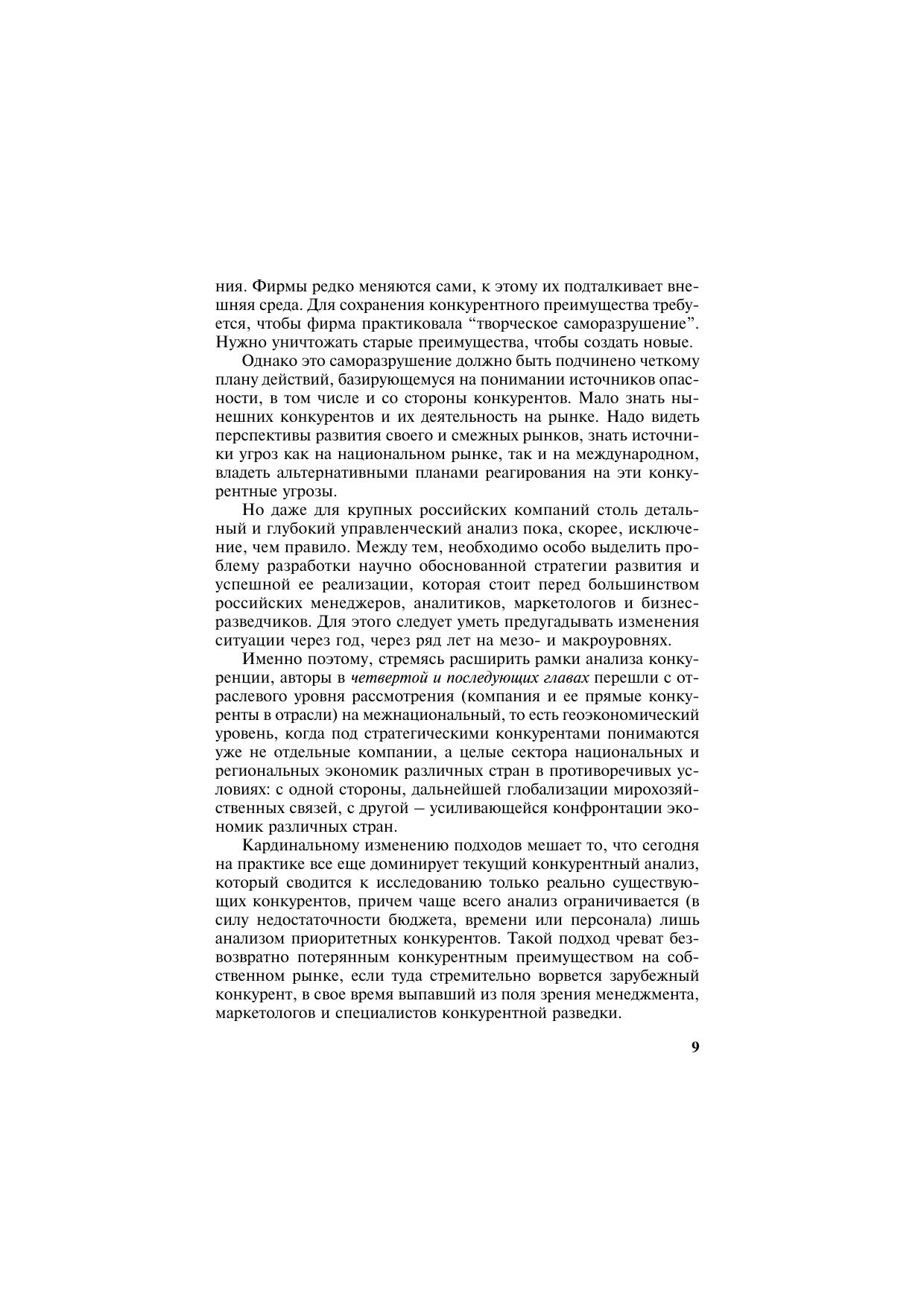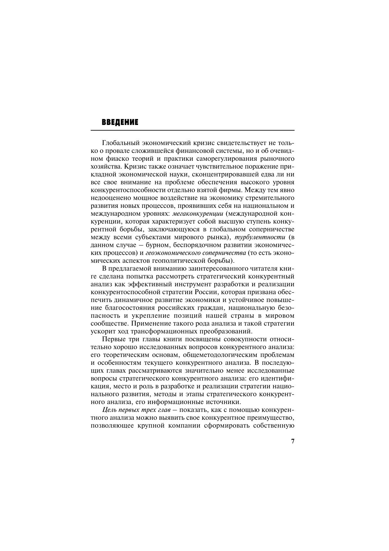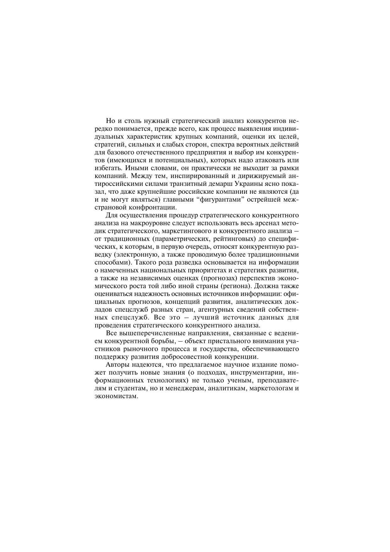 Раскрываются важнейшие аспекты функционирования экономики страны в конкурентной среде и вопросы формирования корпоративных конкурентных стратегий, базирующихся на всестороннем исследовании и оценке индивидуальных характеристик конкурентов. Рассматриваются вопросы генезиса и дальнейшей трансформации конкурентного анализа (как текущего, так и стратегического) на различных этапах развития рыночной экономики в условиях многополярного мира. Выявлены место, роль, этапы, методы конкурентного анализа, его информационные источники. Особое внимание уделено конкурентной разведке и разработкам спецслужб. Для научных и практических работников, занимающихся вопросами стратегического конкурентного анализа в компаниях и внешнеэкономических ведомствах, а также преподавателей, студентов и аспирантов вузов.