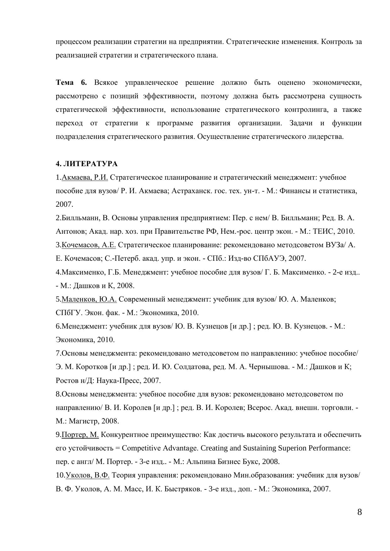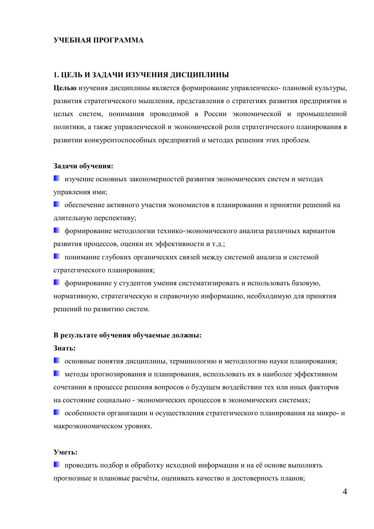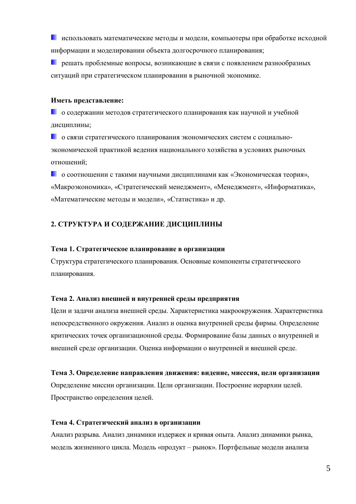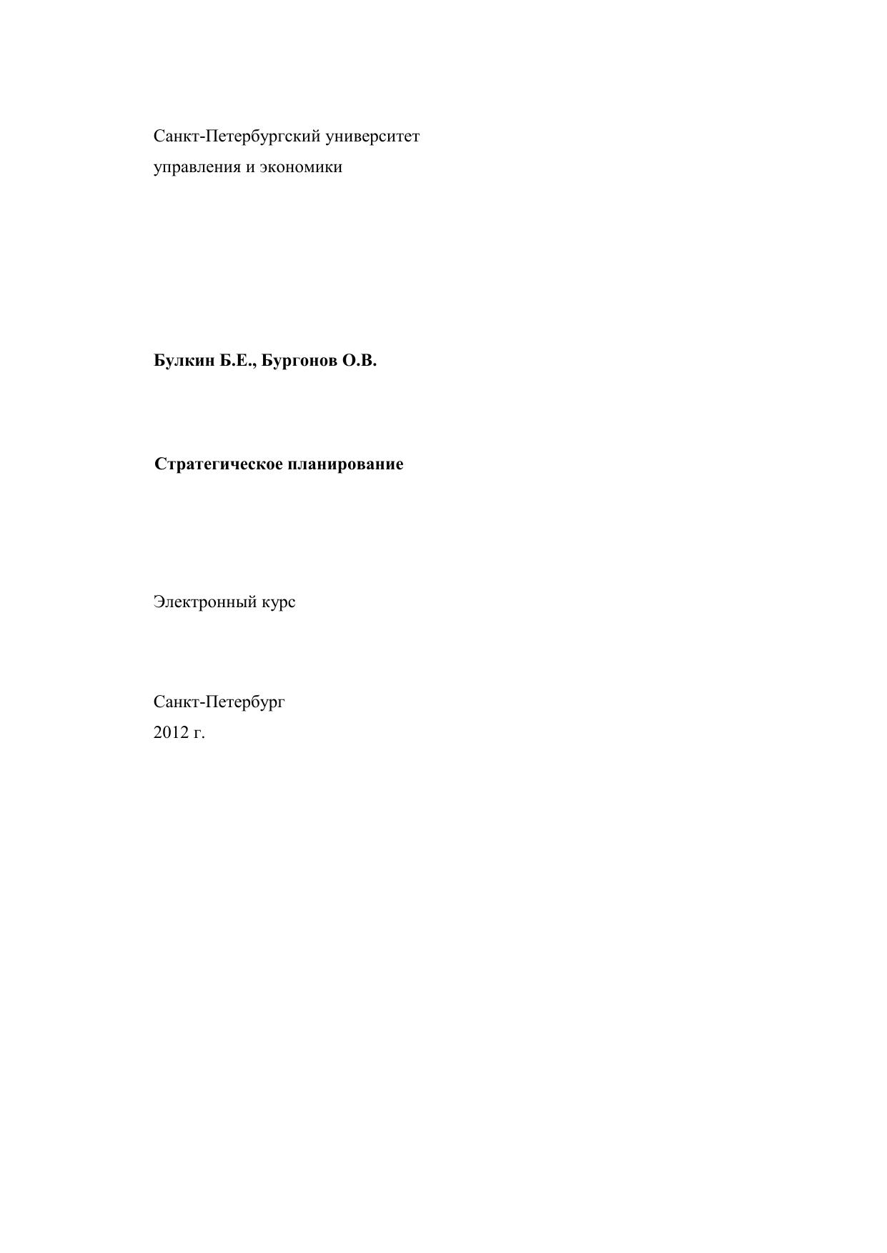 Стратегическое планирование зарекомендовало себя как один из самых действенных инструментов современного менеджмента. Стратегическое планирование помогает поддерживать необходимые экономические пропорции, обеспечивая согласованную целенаправленность функционирования всех звеньев хозяйственной системы общества. Стратегическое планирование становится все более актуальным для российских предприятий, которые поставлены в условия жесткой конкуренции как между собой, так и с иностранными корпорациями. Стратегическое планирование обеспечивает основу для всех управленческих решений, функций организации, мотивации и контроля, ориентированных на выработку стратегических планов. Электронный курс «Стратегическое планирование» представляет собой изложение вопросов организации стратегического планирования на предприятии, содержание и методы стратегического планирования, подходы к разработке стратегических альтернатив и выбора стратегии, изложение понятийного аппарата и базовых положений учебной дисциплины, тексты лекций, включает учебную программу дисциплины, контрольные вопросы и тесты для промежуточного и итогового контроля, глоссарий. Электронный курс адресован студентам, обучающимся по экономическим специальностям.