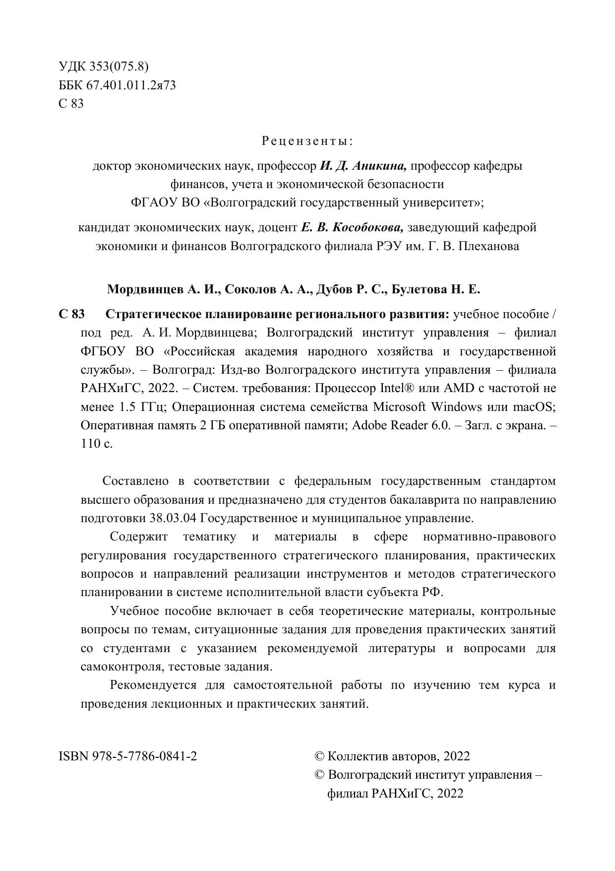 Составлено в соответствии с федеральным государственным стандартом высшего образования и предназначено для студентов бакалаврита по направлению подготовки 38.03.04 Государственное и муниципальное управление. Содержит тематику и материалы в сфере нормативно-правового регулирования государственного стратегического планирования, практических вопросов и направлений реализации инструментов и методов стратегического планировании в системе исполнительной власти субъекта РФ. Учебное пособие включает в себя теоретические материалы, контрольные вопросы по темам, ситуационные задания для проведения практических занятий со студентами с указанием рекомендуемой литературы и вопросами для самоконтроля, тестовые задания. Рекомендуется для самостоятельной работы по изучению тем курса и проведения лекционных и практических занятий.