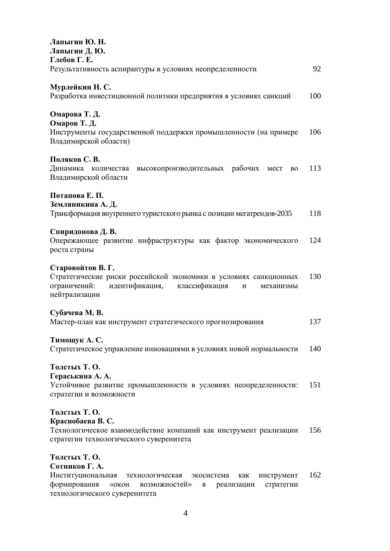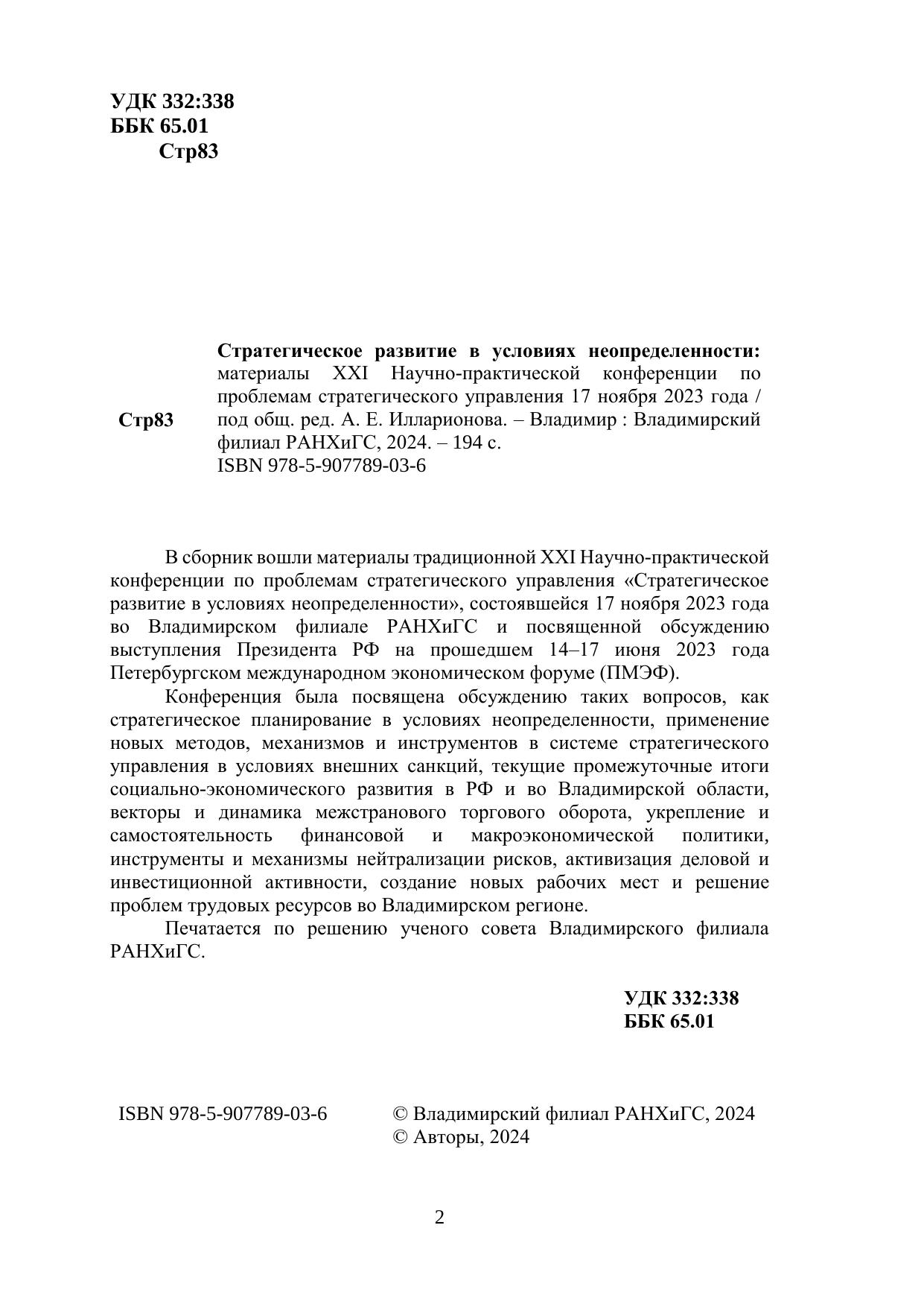 В сборник вошли материалы традиционной XXI Научно-практической конференции по проблемам стратегического управления «Стратегическое развитие в условиях неопределенности», состоявшейся 17 ноября 2023 года во Владимирском филиале РАНХиГС и посвященной обсуждению выступления Президента РФ на прошедшем 14–17 июня 2023 года Петербургском международном экономическом форуме (ПМЭФ). Конференция была посвящена обсуждению таких вопросов, как стратегическое планирование в условиях неопределенности, применение новых методов, механизмов и инструментов в системе стратегического управления в условиях внешних санкций, текущие промежуточные итоги социально-экономического развития в РФ и во Владимирской области, векторы и динамика межстранового торгового оборота, укрепление и самостоятельность финансовой и макроэкономической политики, инструменты и механизмы нейтрализации рисков, активизация деловой и инвестиционной активности, создание новых рабочих мест и решение проблем трудовых ресурсов во Владимирском регионе. Печатается по решению ученого совета Владимирского филиала РАНХиГС.